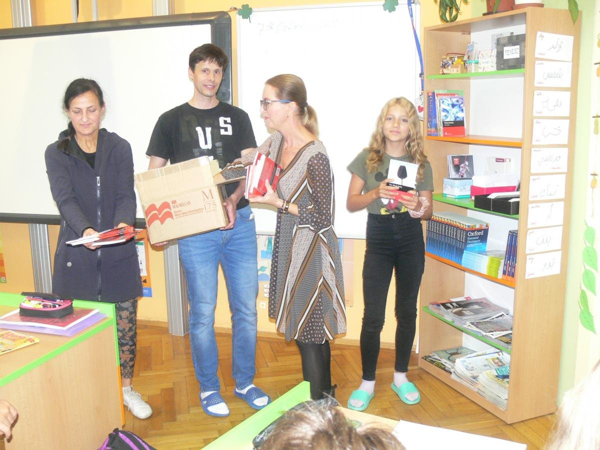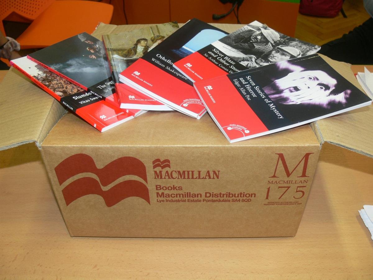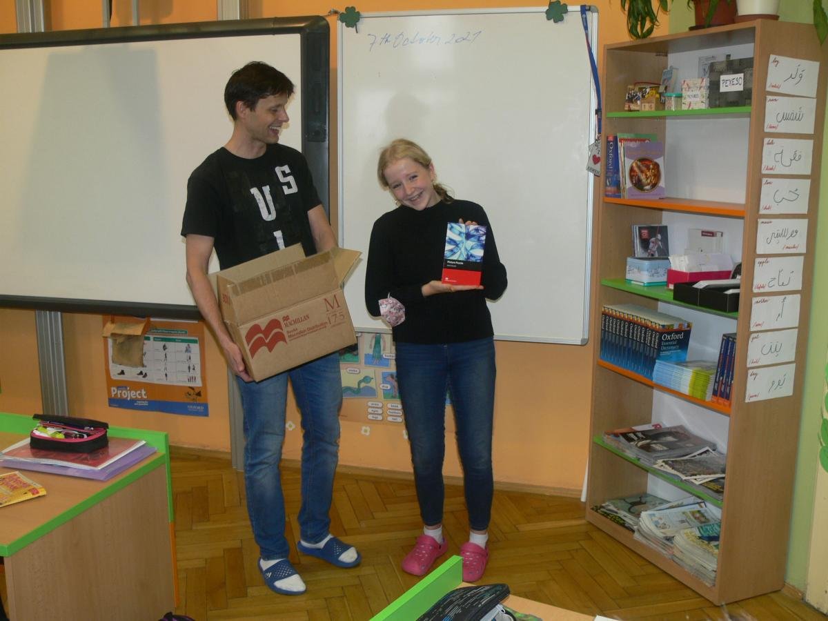 V rámci projektu na podporu rozvoje čtenářských dovedností v anglickém jazyce se nám podařilo zvítězit v projektu, který každoročně připravuje nakladatelství Macmillan a do kterého se mohou zapojit školy z celé České republiky. V posledním ročníku této soutěže se podařilo zvítězit právě naší škole, a proto jsme mohli převzít z rukou paní Evy Kachyňové, zástupkyně nakladatelství Macmillan, krásnou cenu - 100 knížek v angličtině. Knihy psané anglicky jsou různých úrovní od začátečníků až po pokročilé. Děti knížky s radostí převzaly a slavnostně zařadily do naší anglické knihovničky, která tak pomalu nabývá na objemu a nabízí všem žákům možnost rozvíjet své čtenářské dovednosti, a hlavně smysluplně využít volný čas o přestávkách. Přejeme dětem hezké počtení! Keep reading!