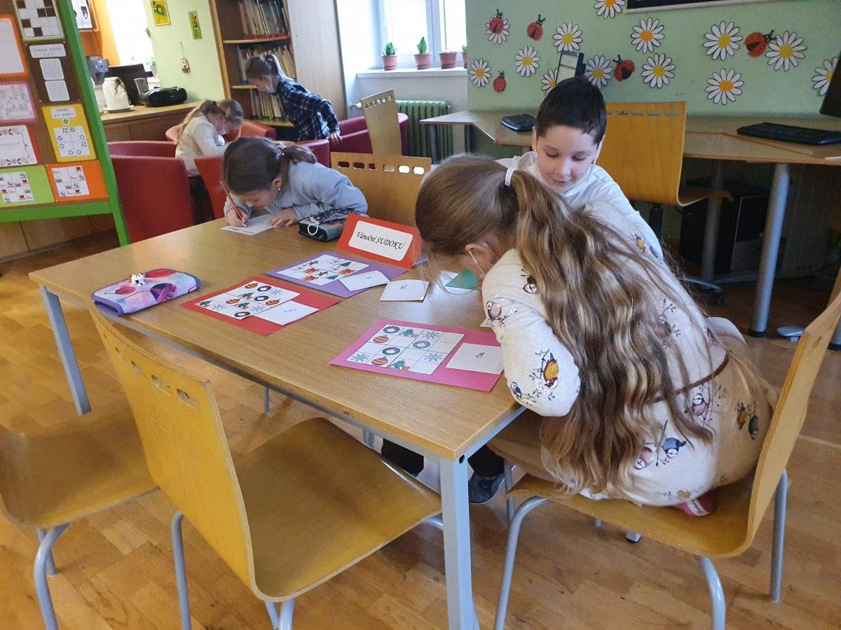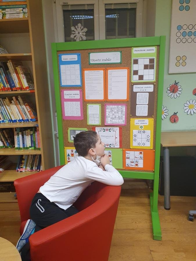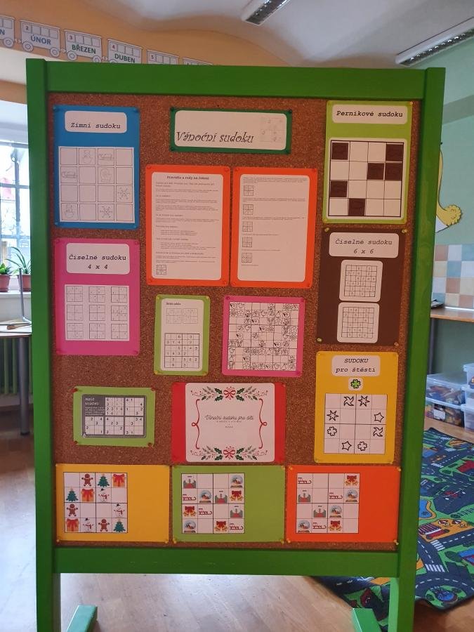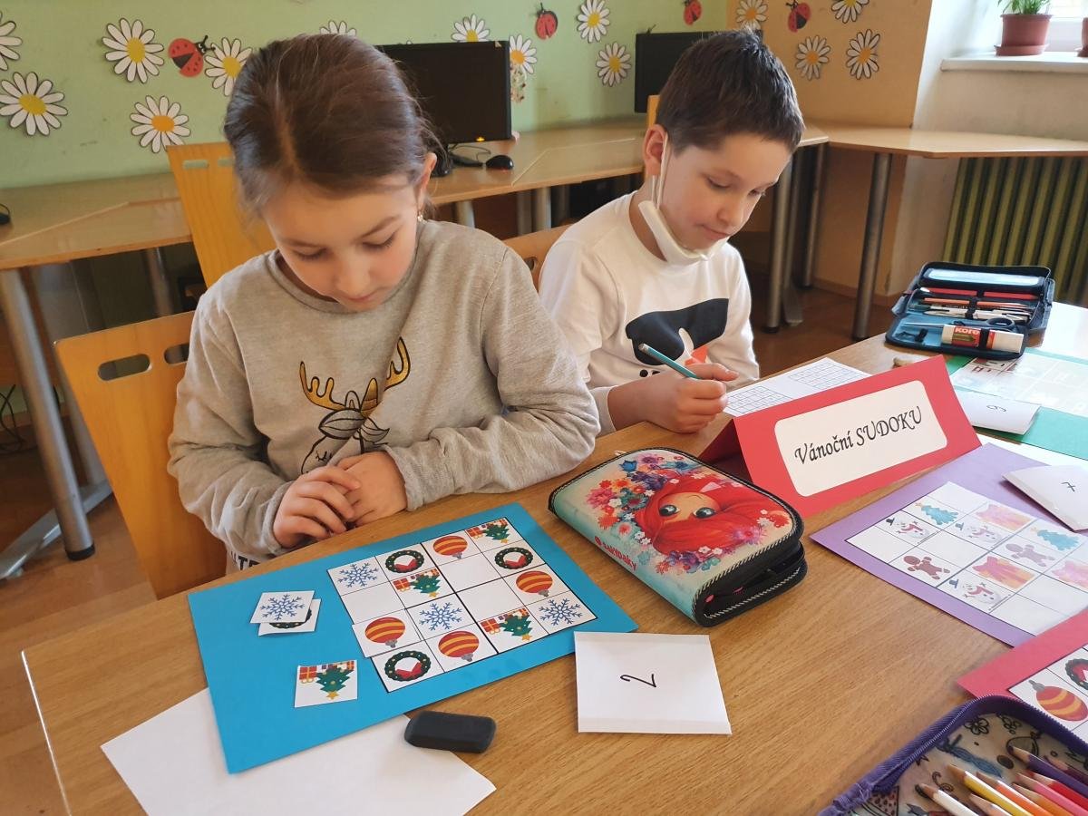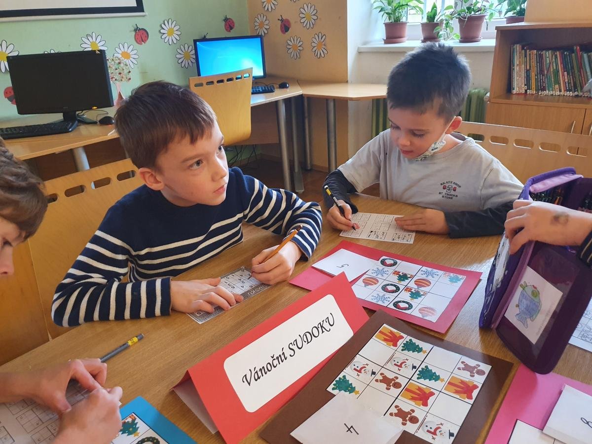 V předvánočním čase jsme ve školní družině opět uspořádali zábavné odpoledne v luštění sudoku. Začali jsem jednoduchými magickými čtverci s obrázky a postupně přecházeli k náročnějším. Základy se naučily i ty nejmenší děti, starší si troufly i na těžší. Dokonce jsme společně vyzkoušeli i ďábelské sudoku. Využili jsme také naše počítačové centrum v herně a zahráli si sudoku on-line. Děti odcházely spokojené a bohatší o další zkušenosti v této smysluplné hře.