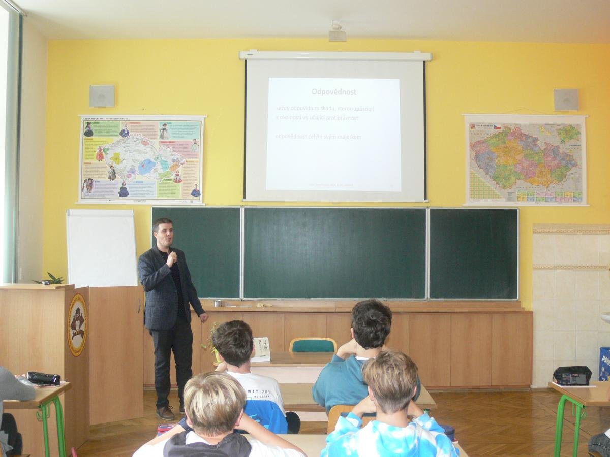 V úterý 4. října 2022 navštívil naše deváťáky v hodině Výchovy k občanství právník JUDr. David Pytela, MBA, LL.M., který si pro děti připravil besedu, během níž nastínil žákům alespoň základní právní pojmy a na několika situacích demonstroval, jak je znalost právních předpisů pro každého občana důležitá v každodenním životě.