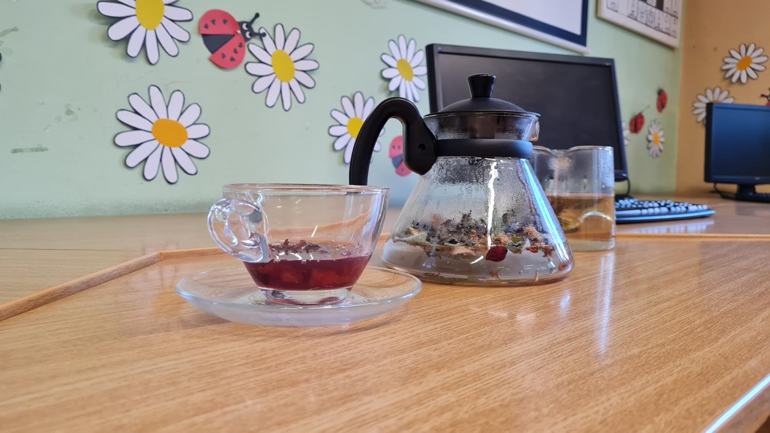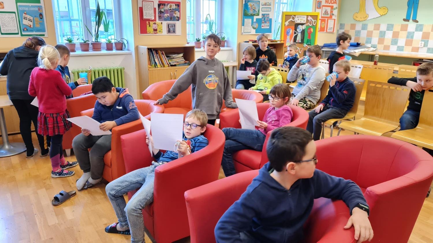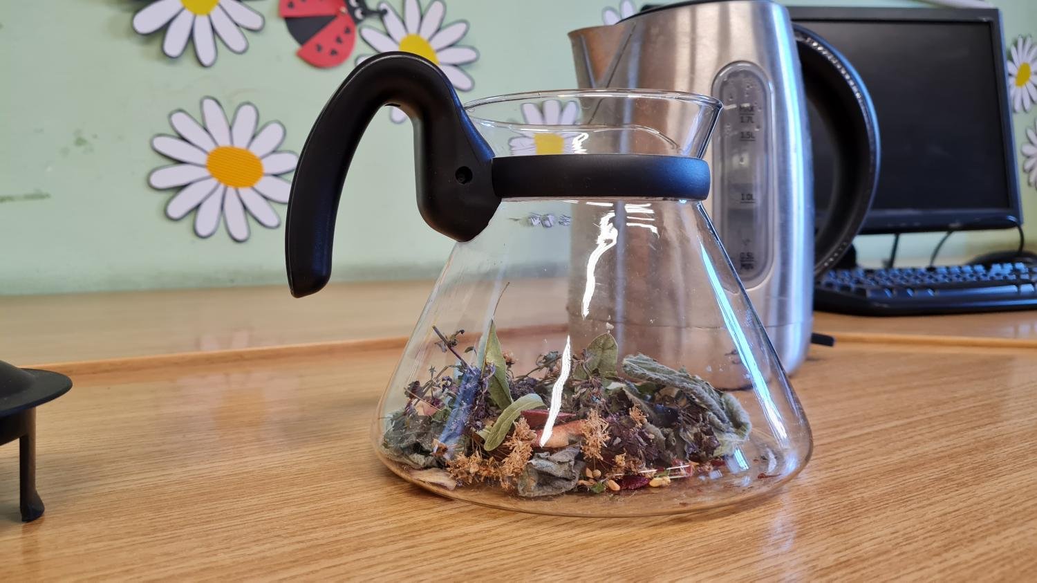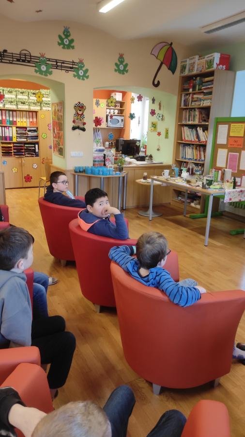 Ovšem hlavní hřeb týdne se uskutečnil ve středu, kdy se děti sešly v herně, která se proměnila v čajovnu. Paní vychovatelky přivítaly děti krásnou vůní čerstvě uvařených čajů. Proběhla zde beseda o čaji a ochutnávka různých druhů čajů – zelený, bílý, ovocný, černý s mlékem, sypaný, pečený kvetoucí či z čerstvých nebo sušených bylinek…