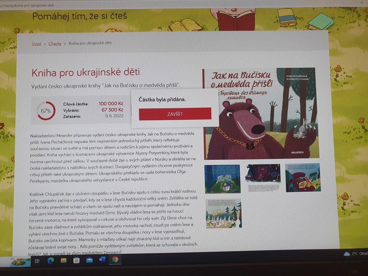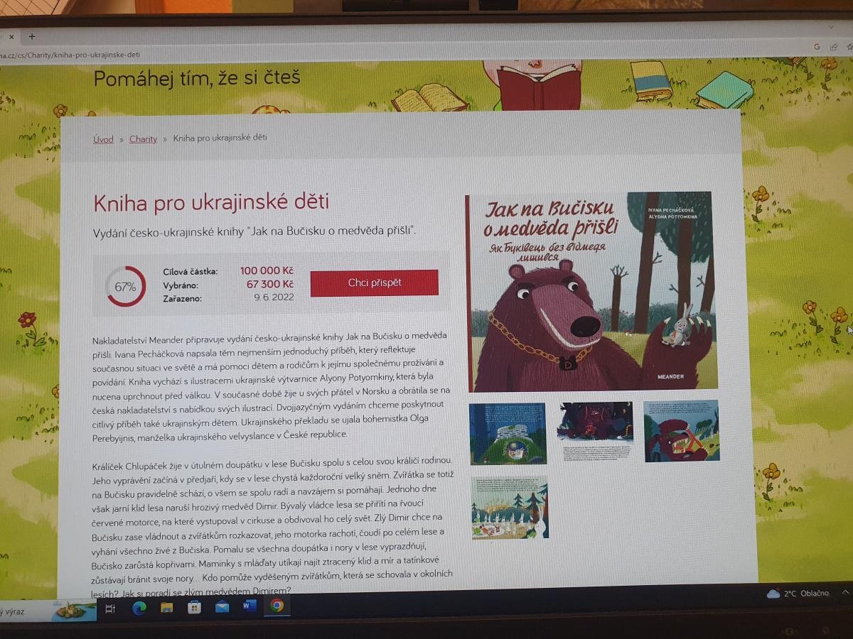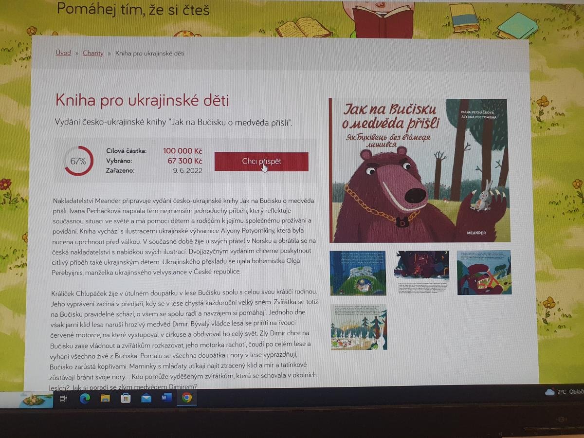 Tentokrát jsme vybrali projekt Kniha pro ukrajinské děti a máme radost, že jsme mohli přispět k vydání dvojjazyčné česko-ukrajinské knihy Jak na Bučisku o medvěda přišli. Aby si nejen naše děti z Ukrajiny, ale i naše děti mohly tuto knihu přečíst s porozuměním.
