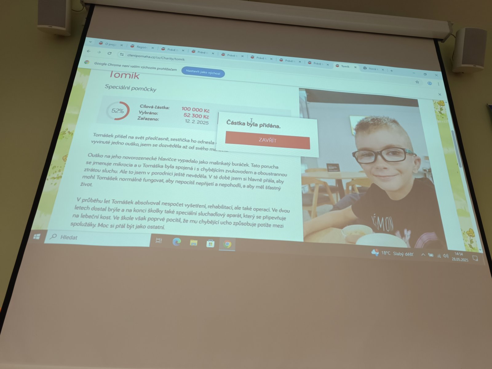 I tentokrát se nám dařilo a společně jsme se rozhodli, že pomůžeme chlapci Tomíkovi, který od narození trpí ztrátou sluchu a přispěli jsme mu na speciální pomůcky, které potřebuje po operaci a přejeme mu uzdravení.