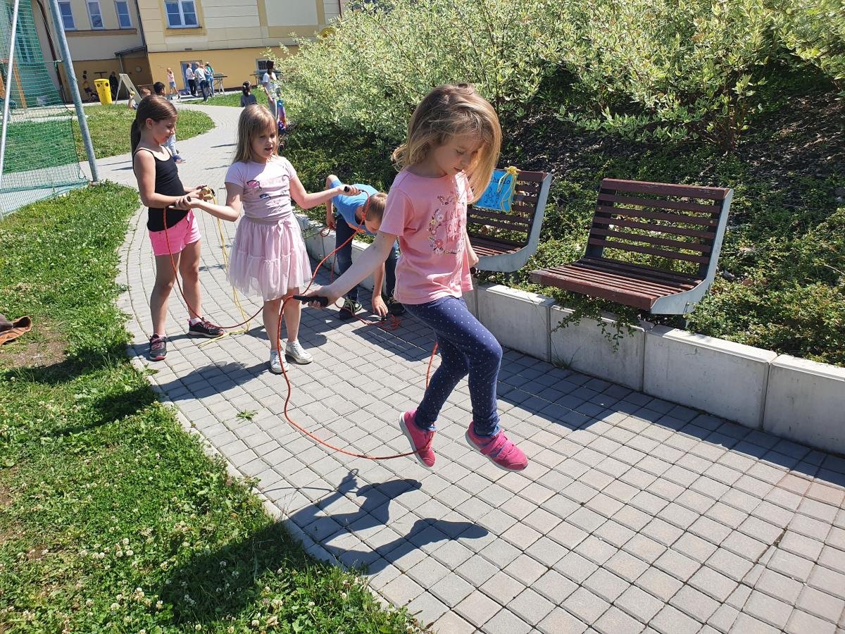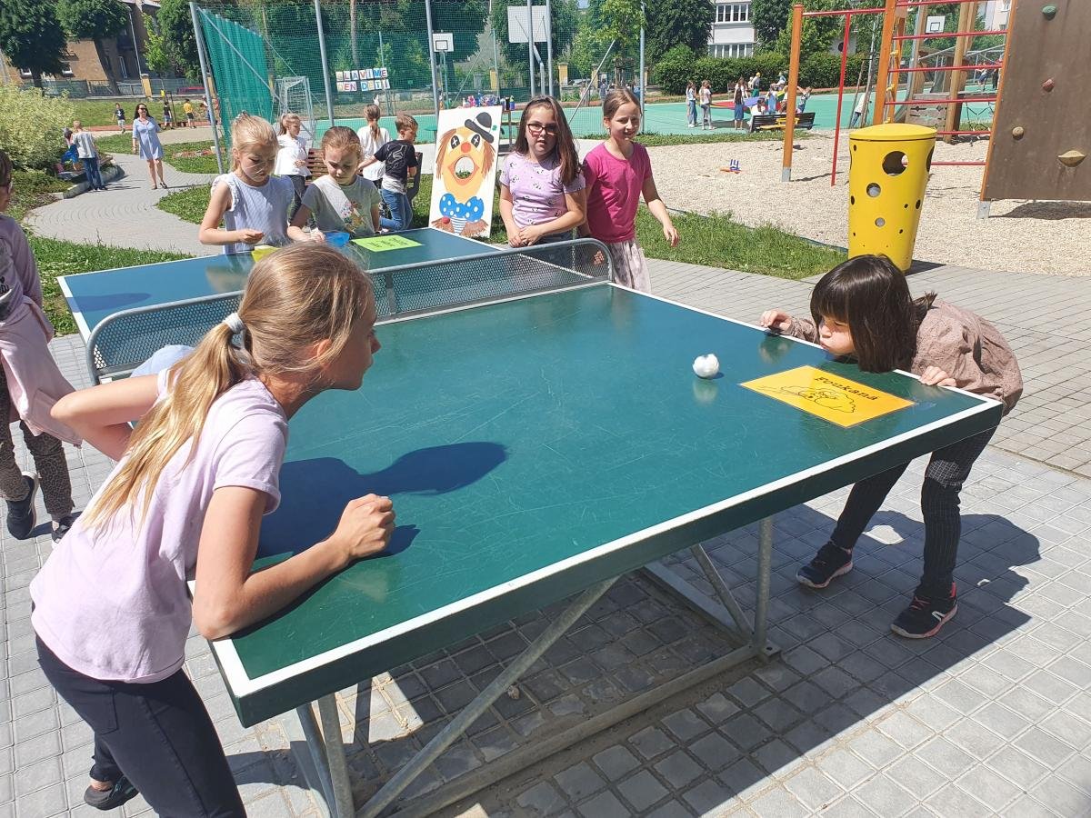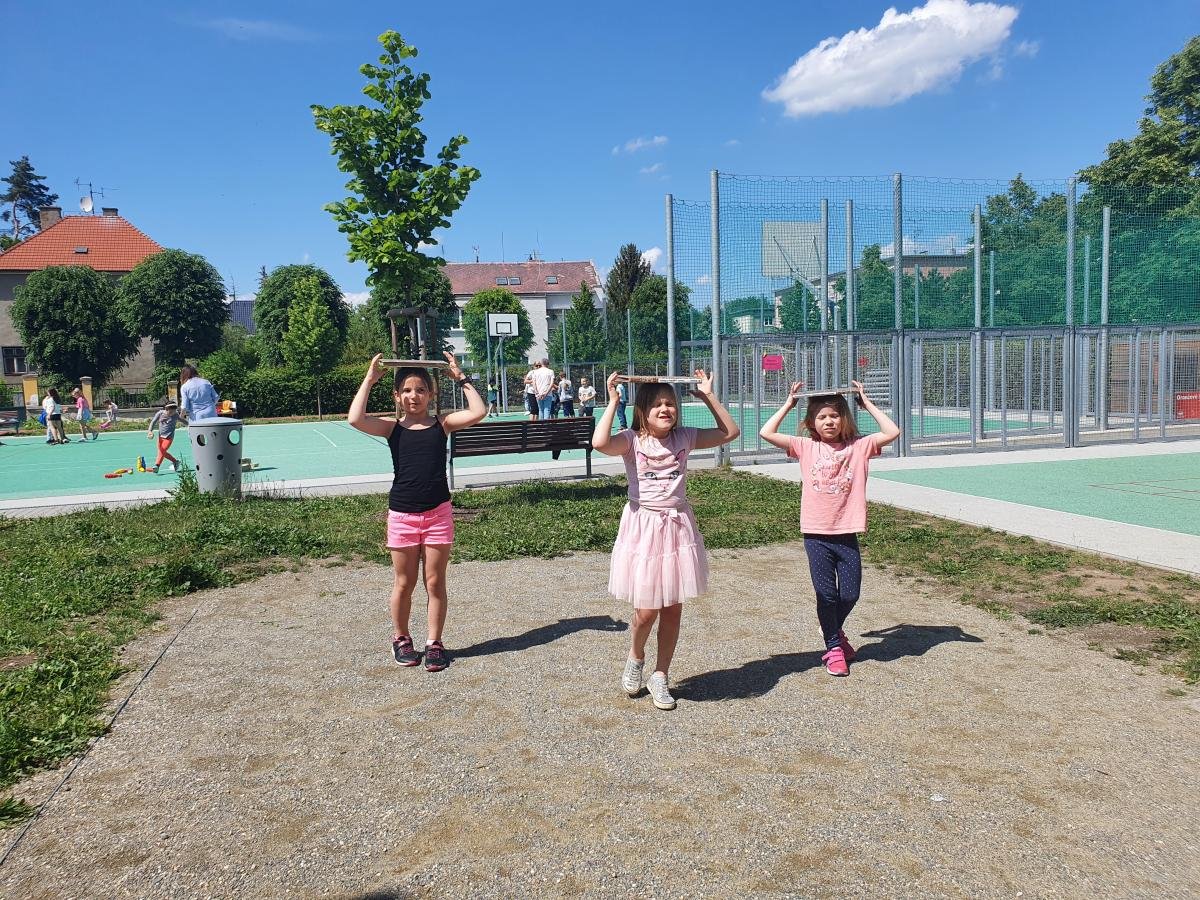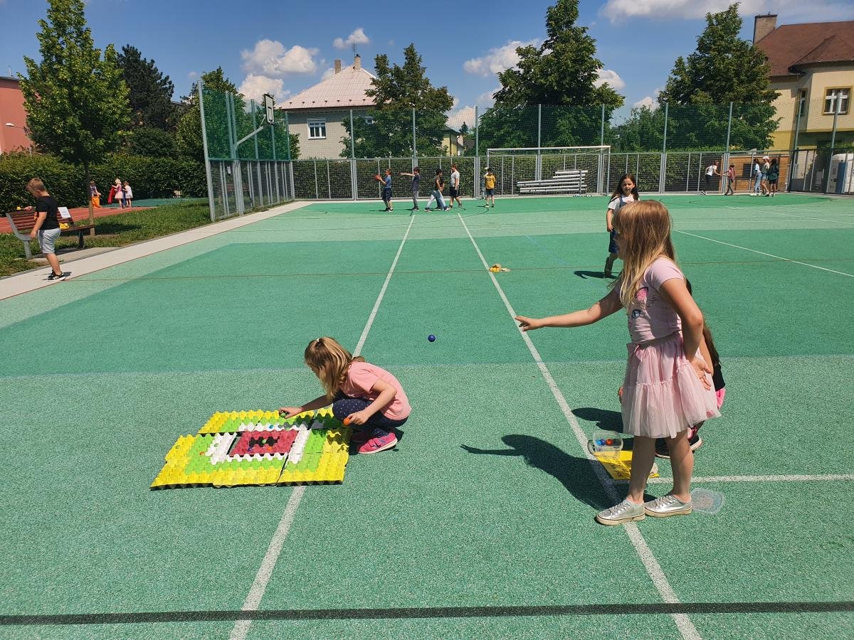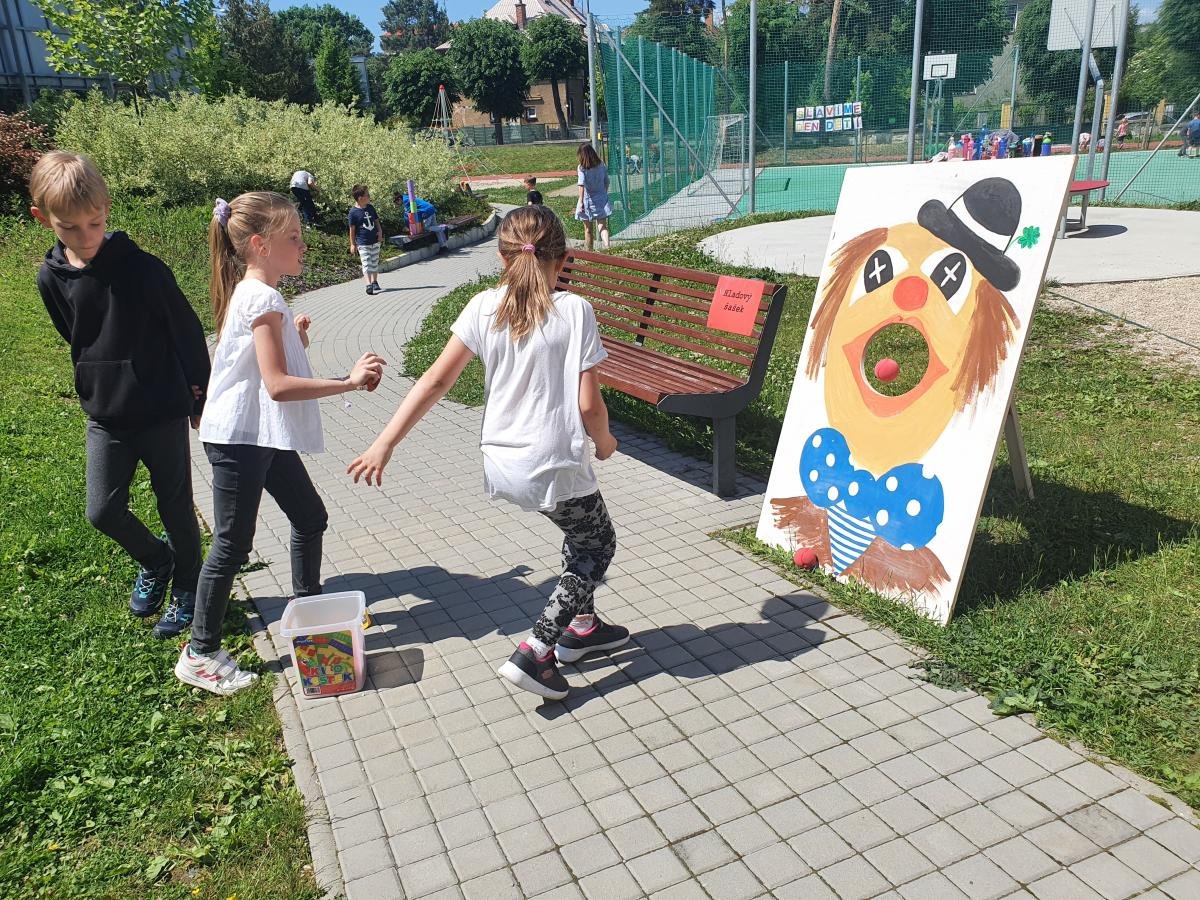 Den dětí je zažitým dnem plným her, soutěží a sladkostí. Nejinak tomu bylo i v naší školní družině. Paní vychovatelky připravily na školním hřišti 25 zábavných stanovišť, děti nevěděly, kam dřív. Na kohoutí zápasy, k hladovému šaškovi, k neposlušným tkaničkám, na slalom v gumákách nebo s knihou na hlavě, zahrát si na slepou bábu, skákat přes švihadlo, porazit kuželky nebo plechovky, trefovat se do koše, točit kruhem, jít na foukanou, do tunelu nebo k padáku…? Zábavné bylo všechno. Kdo byl unavený, mohl i na piknik.