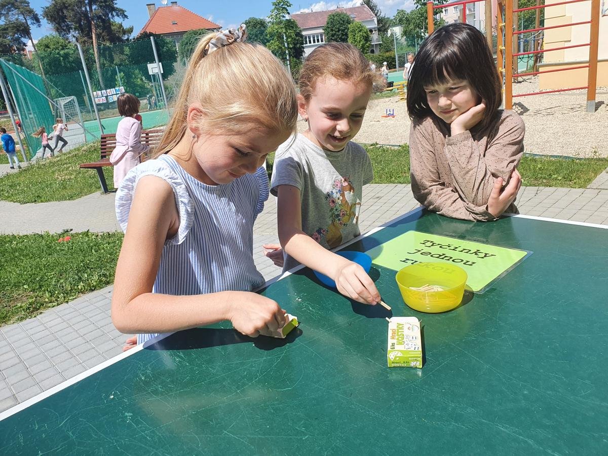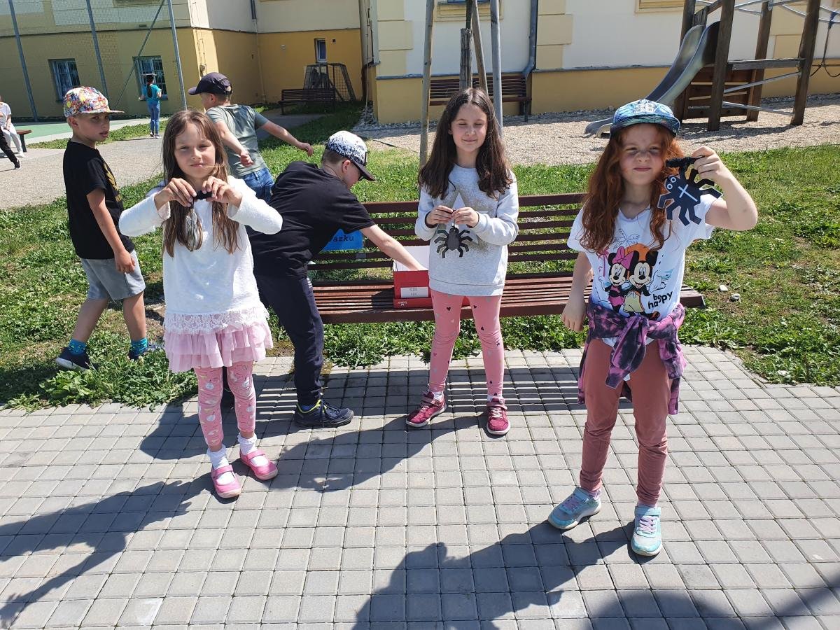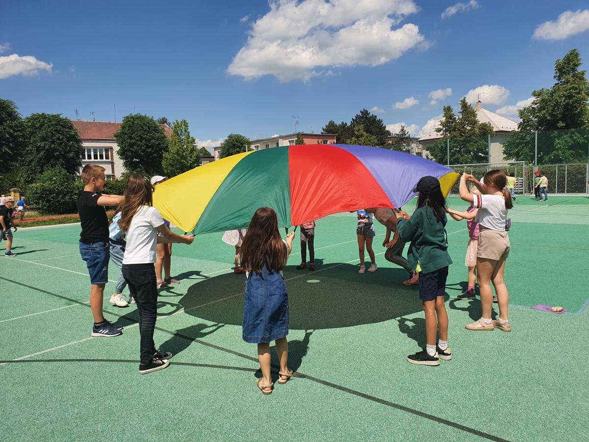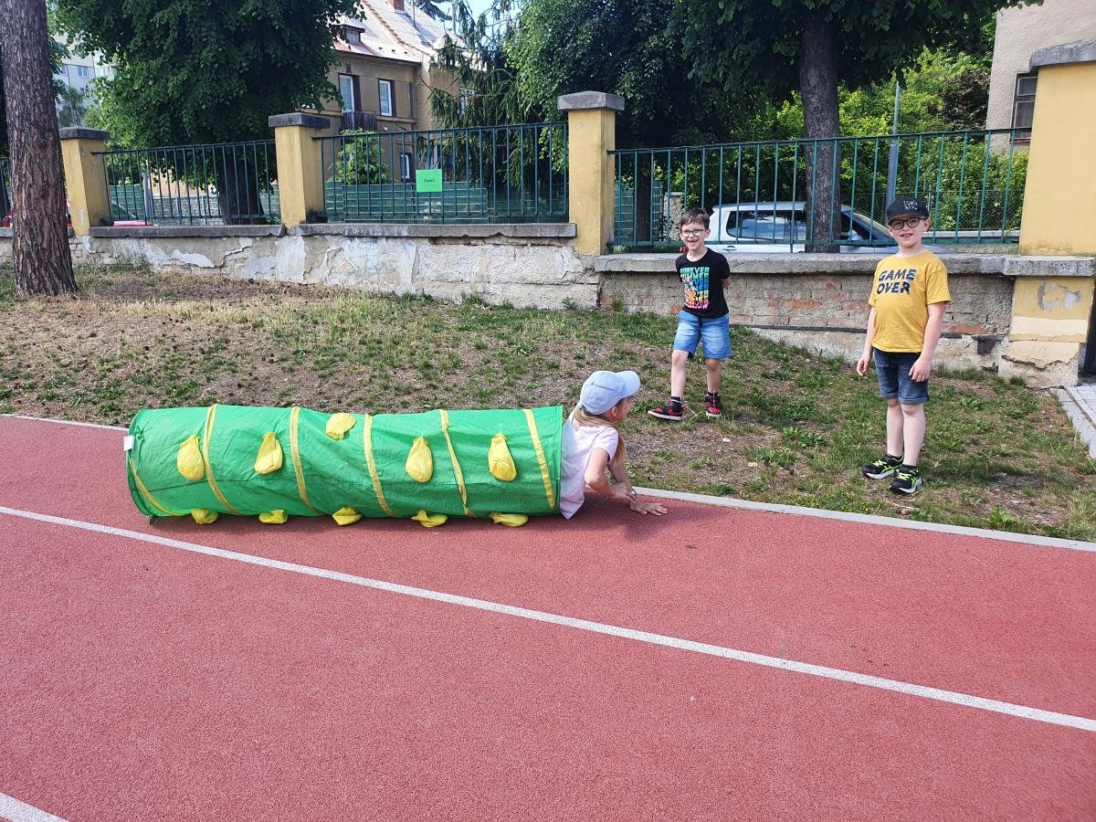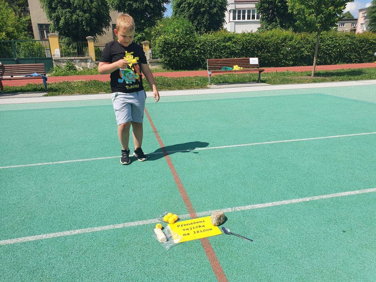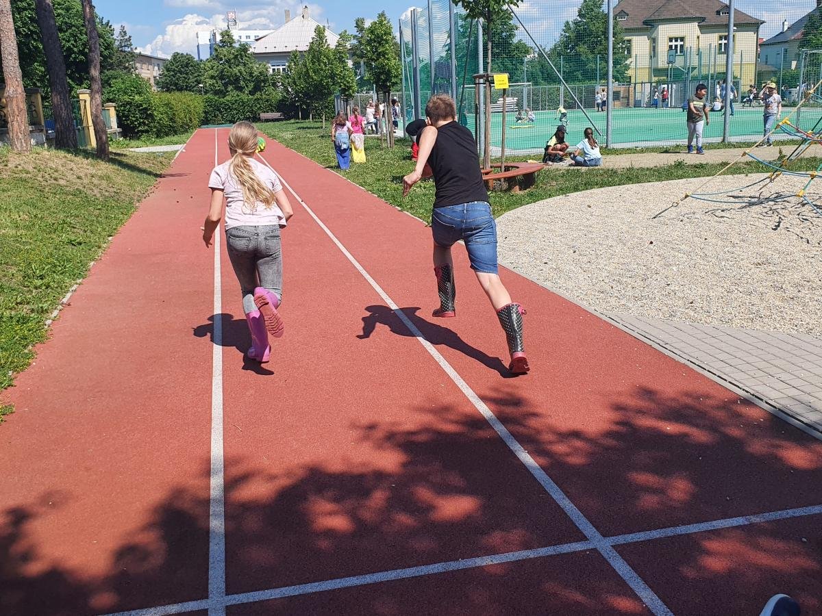 Den dětí je zažitým dnem plným her, soutěží a sladkostí. Nejinak tomu bylo i v naší školní družině. Paní vychovatelky připravily na školním hřišti 25 zábavných stanovišť, děti nevěděly, kam dřív. Na kohoutí zápasy, k hladovému šaškovi, k neposlušným tkaničkám, na slalom v gumákách nebo s knihou na hlavě, zahrát si na slepou bábu, skákat přes švihadlo, porazit kuželky nebo plechovky, trefovat se do koše, točit kruhem, jít na foukanou, do tunelu nebo k padáku…? Zábavné bylo všechno. Kdo byl unavený, mohl i na piknik.