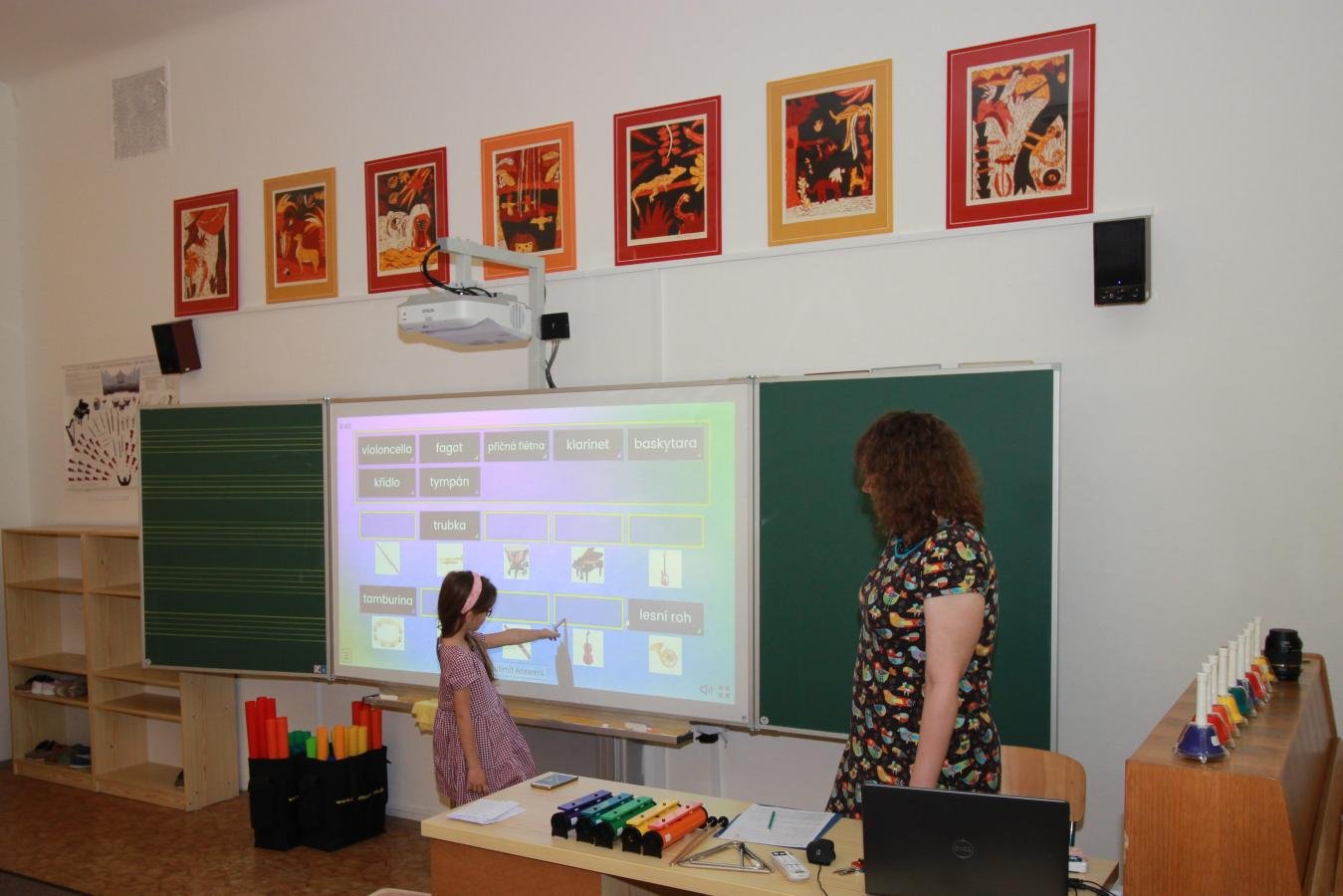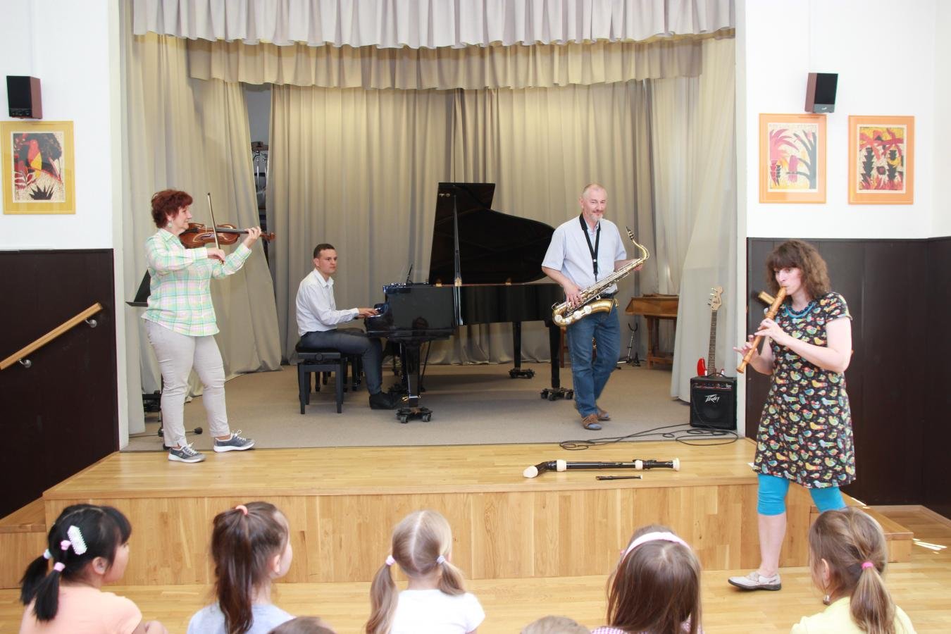 V učebně hudební nauky jsme uspěli ve znalostech hudebních nástrojů a složili jsme si vlastní rytmickou skladbu. V koncertním sále na nás čekali další učitelé s houslemi, flétnami, několika saxofony a pan ředitel u klavíru. Následoval koncert se zajímavým výkladem o jednotlivých nástrojích. Děti měly jmenovky se jmény, proto s nimi učitelé mohli snadno komunikovat, a děti se rády pochlubily co vše vědí o hudbě. Pak se ze všech stali muzikanti, když si vyzkoušeli mít na krku saxofon a zahrát skladbu na klavír společně s učiteli, kteří vytvořili pro děti doprovodný orchestr. Závěr koncertu byla společná skladba dětí a učitelů.