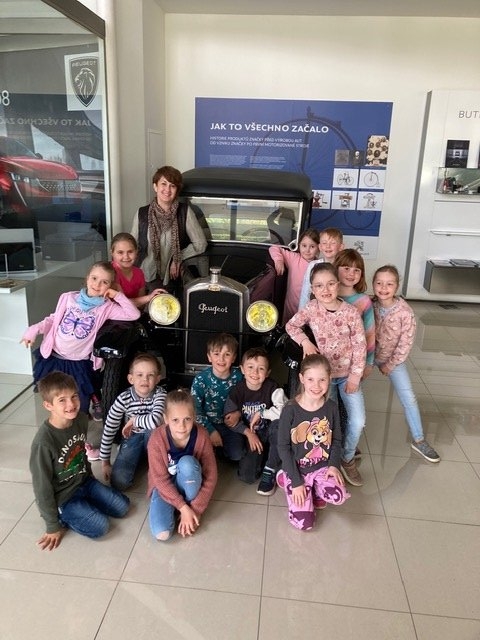 Zázemí firmy zaujalo svým exteriérem i interiérem. Děti se dozvěděly pár informací o historii rodu Peugeotů a naživo prošly celým areálem. Obdivovaly krásného veterána i skvoucí metalizovanou novinku letošního trhu. Neopomenuly nahlédnout i do prostor servisních dílen. Prohlídku ukončily návštěvou obytného přívěsu. Na závěr exkurze zodpověděly kvízové otázky, vymalovaly vybraný vůz, zamávaly rejnokovi v akváriu a s plnou náručí balonků a upomínkových předmětů se vydaly zpět do školy. Děkujeme panu Svákovi za krásný den.