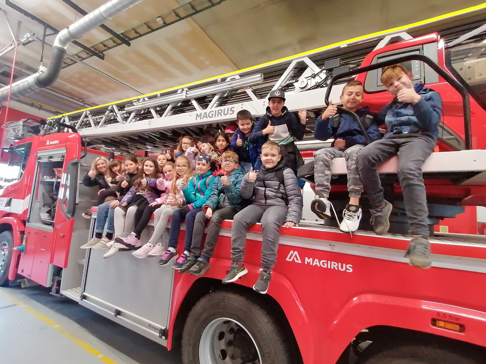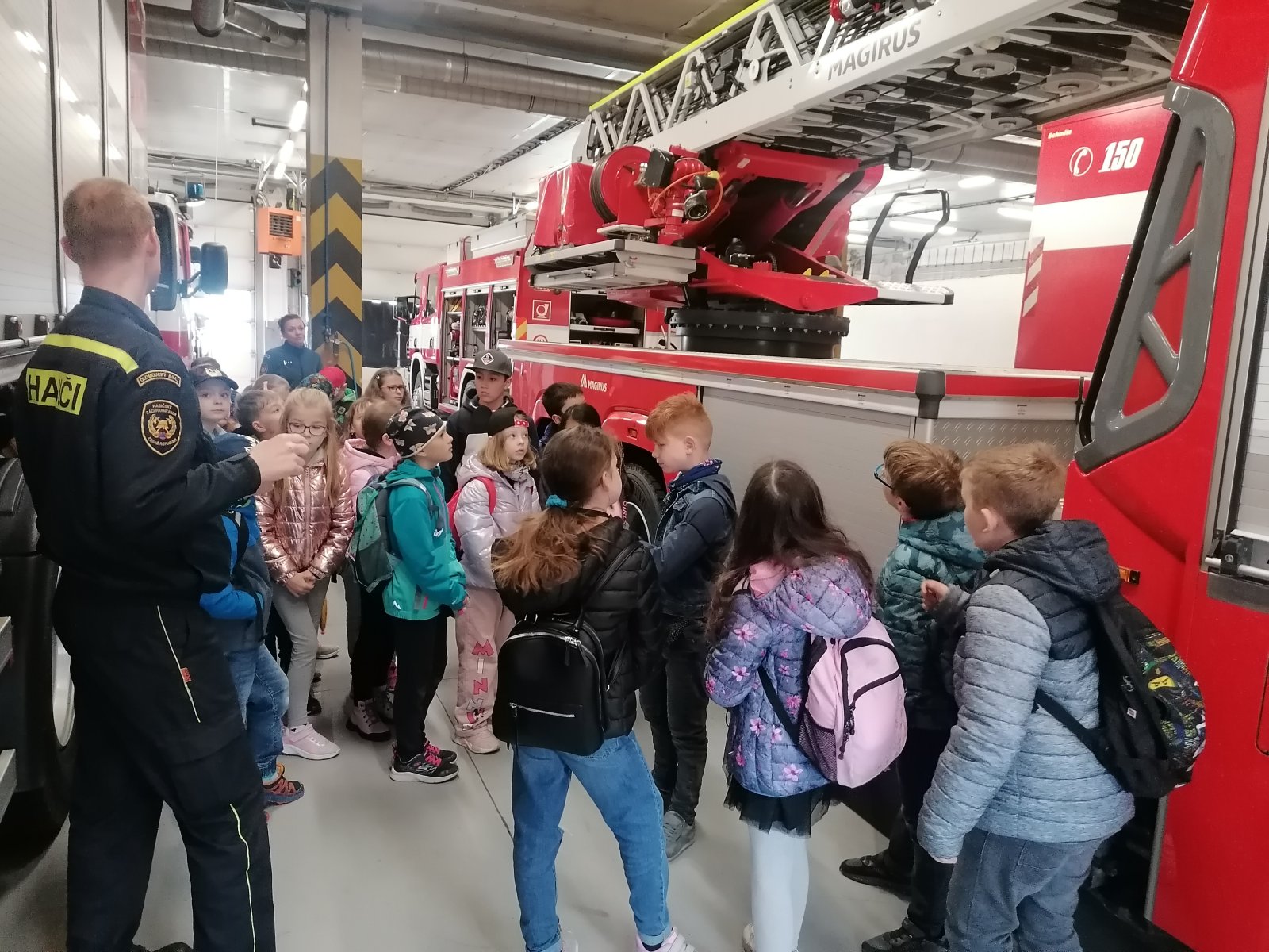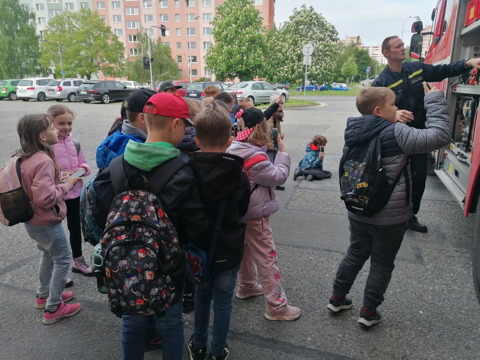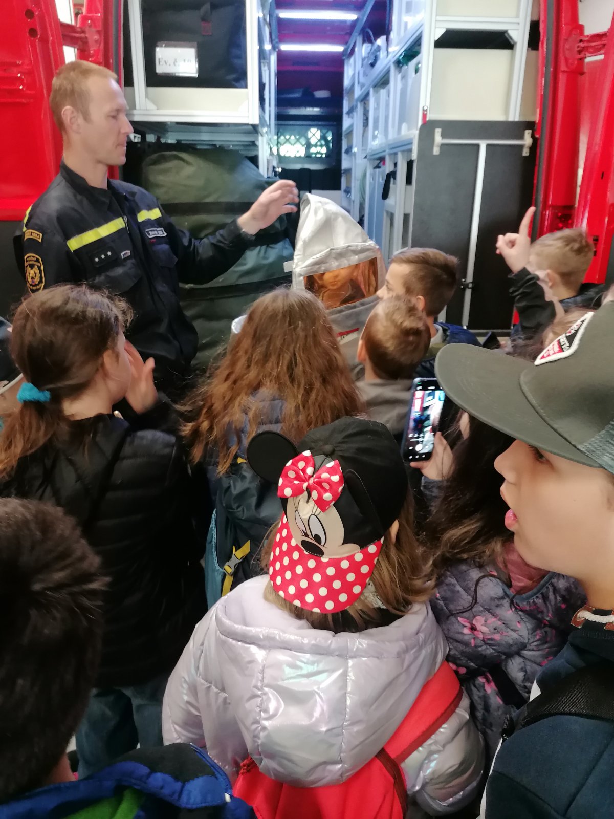 Po příchodu do HZS se nás ujal profesionální hasič, pan Zdeněk. Seznámil nás s celkovým chodem HZS, ukázal vybavení potřebné ke své profesi i všechny dopravní prostředky, kterých HZS využívá při svých zásazích. Na závěr si děti vyzkoušely přilbu, ochranný oblek a společně jsme se vyfotili na korbě hasičského auta.