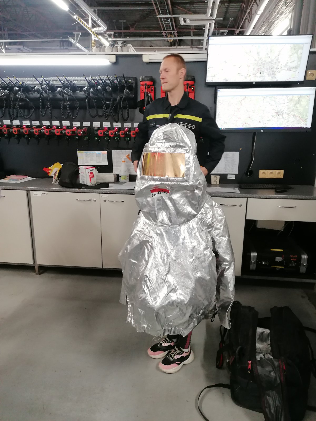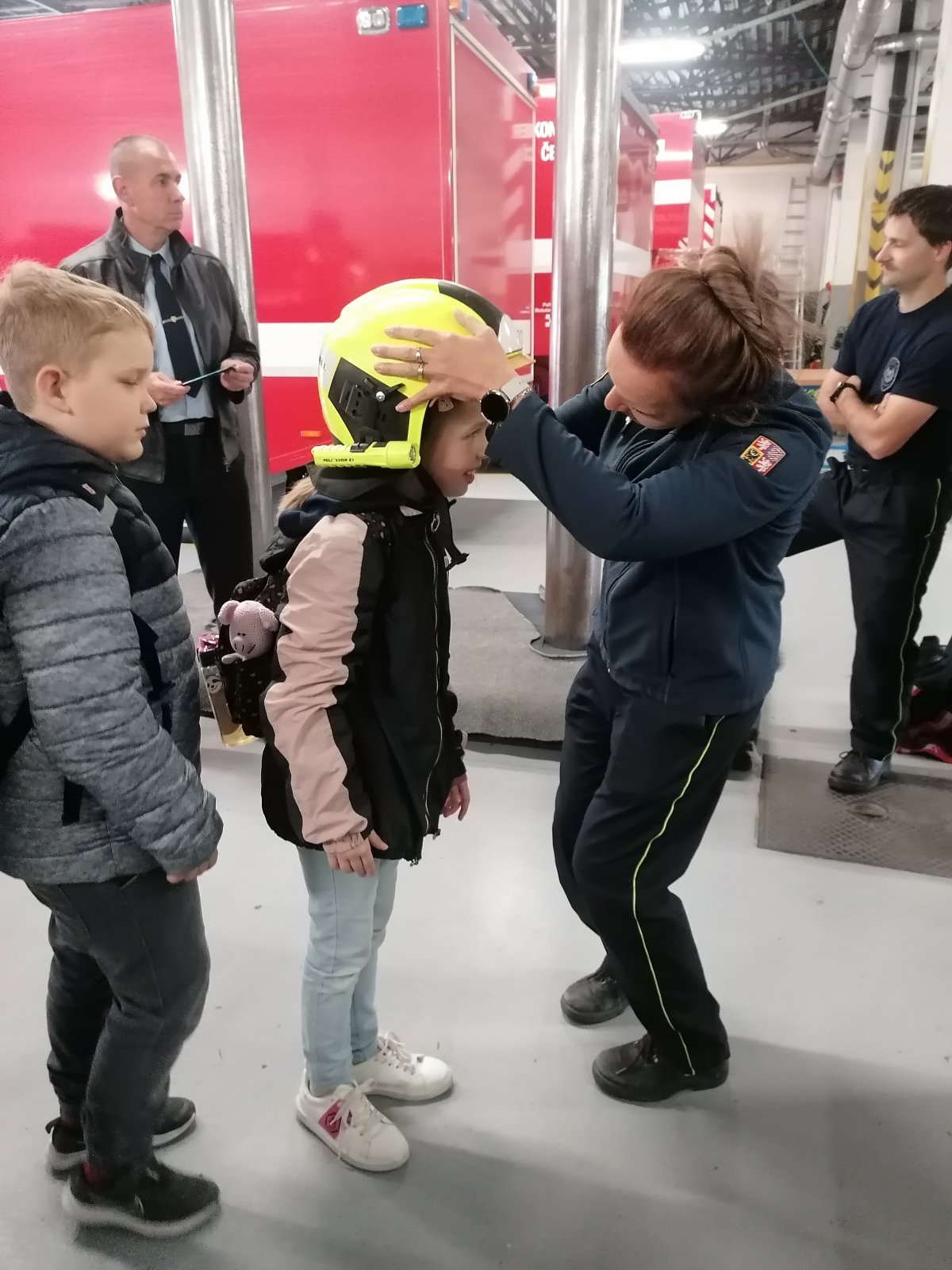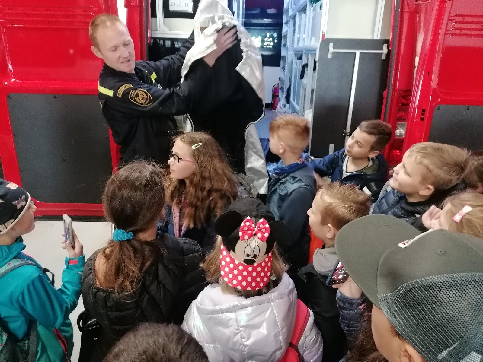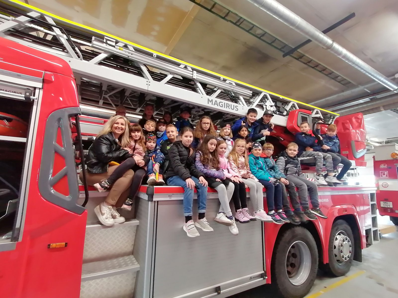 Po příchodu do HZS se nás ujal profesionální hasič, pan Zdeněk. Seznámil nás s celkovým chodem HZS, ukázal vybavení potřebné ke své profesi i všechny dopravní prostředky, kterých HZS využívá při svých zásazích. Na závěr si děti vyzkoušely přilbu, ochranný oblek a společně jsme se vyfotili na korbě hasičského auta.