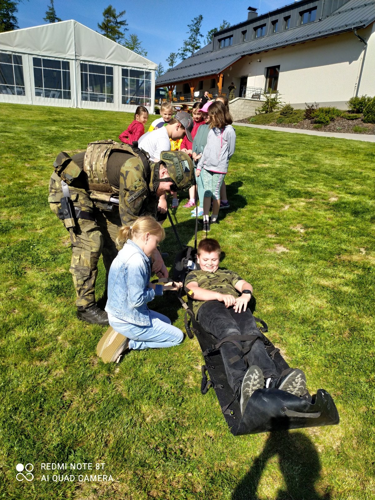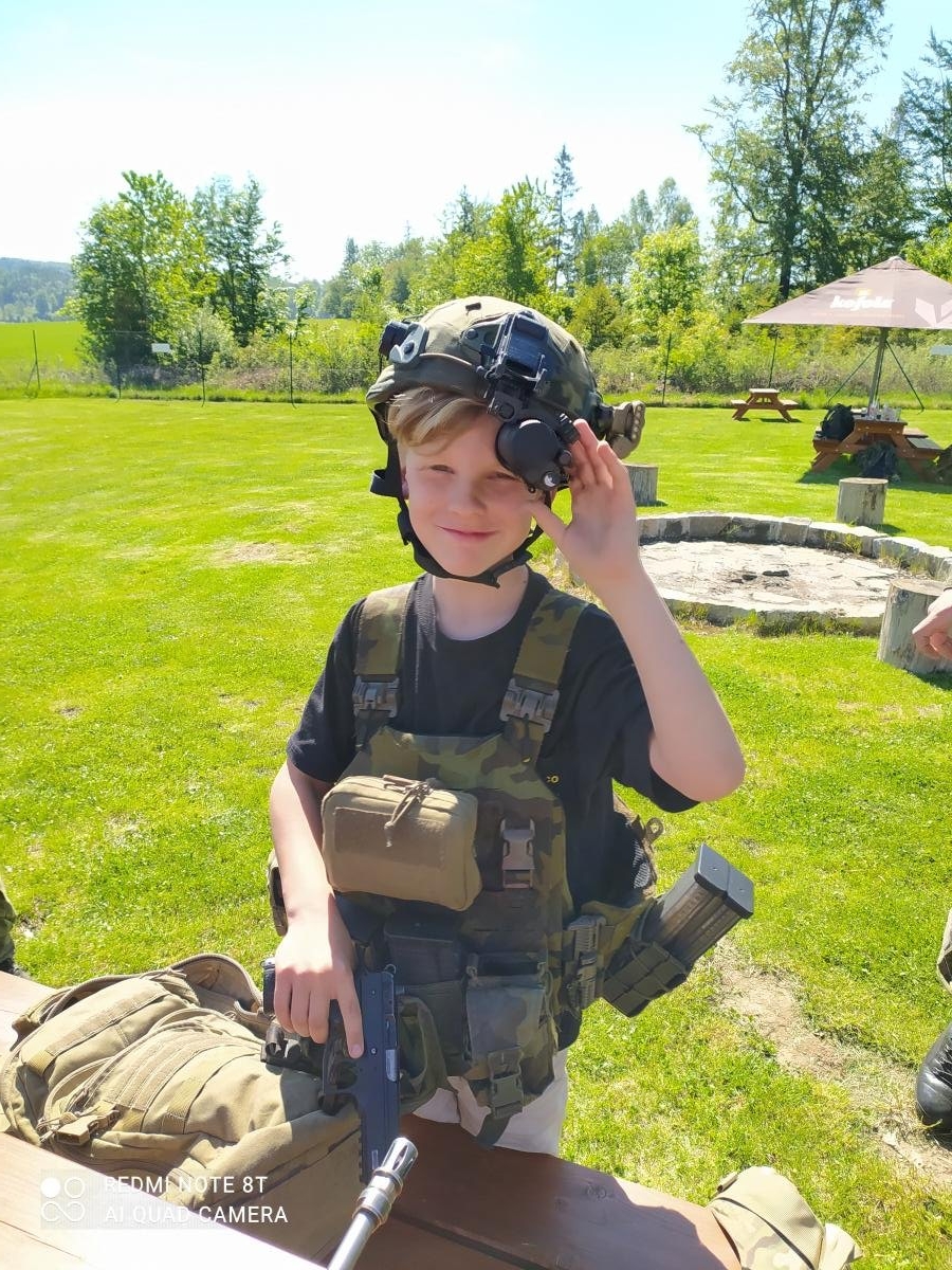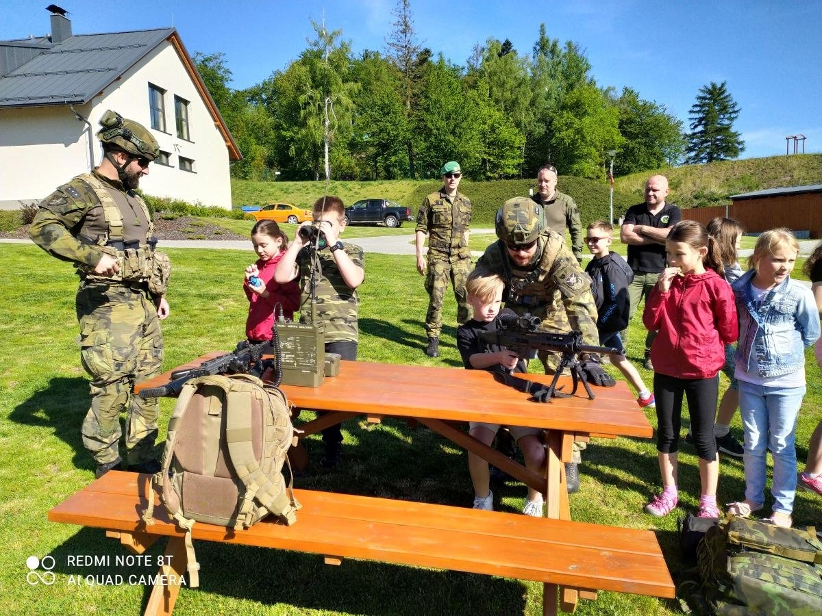 Hned na začátku nás přivítal pan Vyroubal s několika vojáky z Přáslavic. Celé dopoledne se nám všichni perfektně věnovali a trpělivě vysvětlovali vše, co takový voják musí umět.