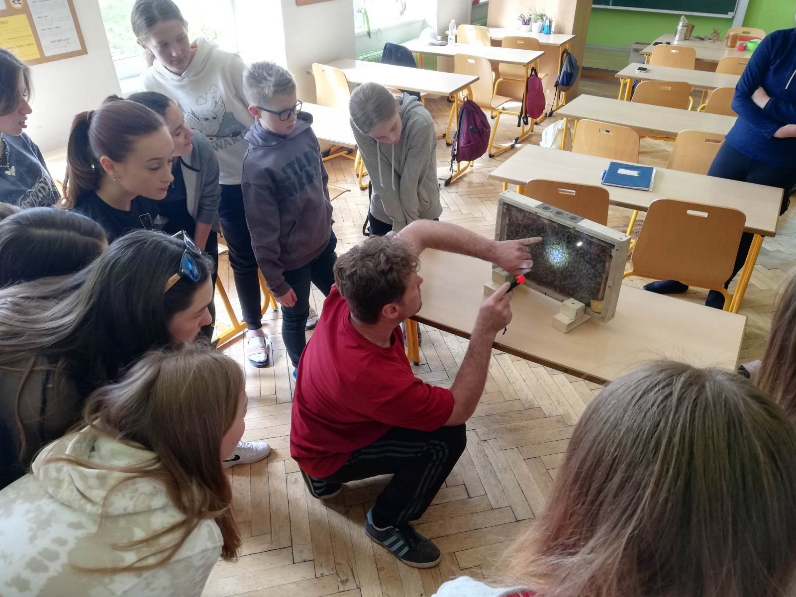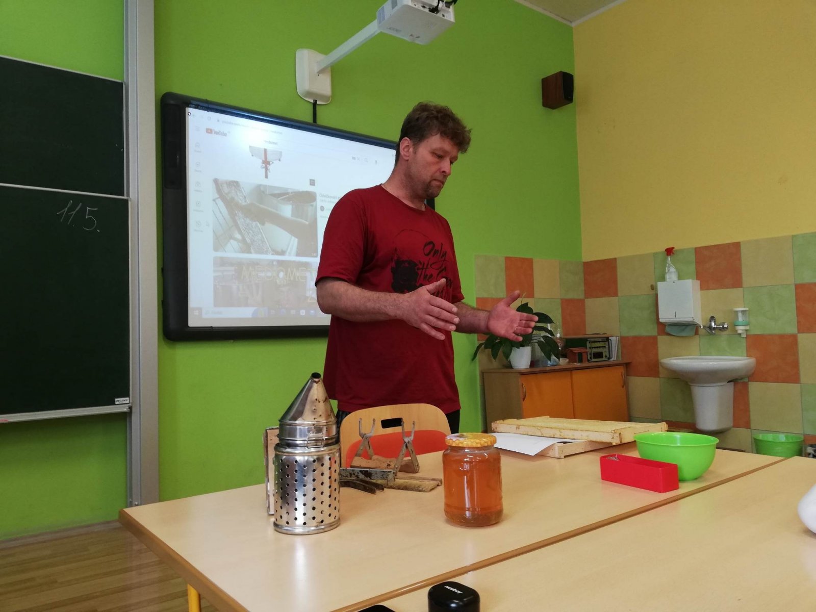 Žáky 7. A navštívil ve škole pan Pavel Bednařík, který se ve volném čase věnuje včelaření. Představil nám život včely od jejího narození až po „důchod“. Přinesl si s sebou různé pomůcky, včelařský oblek, ochutnávku čerstvého lipového medu a dokonce „živou“ včelí plástev i s královnou.