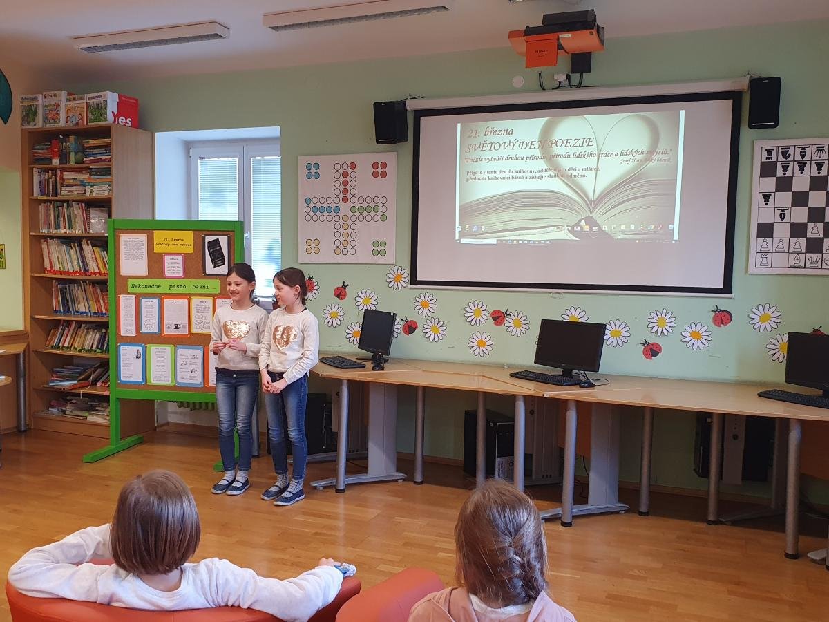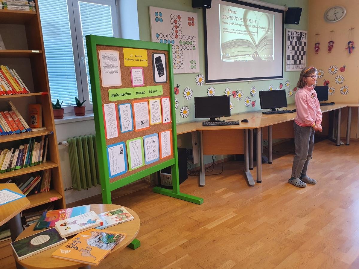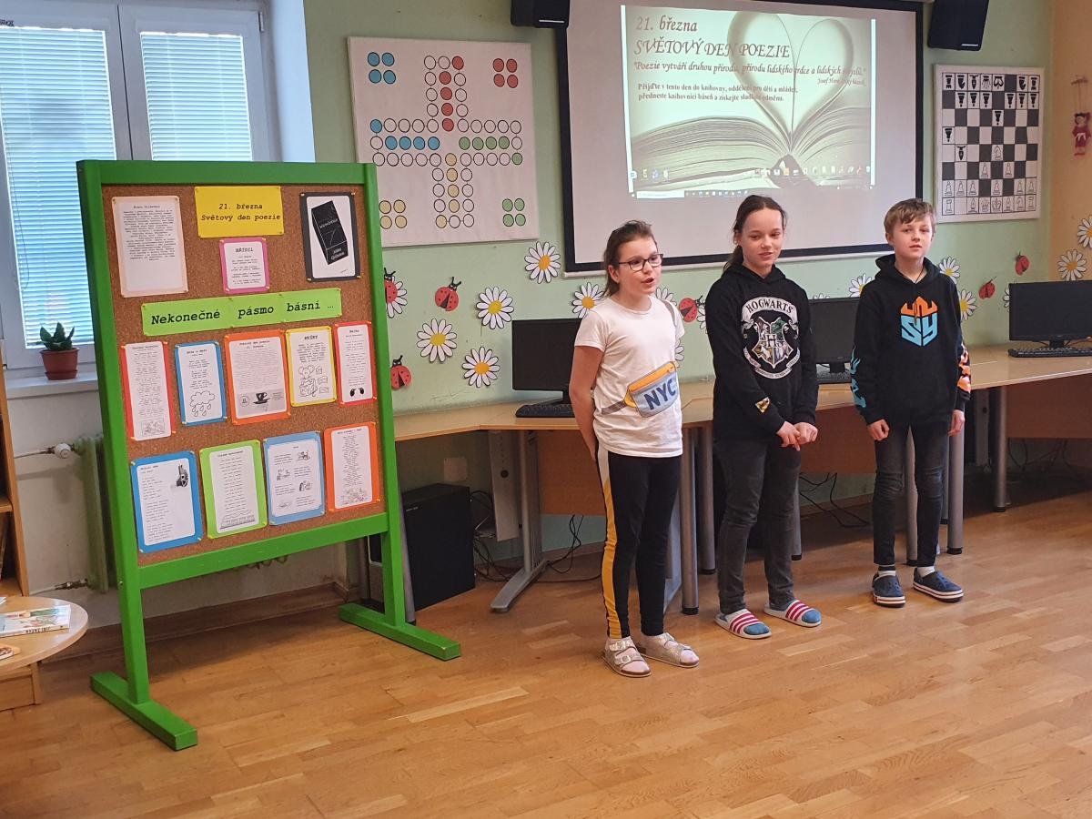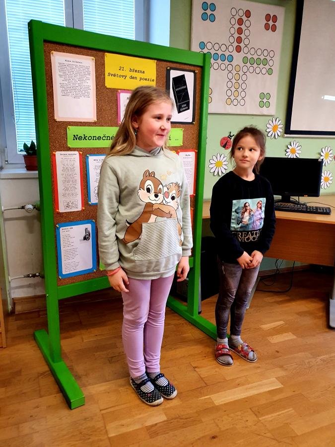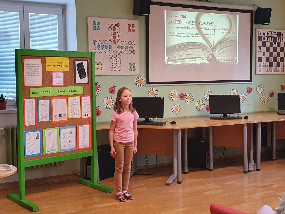 Poezie ze světa nezmizela, stále žije. Téměř všechny děti ve školní družině přednesly přes 100 různých básní. V rámci Mezinárodního dne poezie jsme se setkali v herně. Krásnou vlastní báseň zarecitovaly Anita a Kája Hrbáčkovy. Velký dík si zaslouží Maruška Junasová. Ta napsala dojemnou báseň o přátelství. Bohužel se nemohla naší přehlídky veršů zúčastnit. S rodiči ale báseň natočila doma a my jsme v herně přednes sledovali ze záznamu. Opravdu skvělé. Děkujeme.