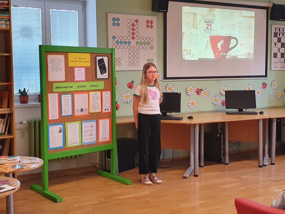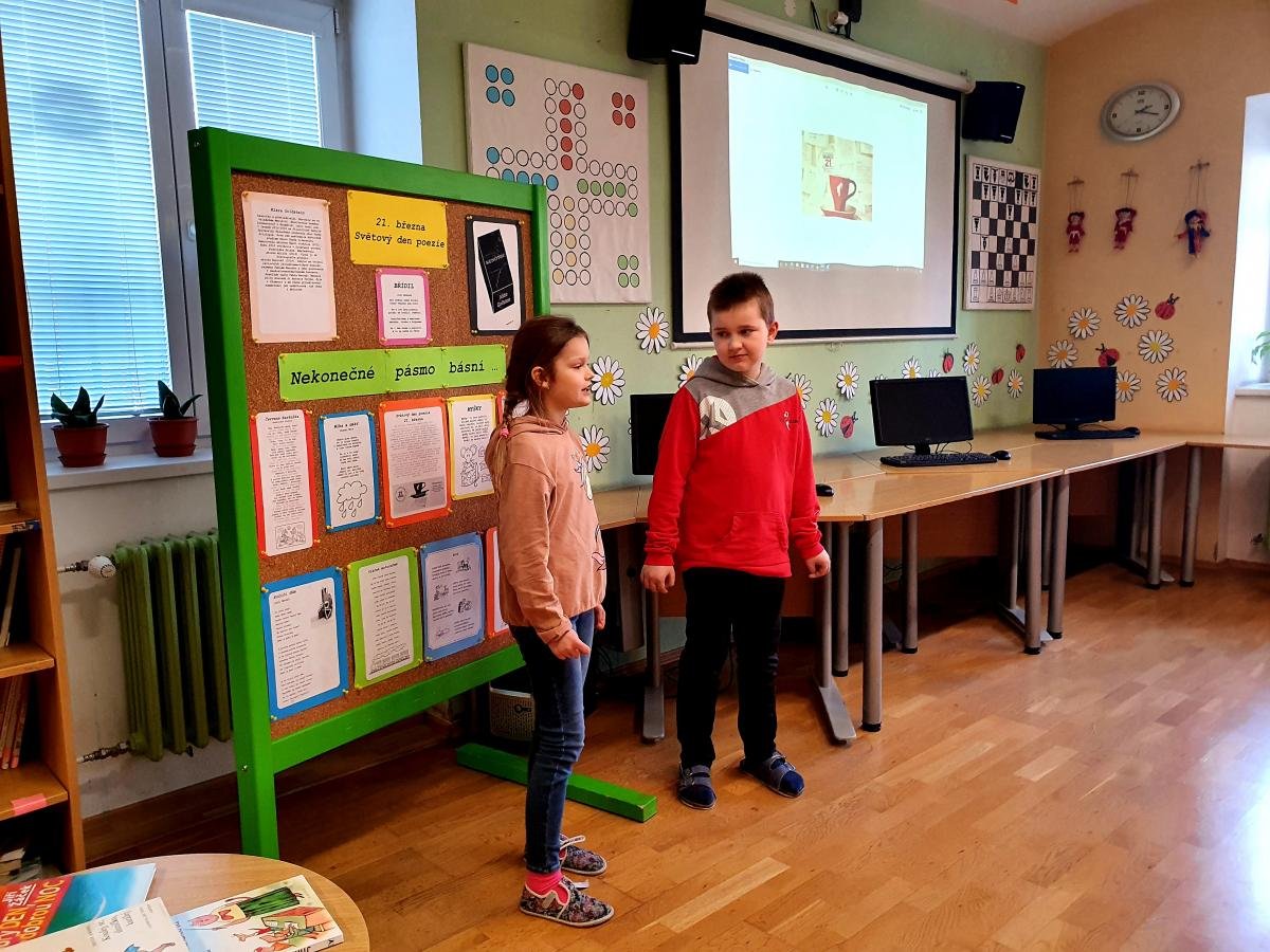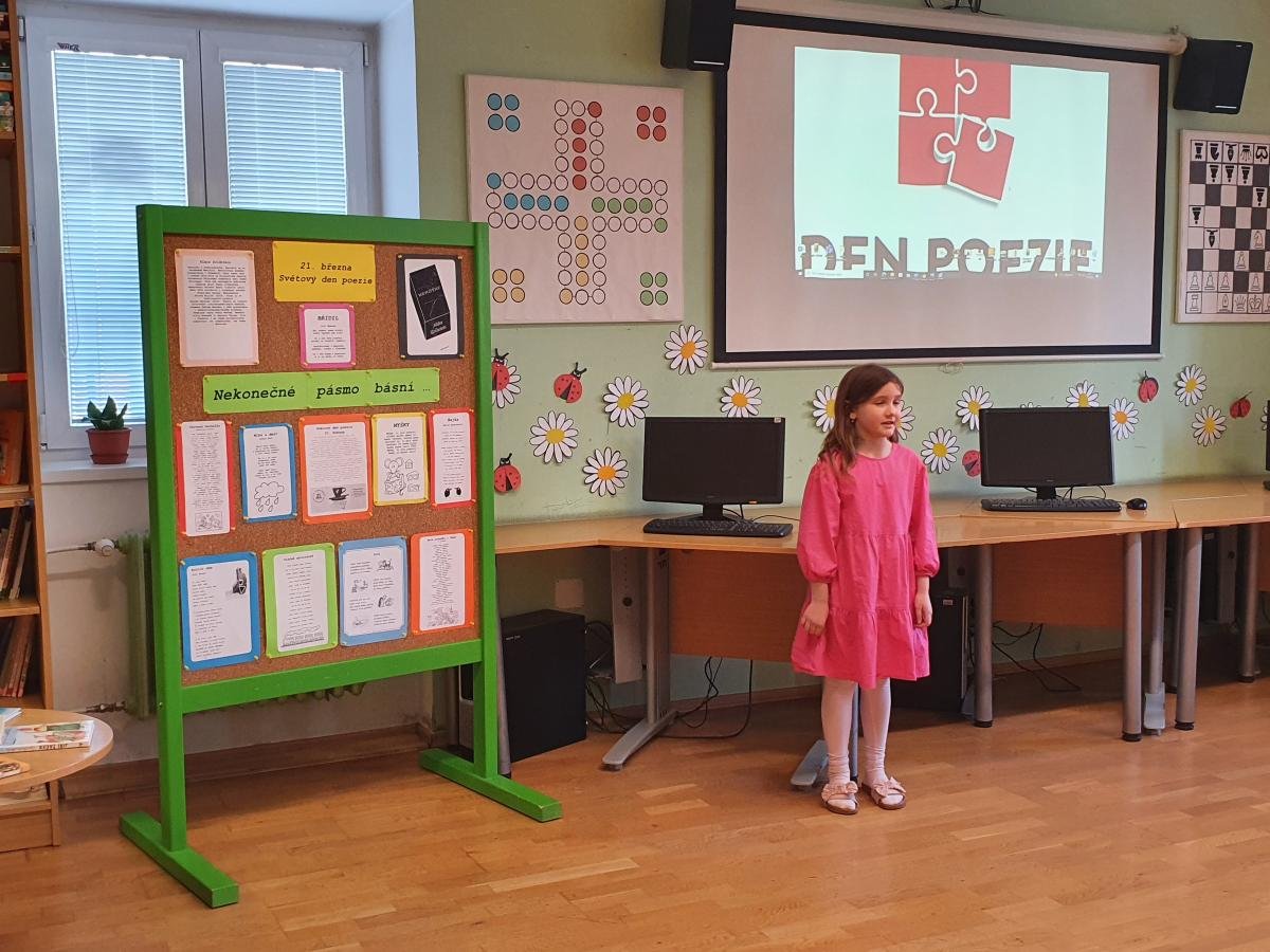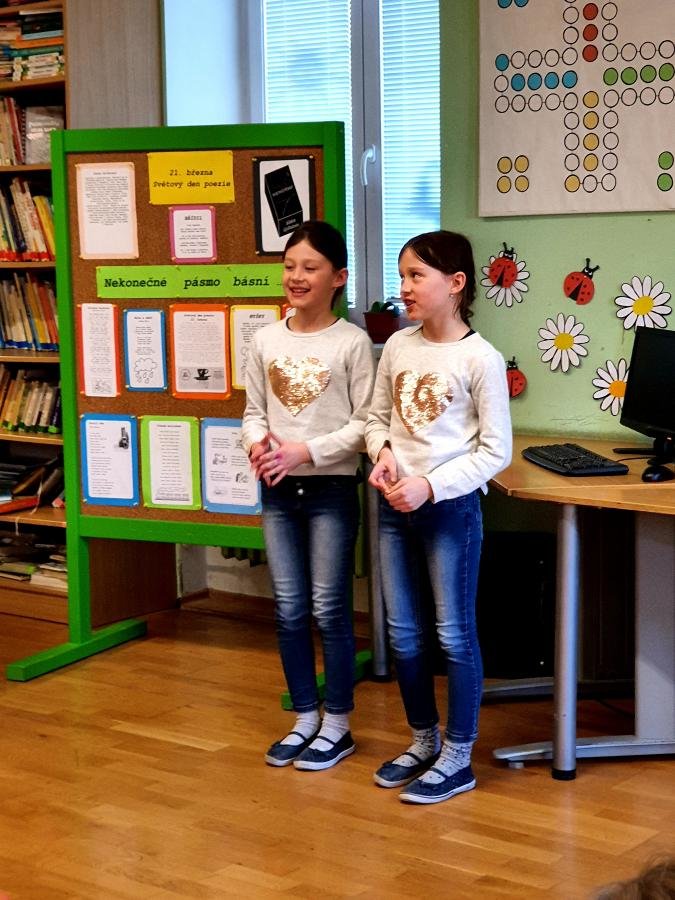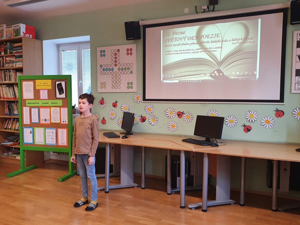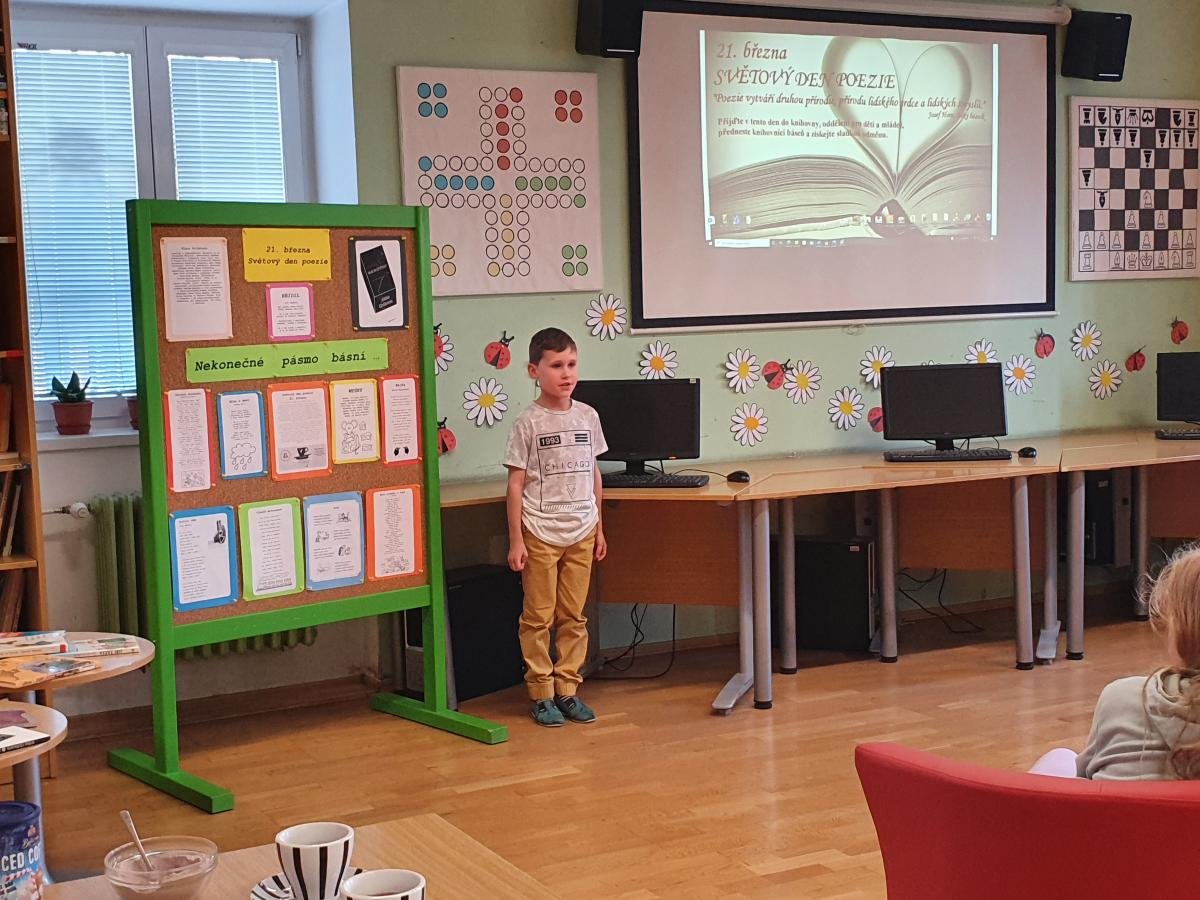 Poezie ze světa nezmizela, stále žije. Téměř všechny děti ve školní družině přednesly přes 100 různých básní. V rámci Mezinárodního dne poezie jsme se setkali v herně. Krásnou vlastní báseň zarecitovaly Anita a Kája Hrbáčkovy. Velký dík si zaslouží Maruška Junasová. Ta napsala dojemnou báseň o přátelství. Bohužel se nemohla naší přehlídky veršů zúčastnit. S rodiči ale báseň natočila doma a my jsme v herně přednes sledovali ze záznamu. Opravdu skvělé. Děkujeme.