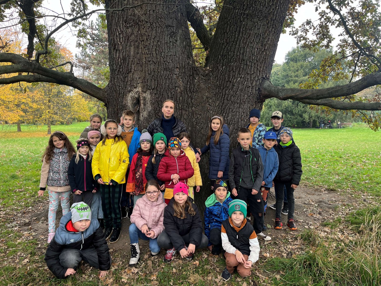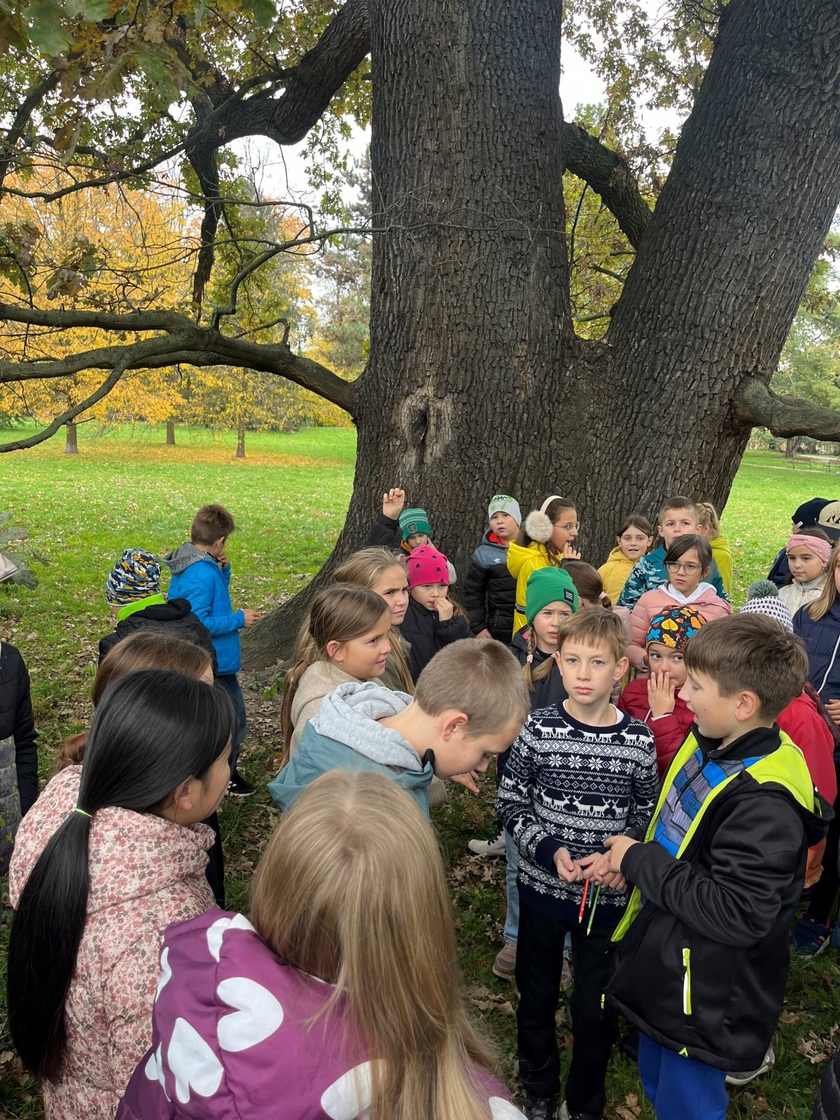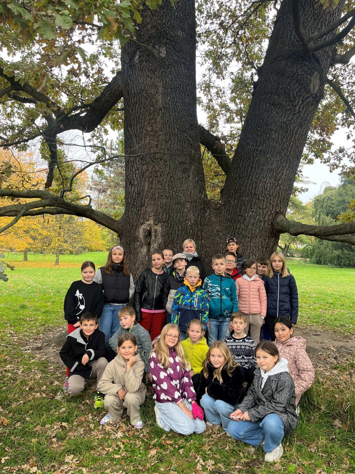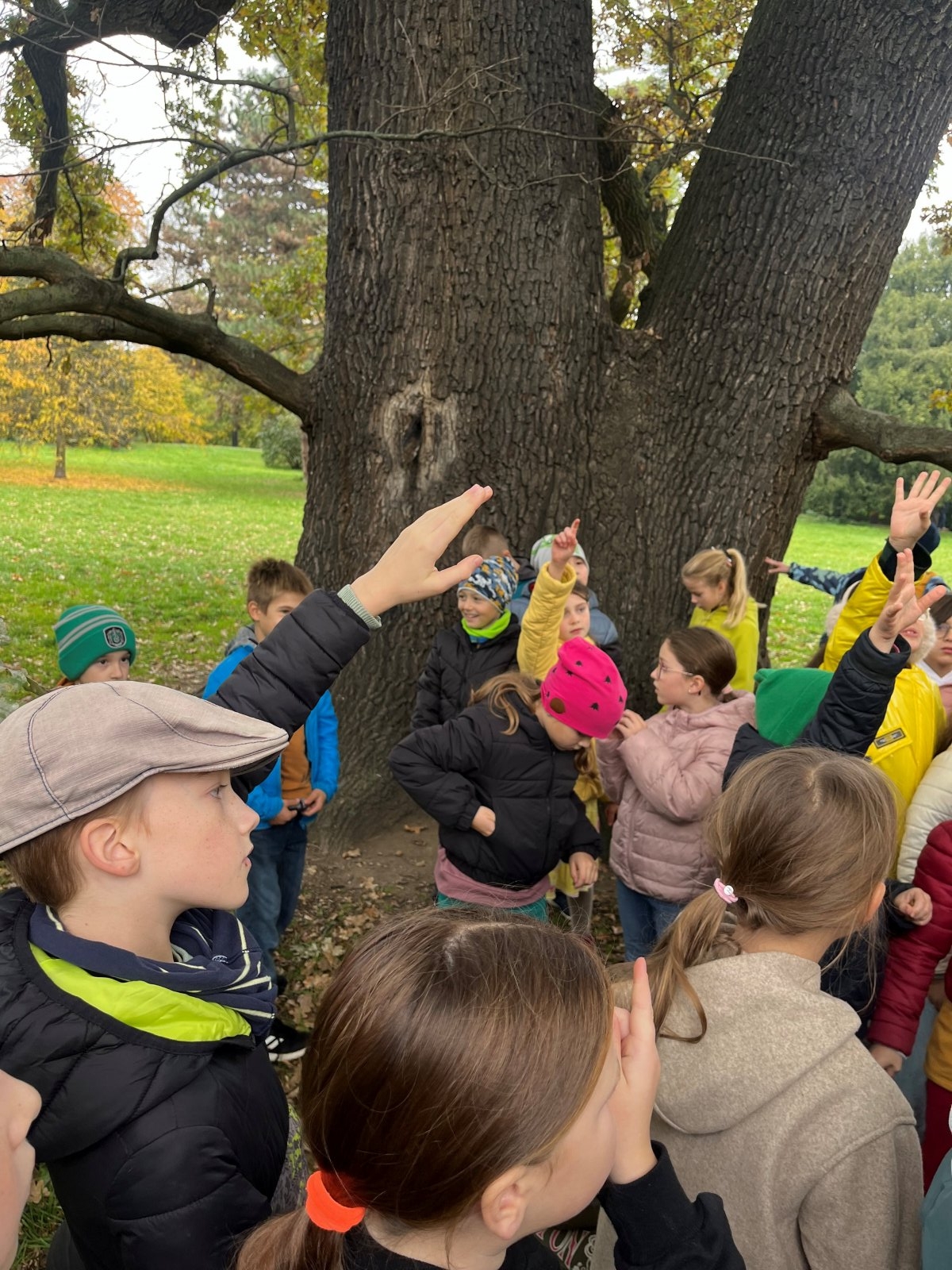 Po desáté hodině dopolední se všechny třídy vydaly za stejným cílem – najít památné stromy v nejbližším okolí školy. Prvňáčky a druháky zajímal buk, třeťáky dub a 4. a 5. ročníky podnikly vycházku k památné lípě.
