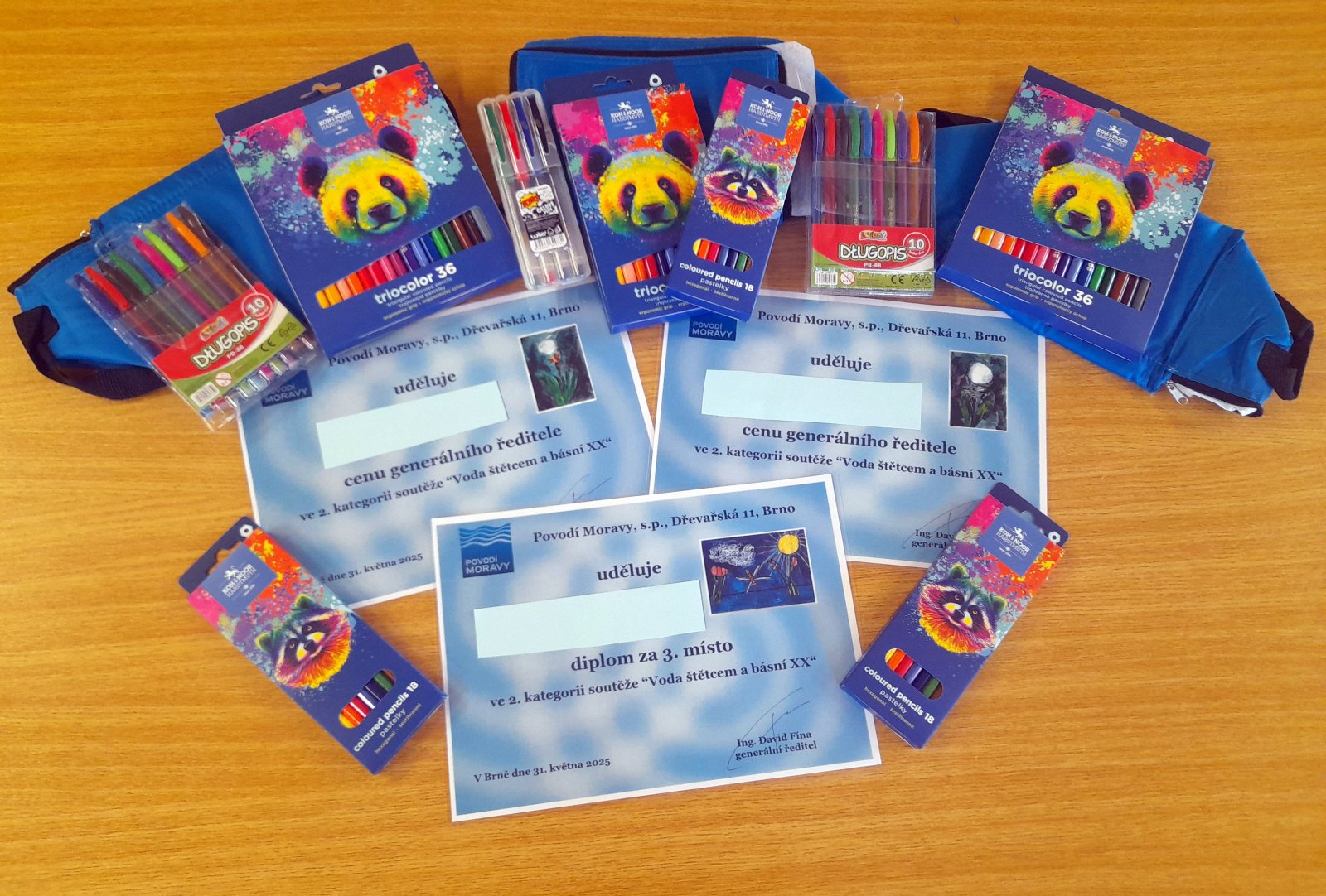 Velkou radost nám udělala hned tři ocenění ve výtvarné a literární soutěži „Voda štětcem a básní“. V letošním jubilejním 20. ročníku soutěže, pořádané státním podnikem Povodí Moravy s.p., děti malovaly a tvořily na téma „Voda a hmyz“. Soutěž se těšila obrovskému zájmu – zapojilo se 120 škol a celkem bylo zasláno neuvěřitelných 1244 soutěžních děl. Z toho bylo 1064 obrázků, 102 prostorových výtvorů, 21 keramických děl a 57 literárních prací.