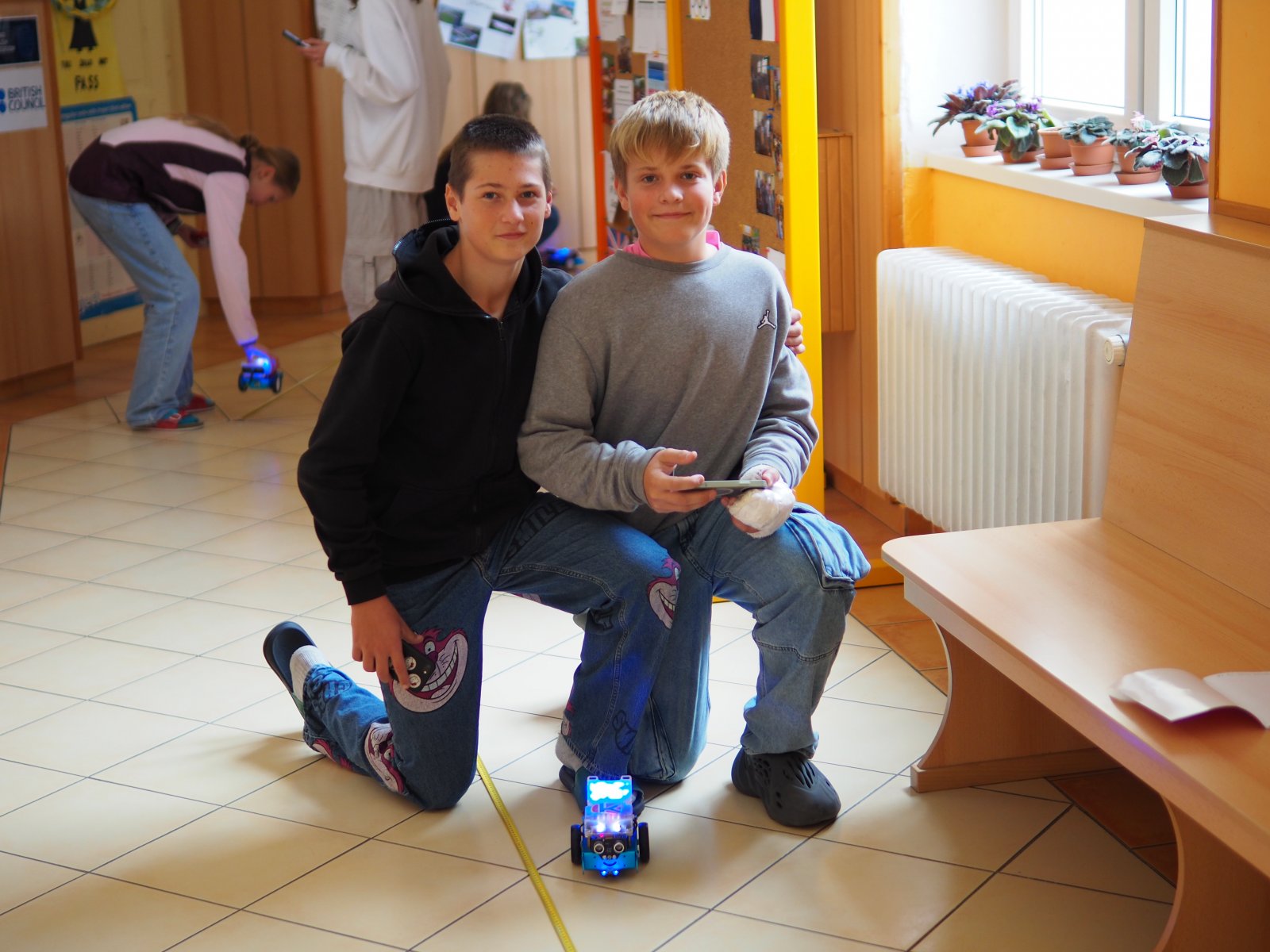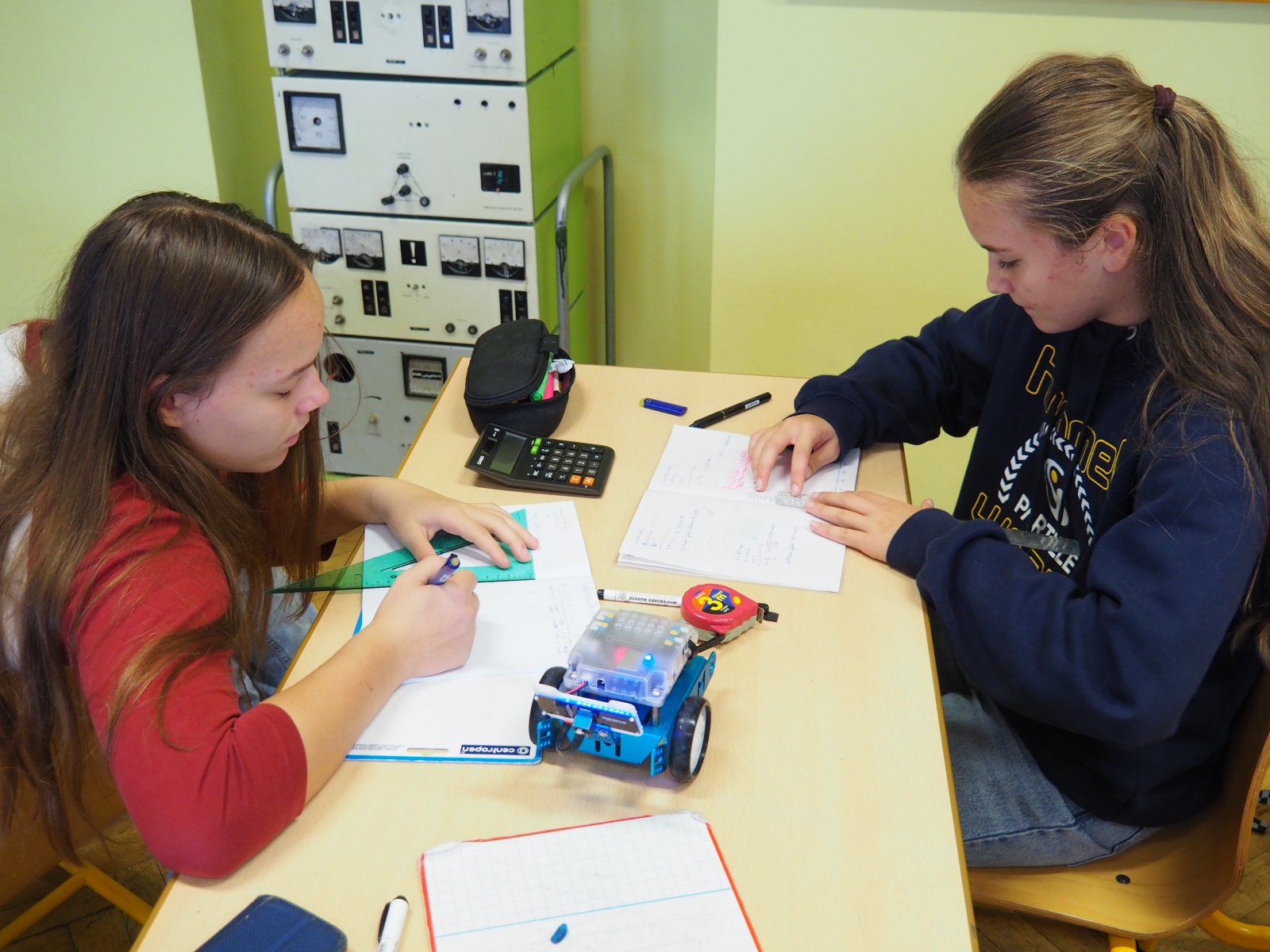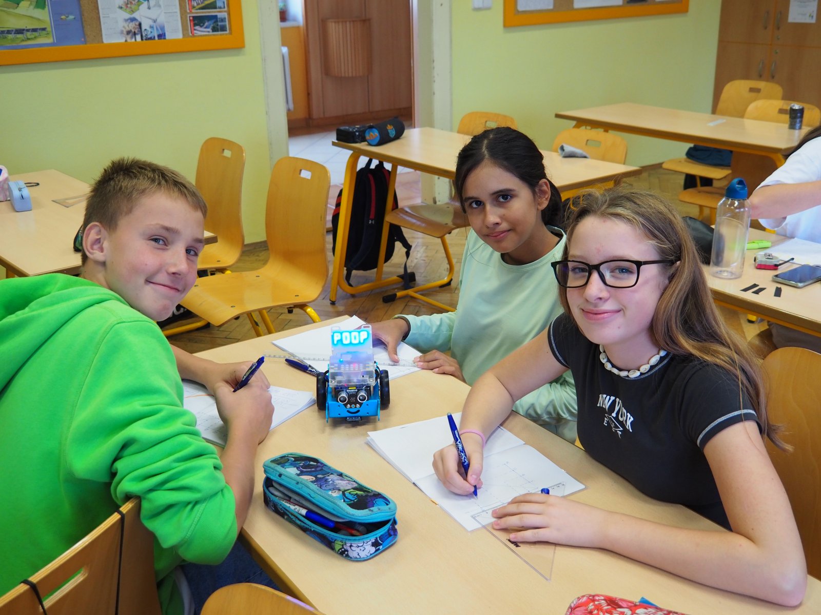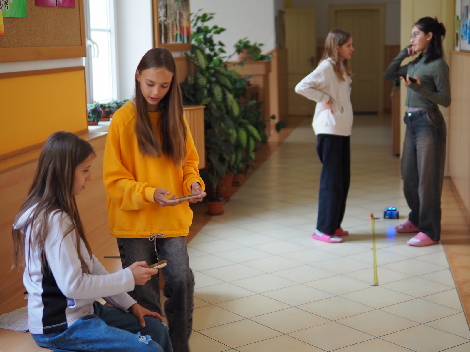 Dráha za čas. Tak zněla nápověda pro naše žáky 7. ročníku, kteří měli za úkol zjistit rychlost oblíbeného mBota. Na chodbě si každá dvojice žáků vymezila svoji dráhu, změřila čas a z naměřených hodnot vypočítala rychlost.