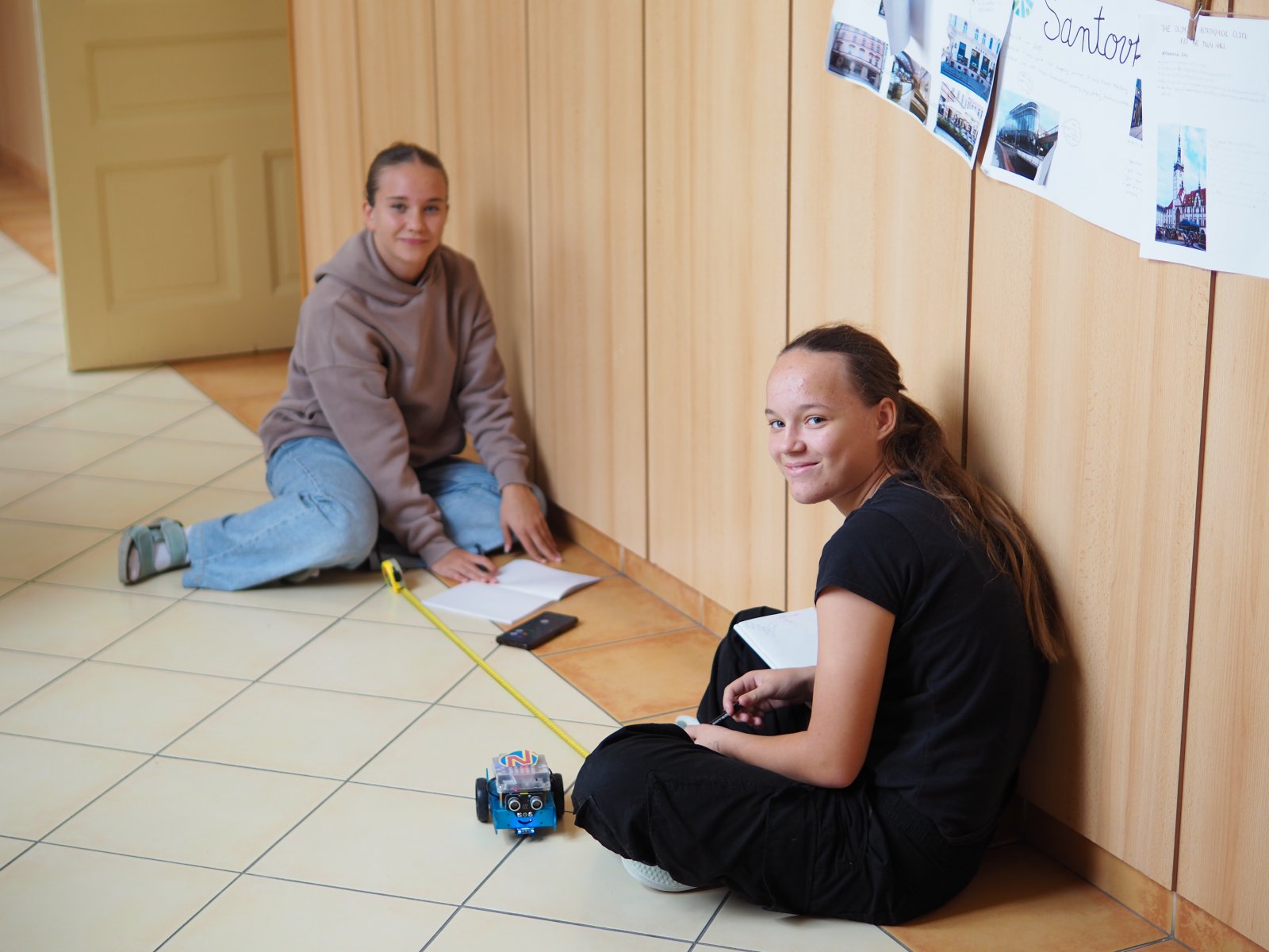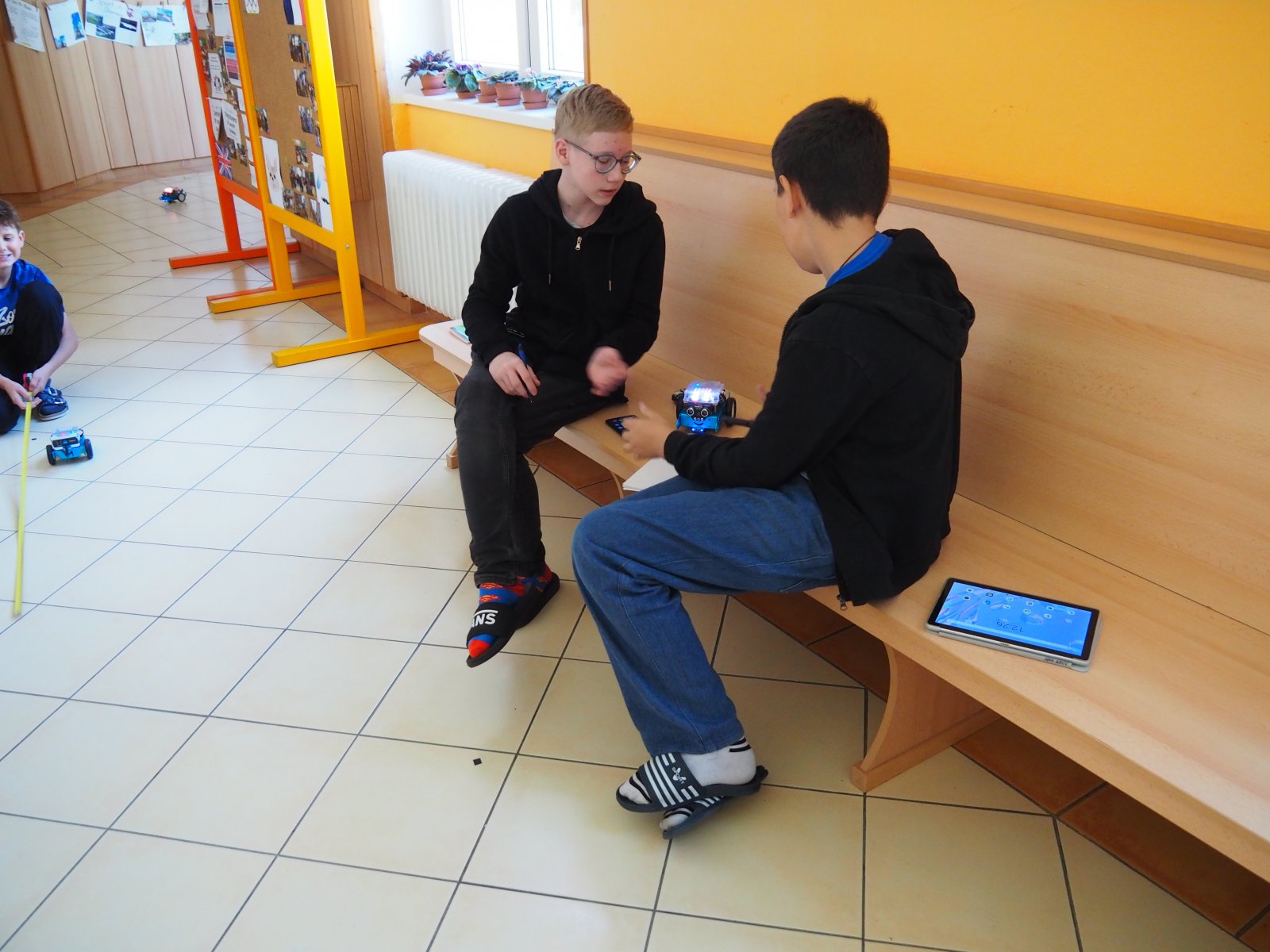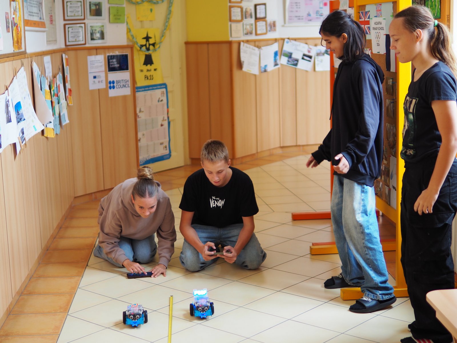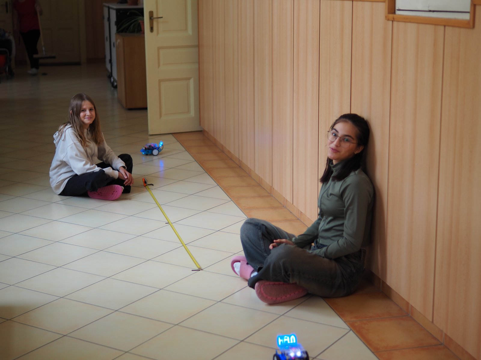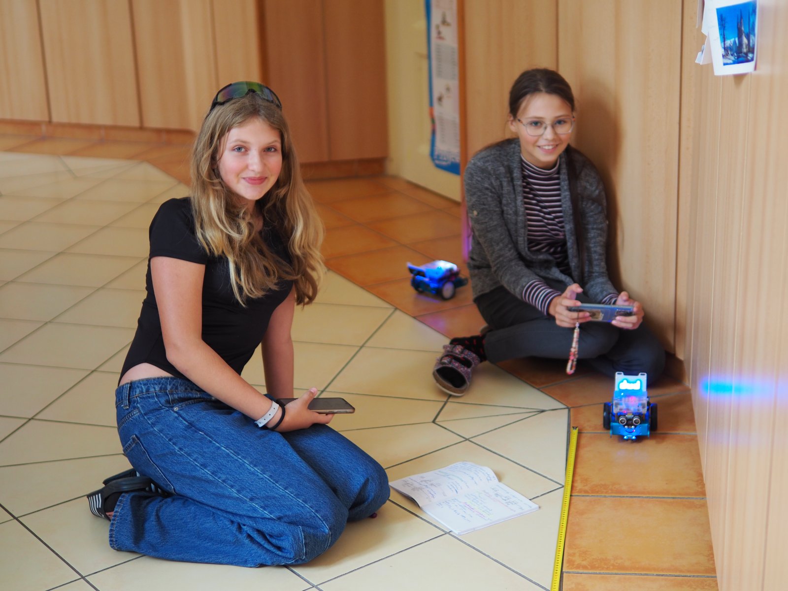 Dráha za čas. Tak zněla nápověda pro naše žáky 7. ročníku, kteří měli za úkol zjistit rychlost oblíbeného mBota. Na chodbě si každá dvojice žáků vymezila svoji dráhu, změřila čas a z naměřených hodnot vypočítala rychlost.