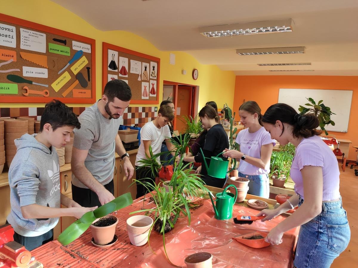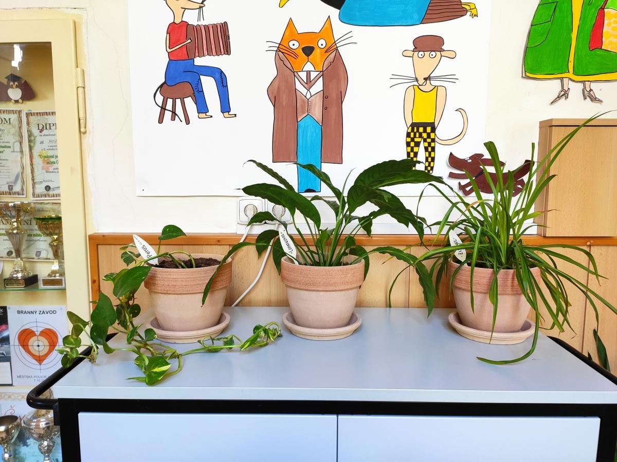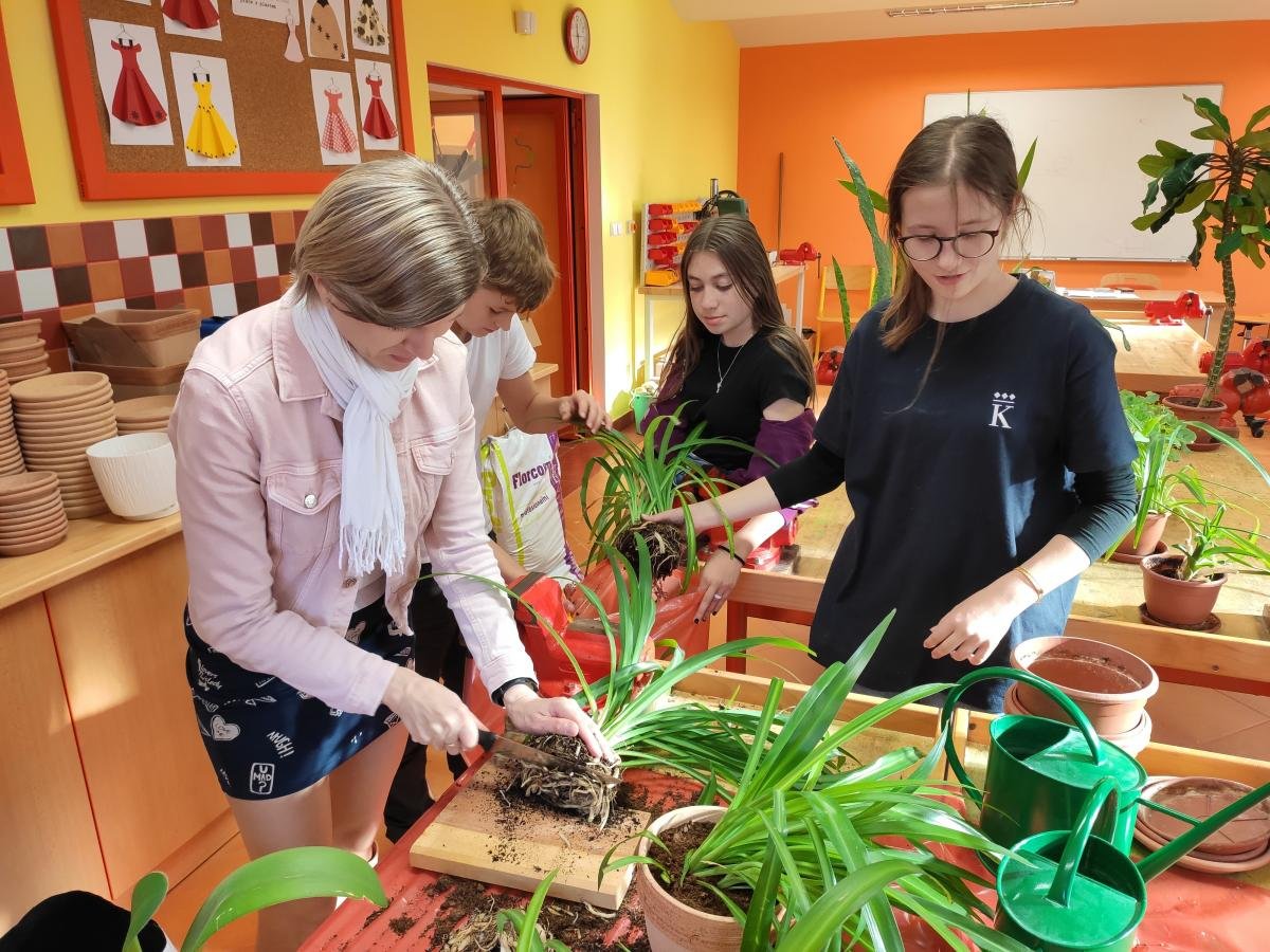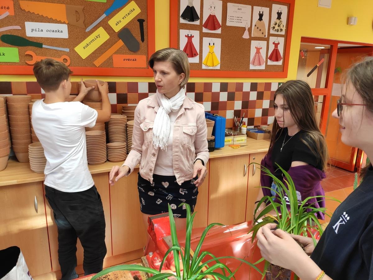 Naši žáci druhého stupně se v rámci pracovních činností nevěnují jen práci s technickými materiály, přípravě pokrmů a volbě povolání, ale také pěstování a ošetřování pokojových rostlin. Tentokrát dostali za úkol zvelebit prostory školních chodeb. Tento úkol spočíval ve vytvoření seznamu a počtu jednotlivých květin, výběru správných květináčů, sestavení finančního rozpočtu, samotného přesazení a úklidu. Volba padla na hliněné květináče různých velikostí a tvarů v počtu 115 kusů včetně podmisek. Ano, tolik nových květináčů nám teď zdobí naše chodby. Protože u nás ve škole učíme v souvislostech, tak každý květináč je navíc opatřen štítkem s názvem květiny. Zde nám pomohl a přiložil ruku k dílu i pan učitel z přírodopisu. V přiložené fotogalerii můžete posoudit, jak se žákům podařilo tento úkol splnit.
