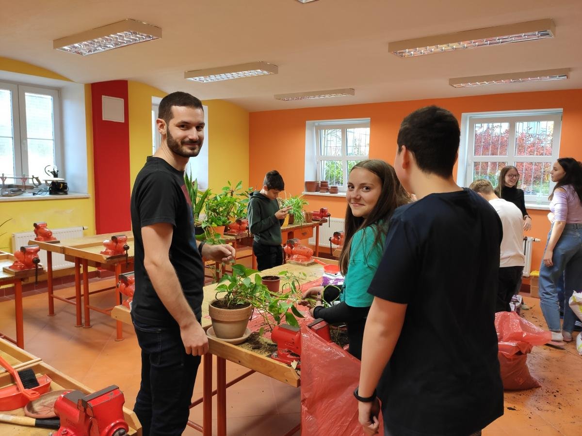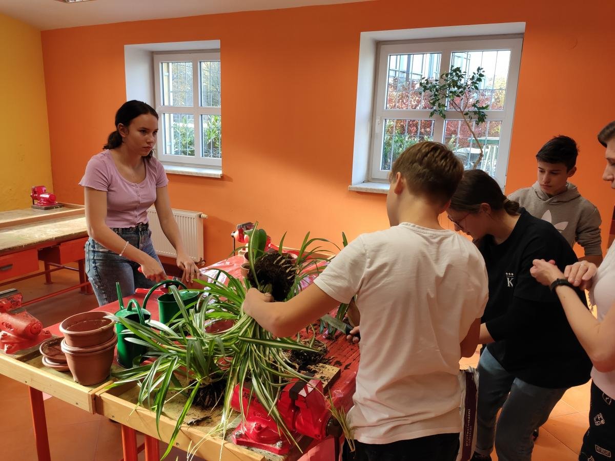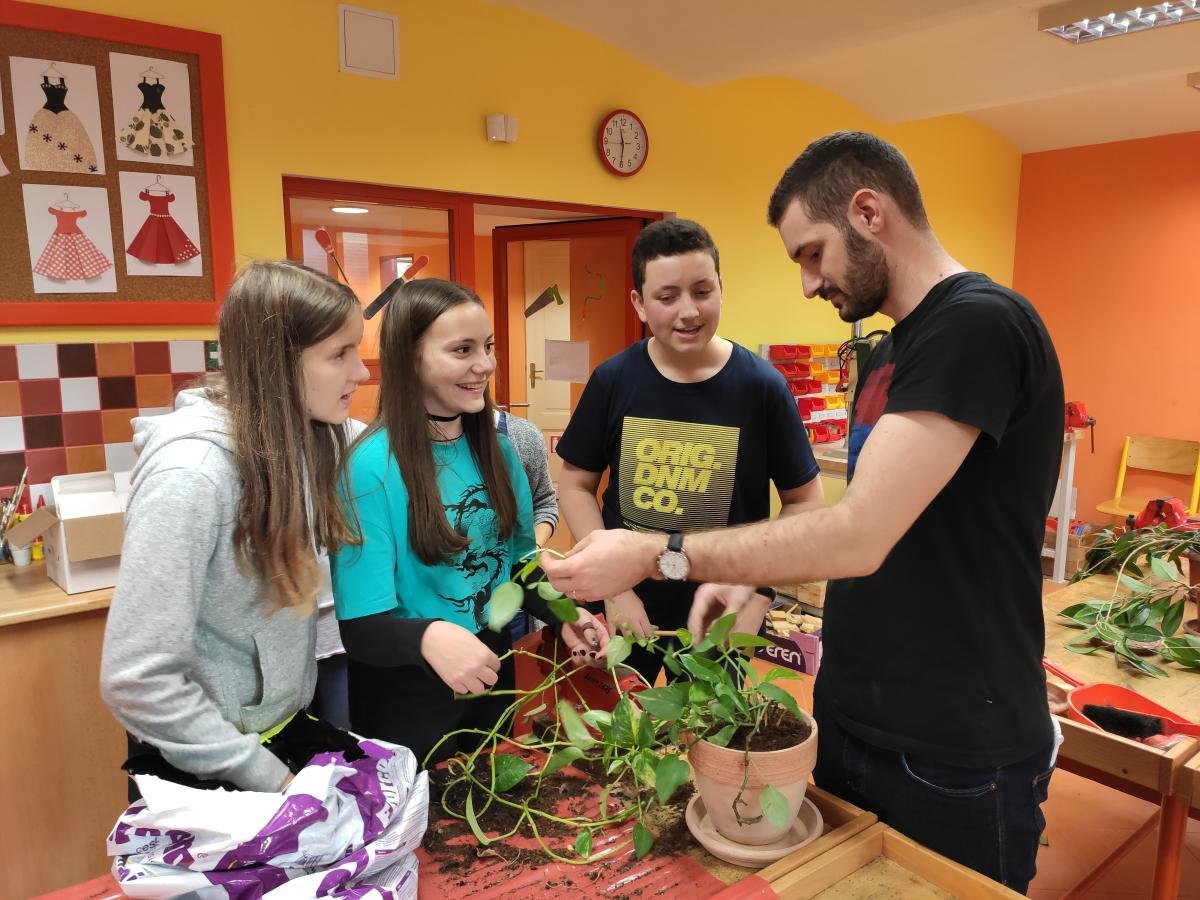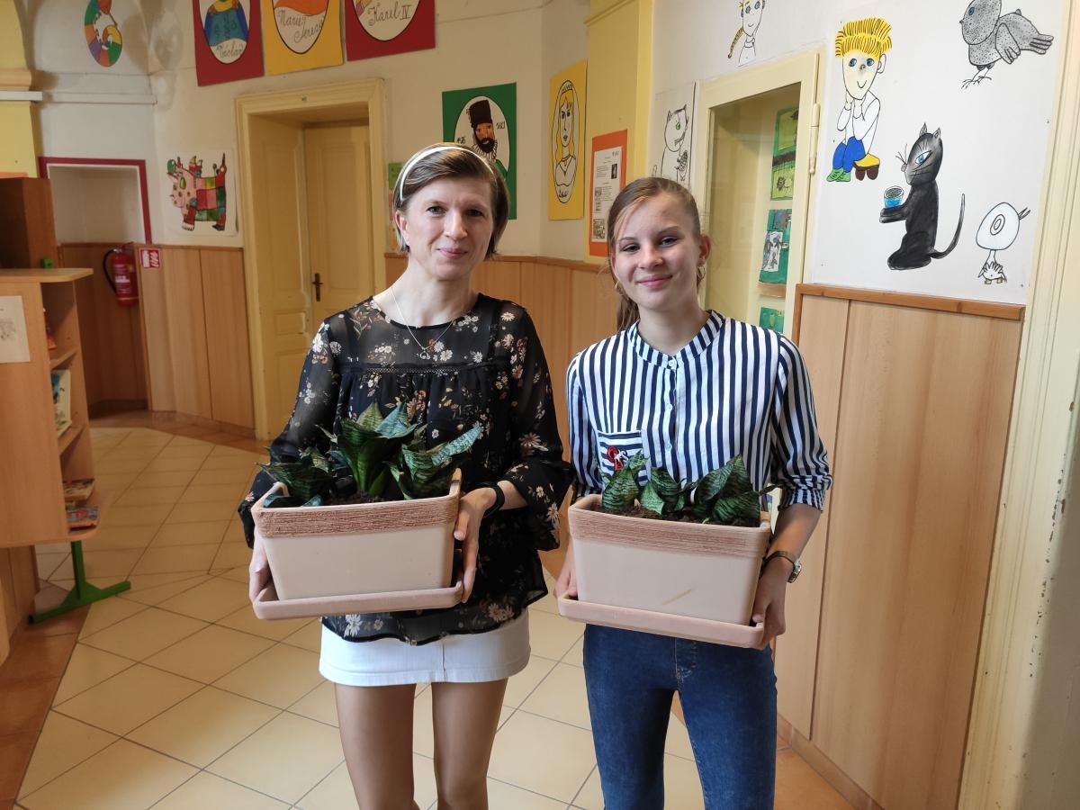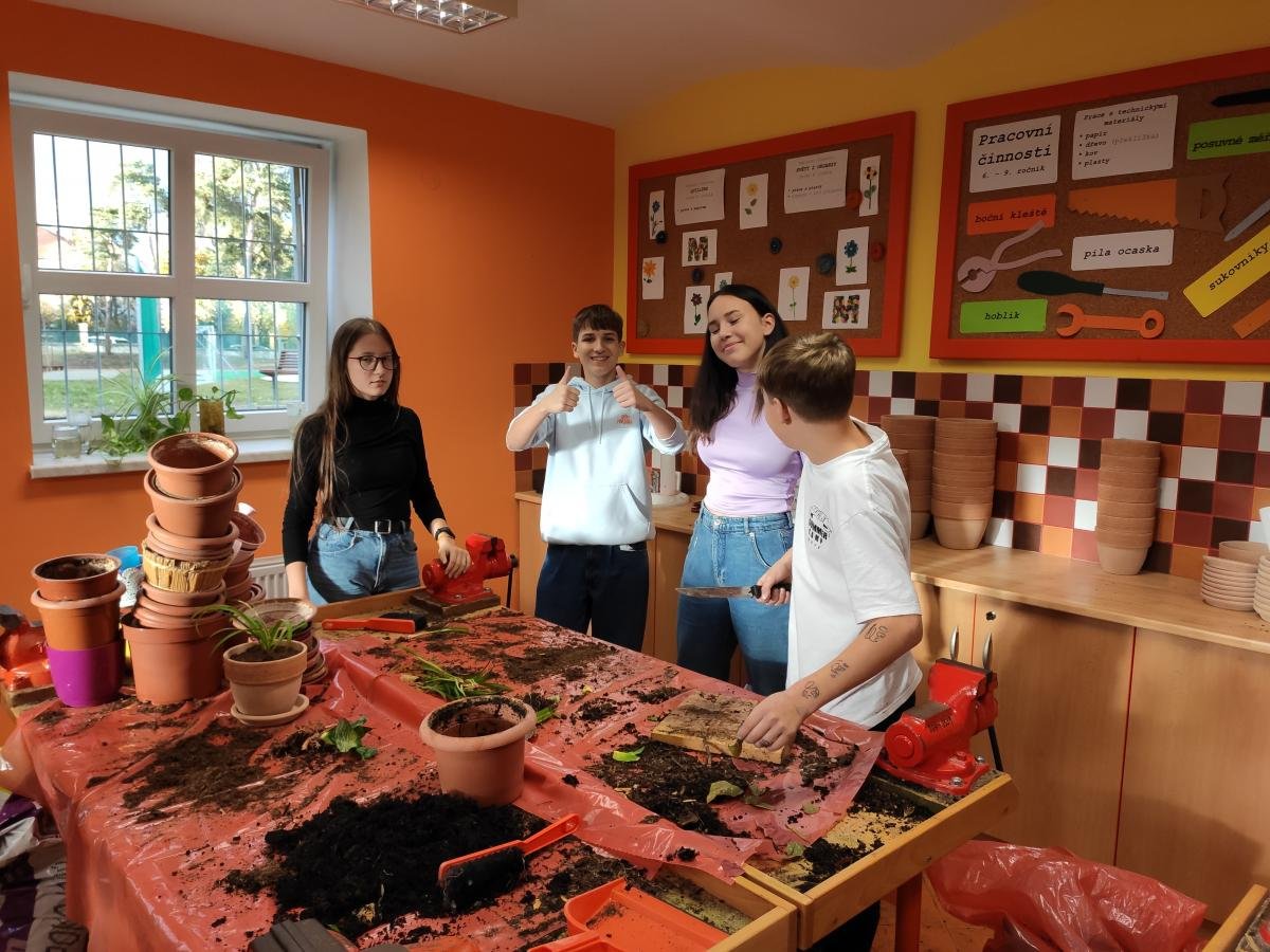Naši žáci druhého stupně se v rámci pracovních činností nevěnují jen práci s technickými materiály, přípravě pokrmů a volbě povolání, ale také pěstování a ošetřování pokojových rostlin. Tentokrát dostali za úkol zvelebit prostory školních chodeb. Tento úkol spočíval ve vytvoření seznamu a počtu jednotlivých květin, výběru správných květináčů, sestavení finančního rozpočtu, samotného přesazení a úklidu. Volba padla na hliněné květináče různých velikostí a tvarů v počtu 115 kusů včetně podmisek. Ano, tolik nových květináčů nám teď zdobí naše chodby. Protože u nás ve škole učíme v souvislostech, tak každý květináč je navíc opatřen štítkem s názvem květiny. Zde nám pomohl a přiložil ruku k dílu i pan učitel z přírodopisu. V přiložené fotogalerii můžete posoudit, jak se žákům podařilo tento úkol splnit.