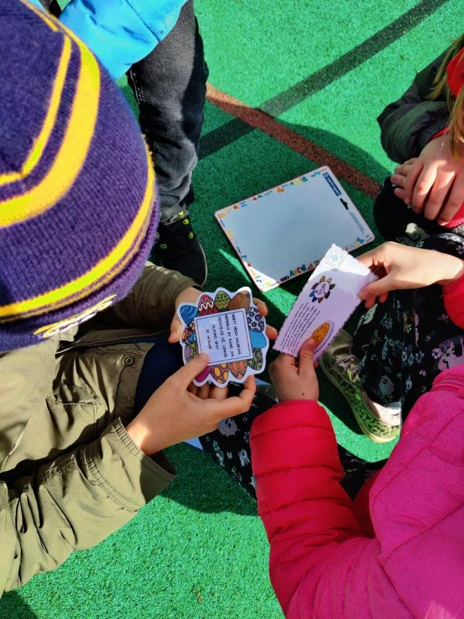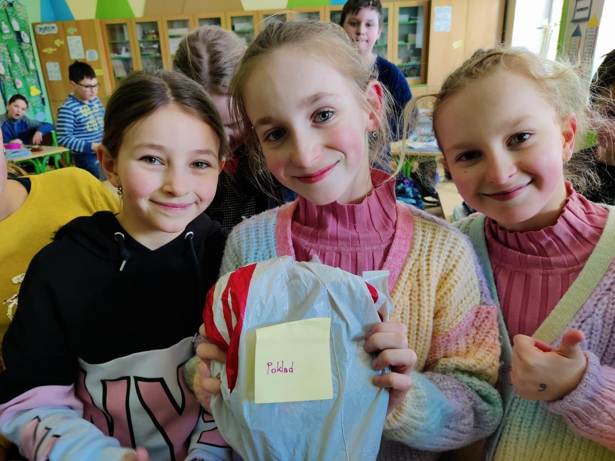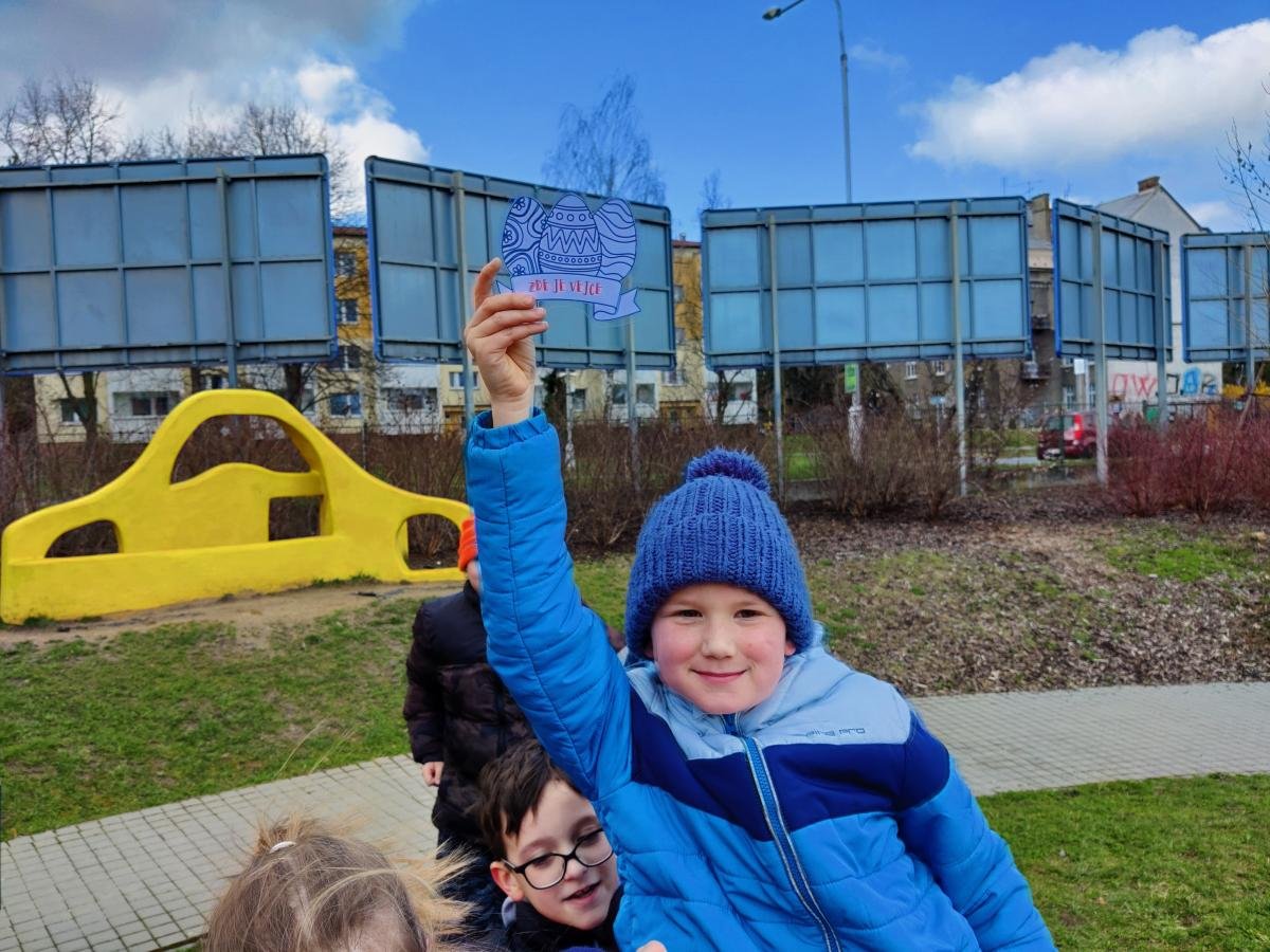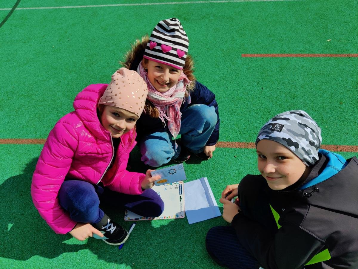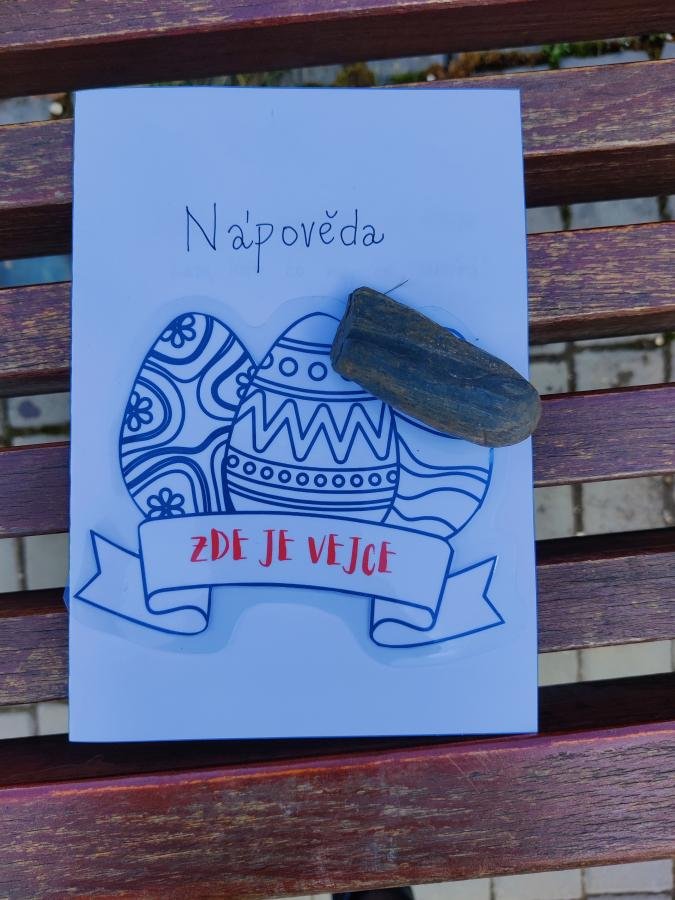 Děti postupně na stanovištích našly 10 velikonočních pohlednic. Aby si mohly přečíst vzkaz dětí z různých koutů světa napsaný na pohlednici, musely uhodnout a vyřešit hádanku. Na místě pro známku bylo vajíčko + číslo. Pomocí vajíčkové abecedy vyměnily děti vajíčko za písmeno (číslo na známce určuje pořadí písmenka v tajence). Postupně složily heslo „Najdi vejce“. Jakmile měly celou tajenku, hledaly závěrečný vzkaz s heslem "Hledej vejce" s nápovědou o ukrytém velikonočním pokladu. Aktivitu jsme si náramně užili.