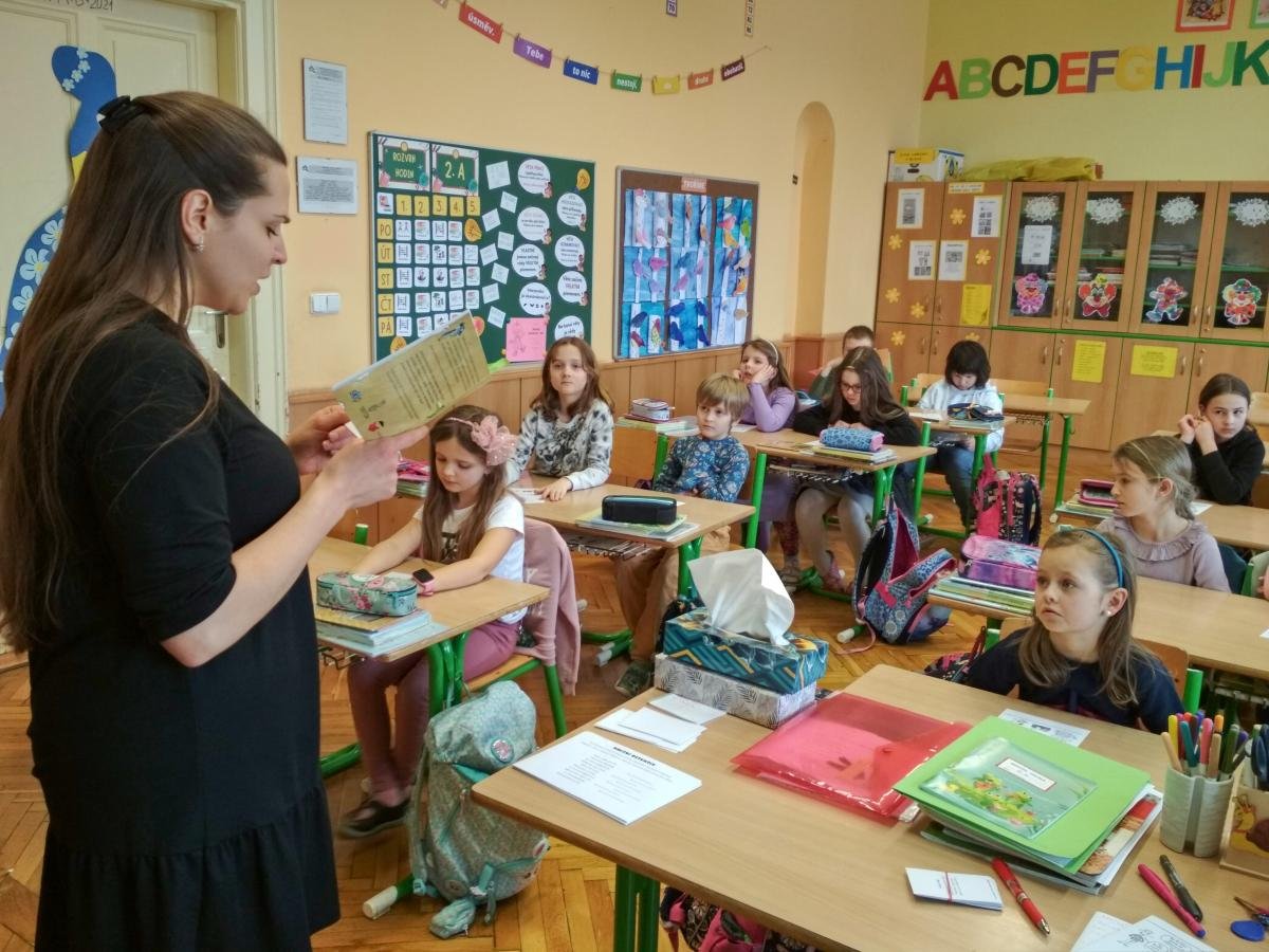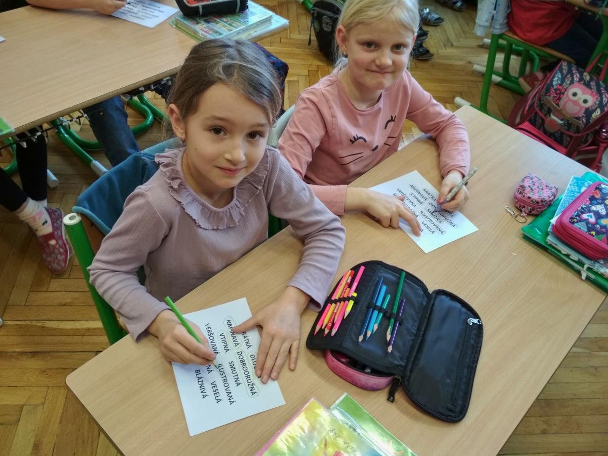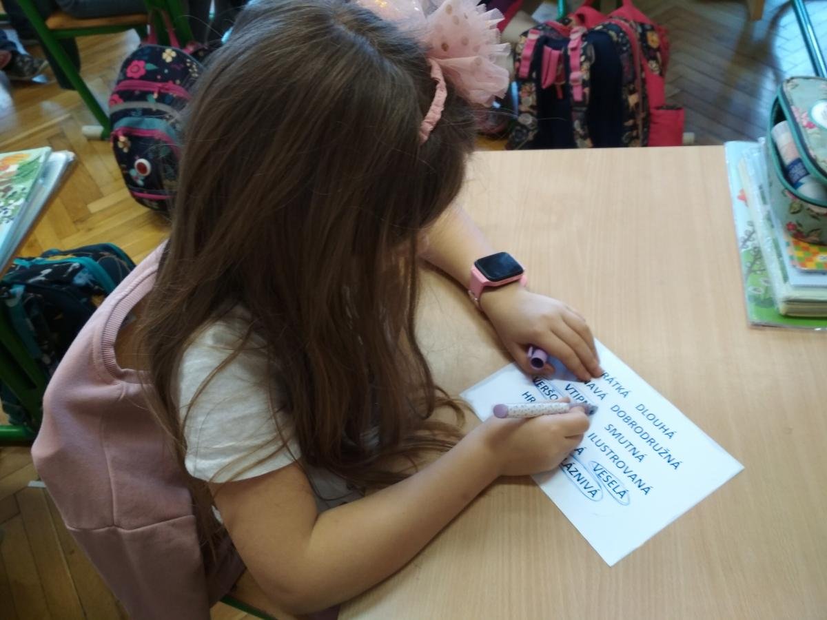 Cílem hodiny byl rozvoj slovní zásoby spojené s knihami. Věnovali jsem se frázím typu „zakousnout se do knihy“, „knihomol“ apod. Žáci pracovali s pracovními listy přímo od spisovatelky K. Smolíkové ilustrované malířkou Bárou Buchalovou.