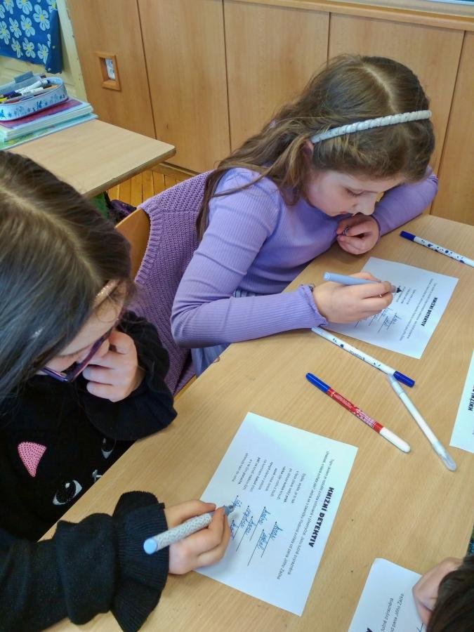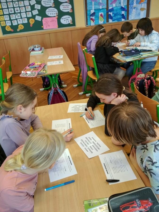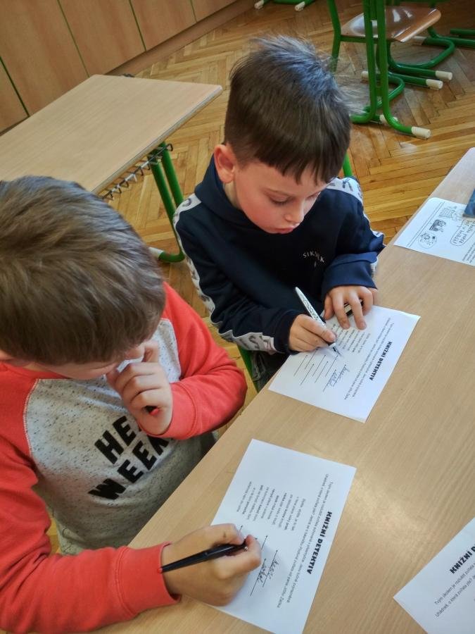 Děti také přemýšlely nad tím, jaká by měla být kniha, aby si na ní sami “pochutnali”. Dalším úkolem bylo vyvodit z připraveného textu, jakým způsobem se mladí čtenáři mohou stát detektivy. A nakonec se těmi detektivy stali přímo žáci 2.A, kteří ve skupinách luštili záludné šifry v básničce Podivná zvířata od Jiřího Žáčka.