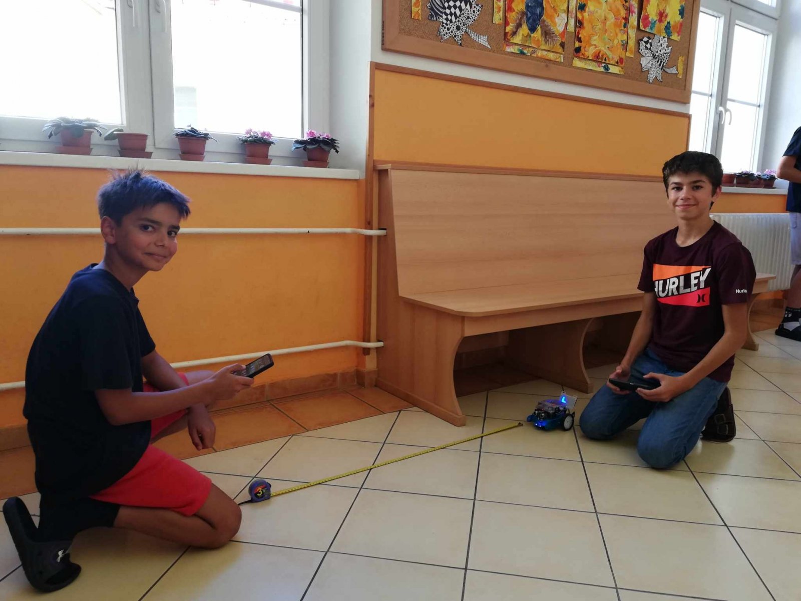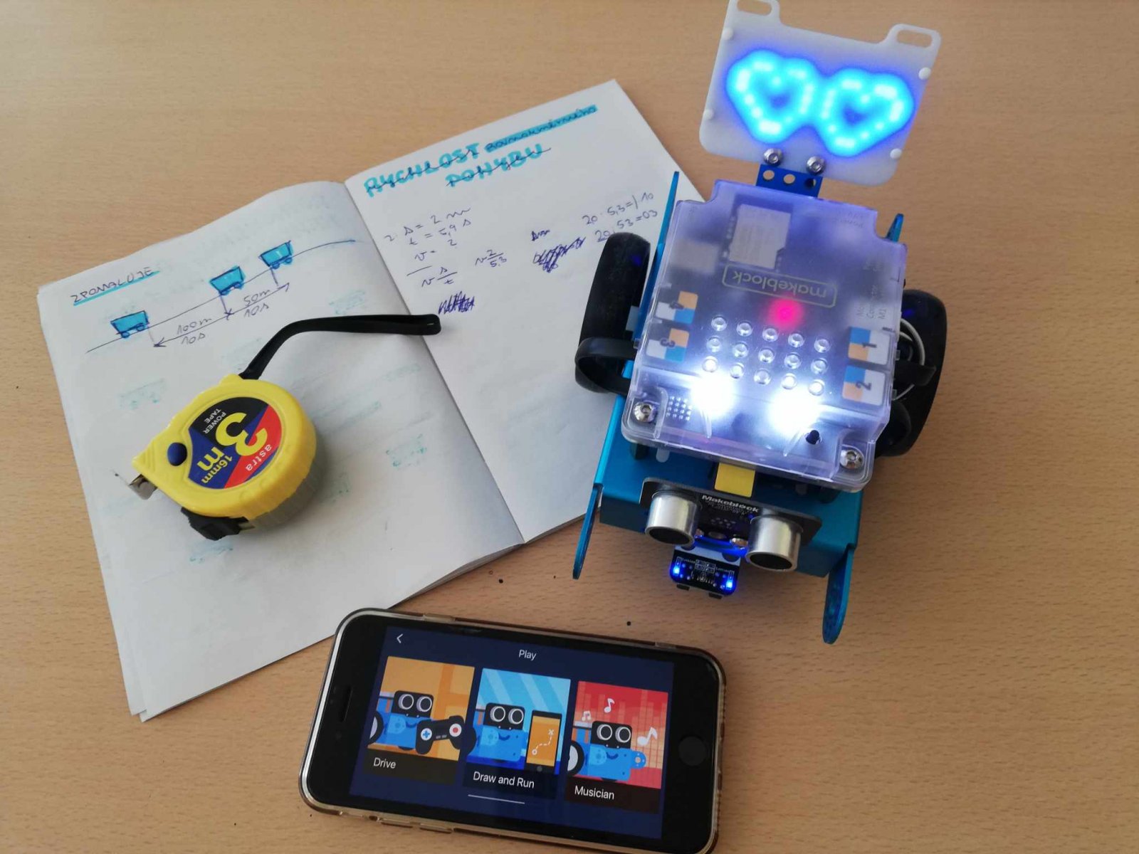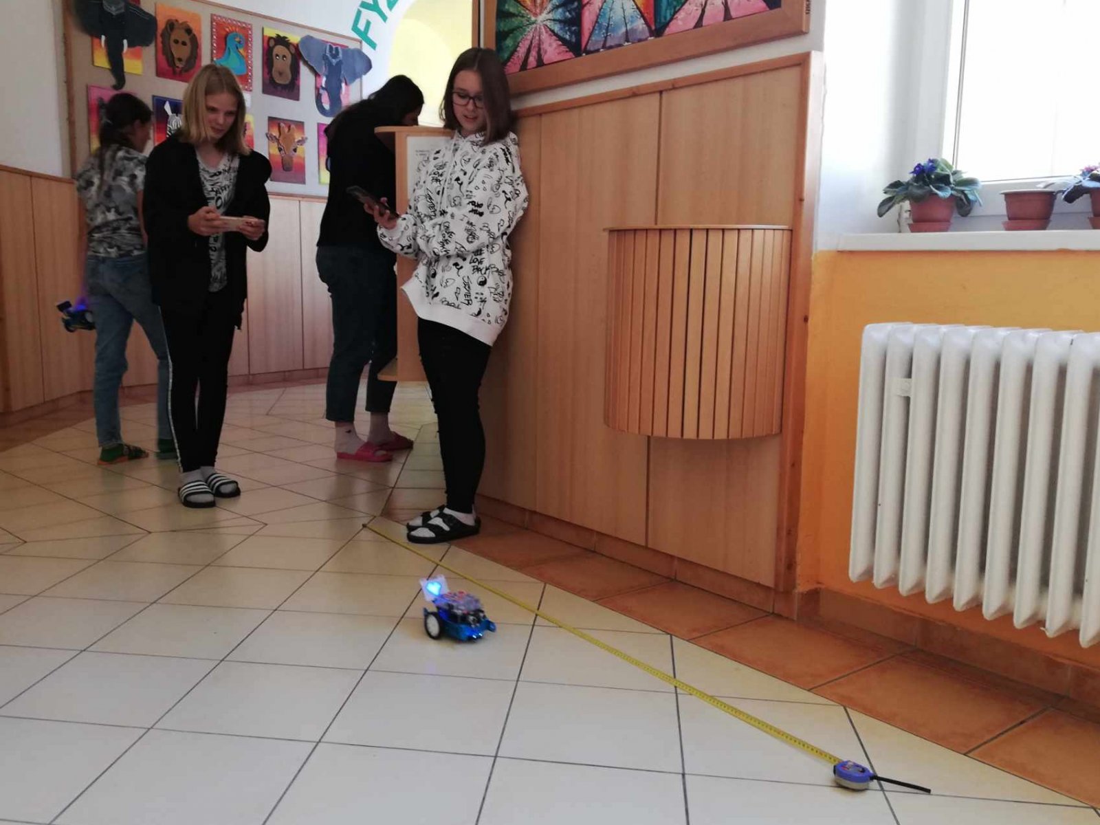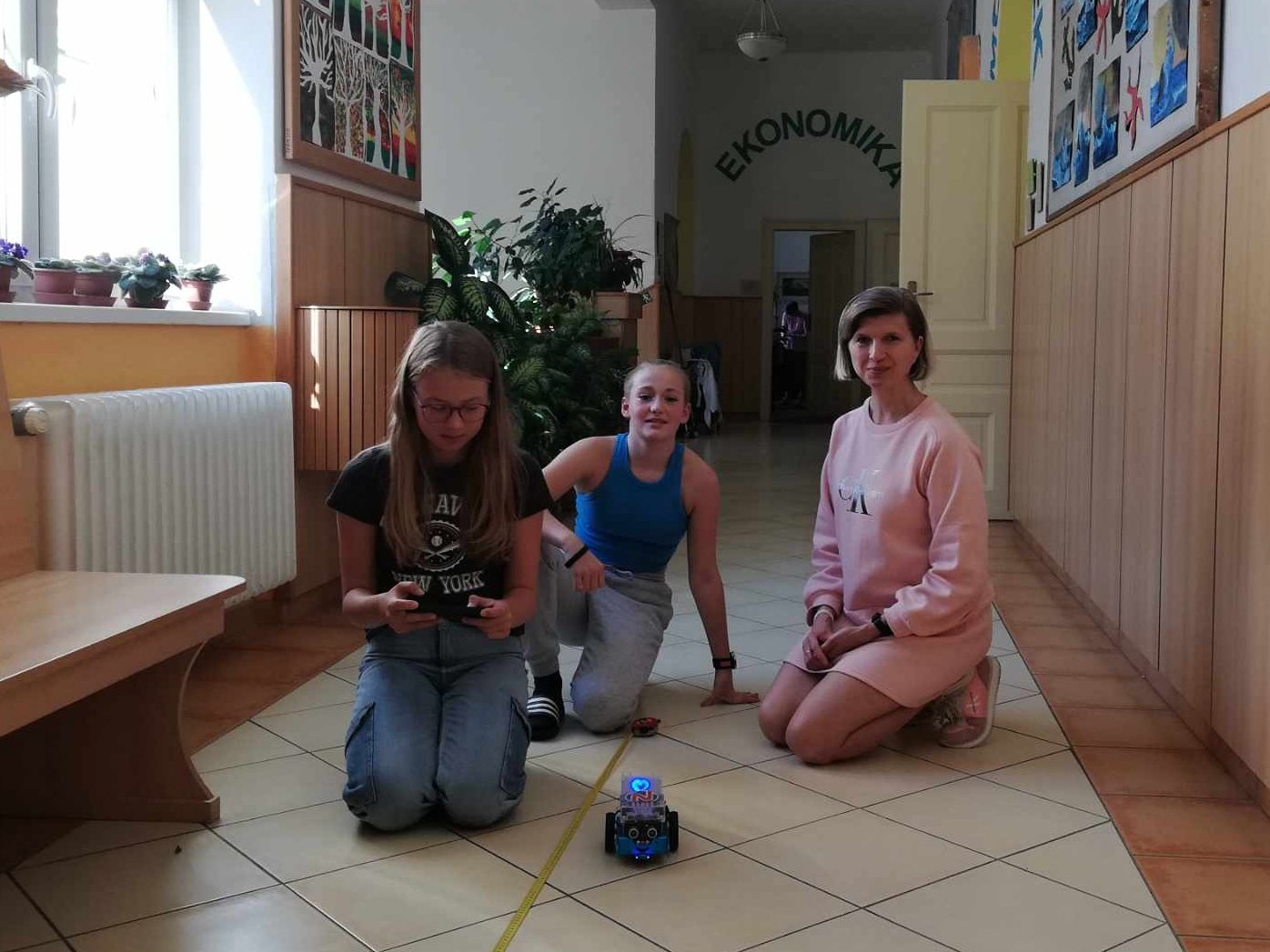 U nás neučíme fyziku jen ve třídě. Aktuálně se žáci 7. ročníku věnují tématu o rovnoměrném pohybu tělesa. Rozdělují pohyb, popisují trajektorie těles a počítají jejich rychlost. Jako pohybující se těleso posloužil oblíbený robot - mBot. K určení rychlosti nám tak už stačil pouze metr, izolační páska a mobil. Na chodbě si každá dvojice žáků vymezila svoji dráhu a změřila potřebný čas k ujetí této dráhy. Při výpočtu rychlosti robota se někteří malinko potrápili s jednotkami. Pomocí vrstevnického učení, které je na naší škole běžnou součástí výuky, se však všem žákům podařilo určit rychlost robota i v kilometrech za hodinu.