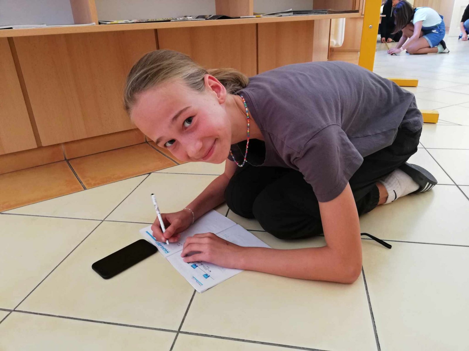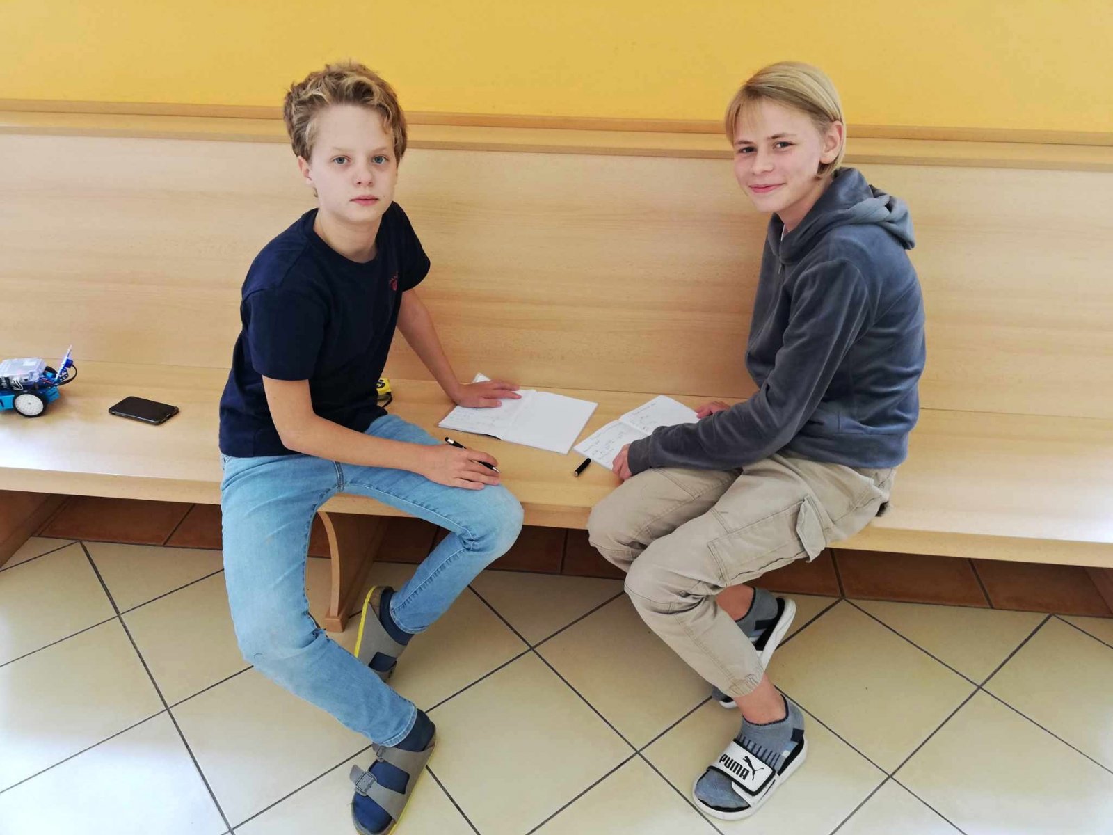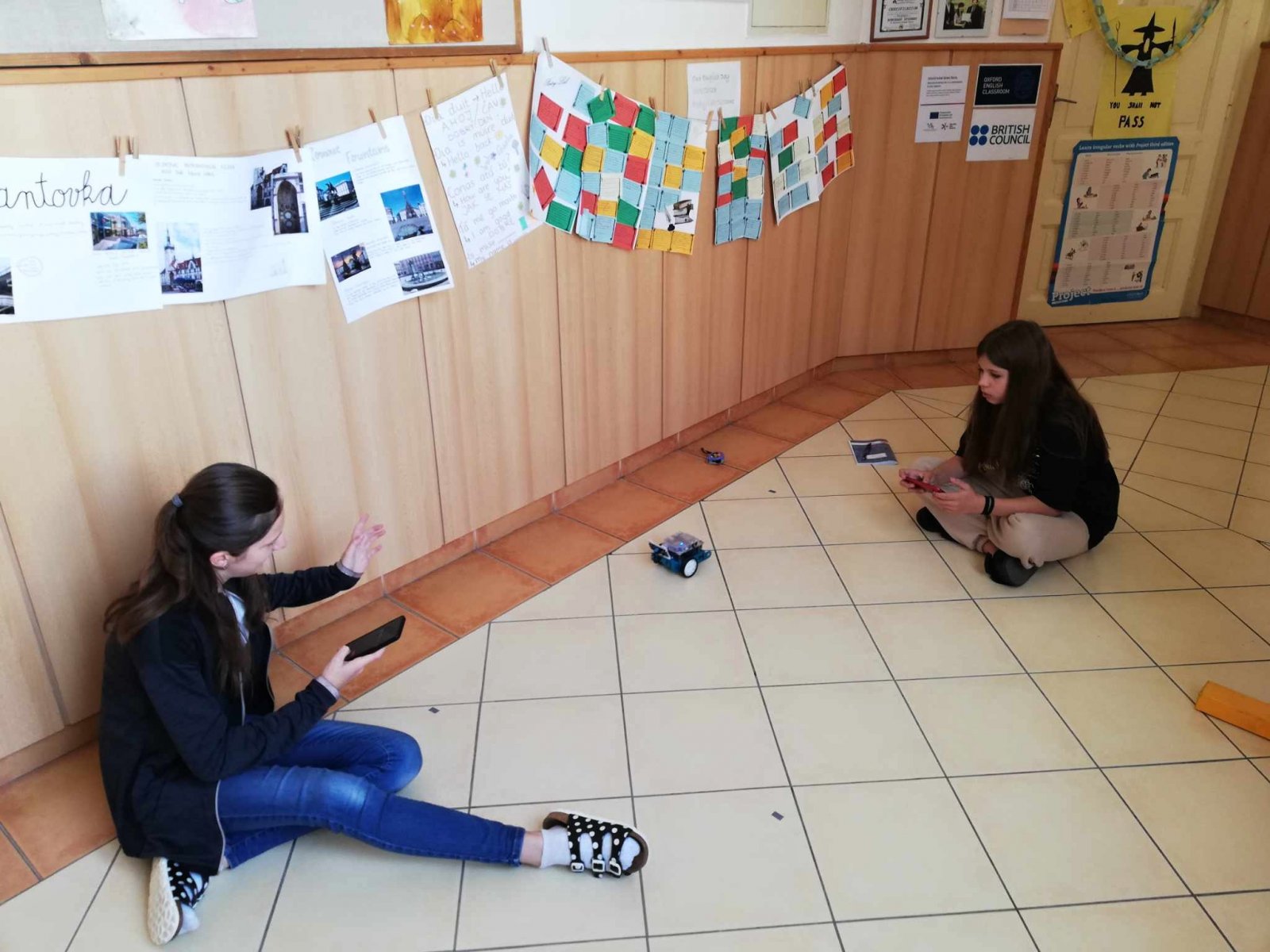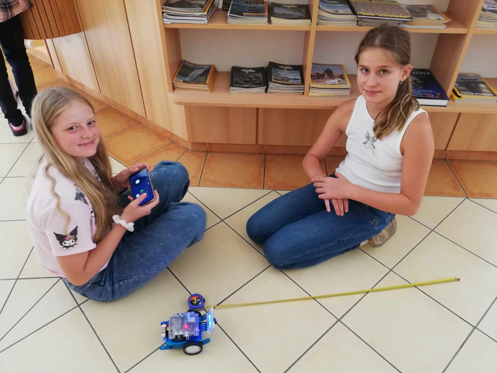 U nás neučíme fyziku jen ve třídě. Aktuálně se žáci 7. ročníku věnují tématu o rovnoměrném pohybu tělesa. Rozdělují pohyb, popisují trajektorie těles a počítají jejich rychlost. Jako pohybující se těleso posloužil oblíbený robot - mBot. K určení rychlosti nám tak už stačil pouze metr, izolační páska a mobil. Na chodbě si každá dvojice žáků vymezila svoji dráhu a změřila potřebný čas k ujetí této dráhy. Při výpočtu rychlosti robota se někteří malinko potrápili s jednotkami. Pomocí vrstevnického učení, které je na naší škole běžnou součástí výuky, se však všem žákům podařilo určit rychlost robota i v kilometrech za hodinu.