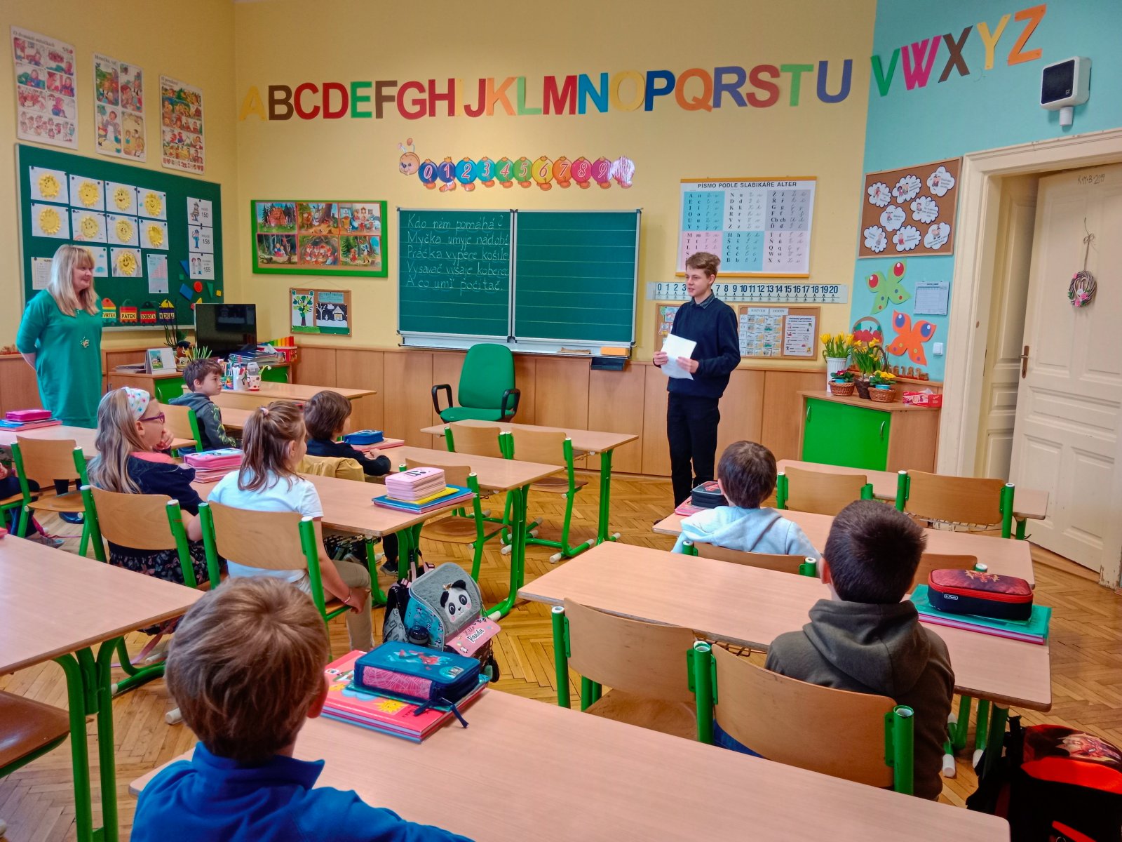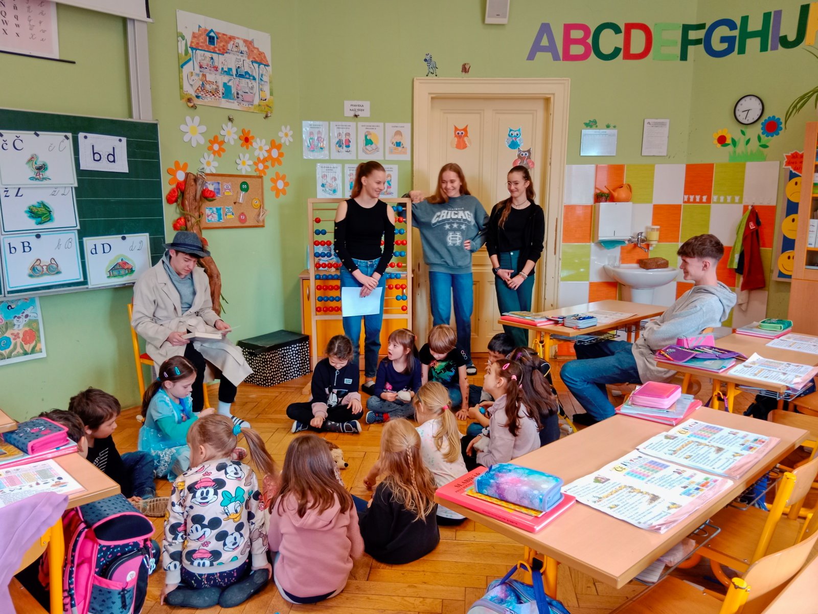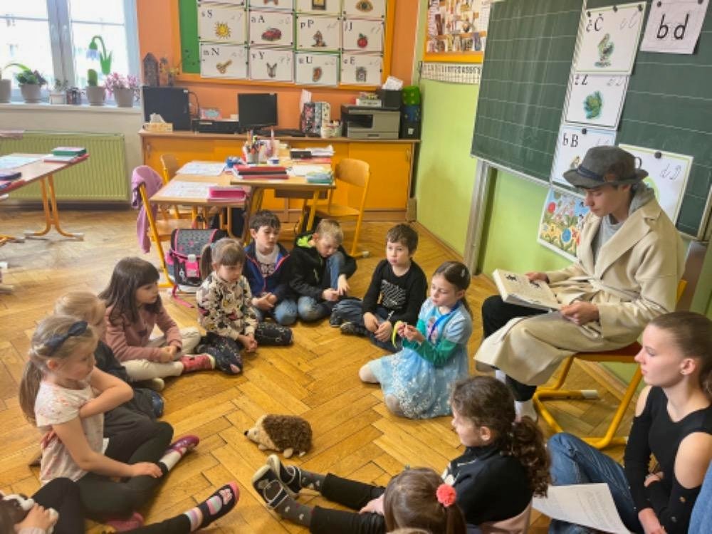 V pátek 24. března jsme byli svědky neskrývané radosti na tvářích našich nejmenších, když k nim zavítali žáci devátých tříd. Sestoupivše s piedestalů ostřílených matadorů zpět k nevinnosti pohádkového světa, s nezištným nasazením vykouzlili nejeden úsměv. Několik z nich, převlečeno za mystické bytosti, vkročilo s nadpřirozeným entrée a svými čtenářskými pomocníky mezi očekávání plnou drobotinu, jíž předčítali z pohádkových knížek. Neskrývané emoce v očích prvňáčků oddaně poslouchajících jejich nejstarší spolužáky byly největší odměnou nejen nám, ale i samotným deváťákům. V průběhu programu deváťáci nezapomněli zmínit, že státi se dobrým čtenářem sice vyžaduje píli a úsilí, avšak nemalou odměnou jim bude radost z přečtených knih, s nimiž zažijí spousty dobrodružství, a že čtenářství je zkrátka um, který se jim už nikdy v životě neztratí.