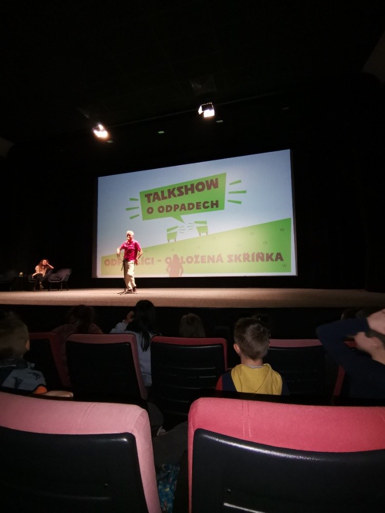 Návštěva kina Metropol a zhlédnutí programu s názvem „Kouzelná odpadová talkshow“ byla přirozeným pokračováním našeho snažení o zachování zdraví naší planety. Pořad byl zacílený na mladší věkovou skupinu, tedy žáky 1. stupně. Dětem bylo slovně i obrazem vysvětleno, jak vzniklý odpad správně třídit, a prostřednictvím krátkých filmů jim byly sděleny cenné informace, jak lze odpad recyklovat, aby dále sloužil lidem. Krátká soutěž měla pro naše žáky radostný průběh, protože z množství dobrovolníků byli vybráni hned dva zástupci z naší školy a nevedli si špatně.