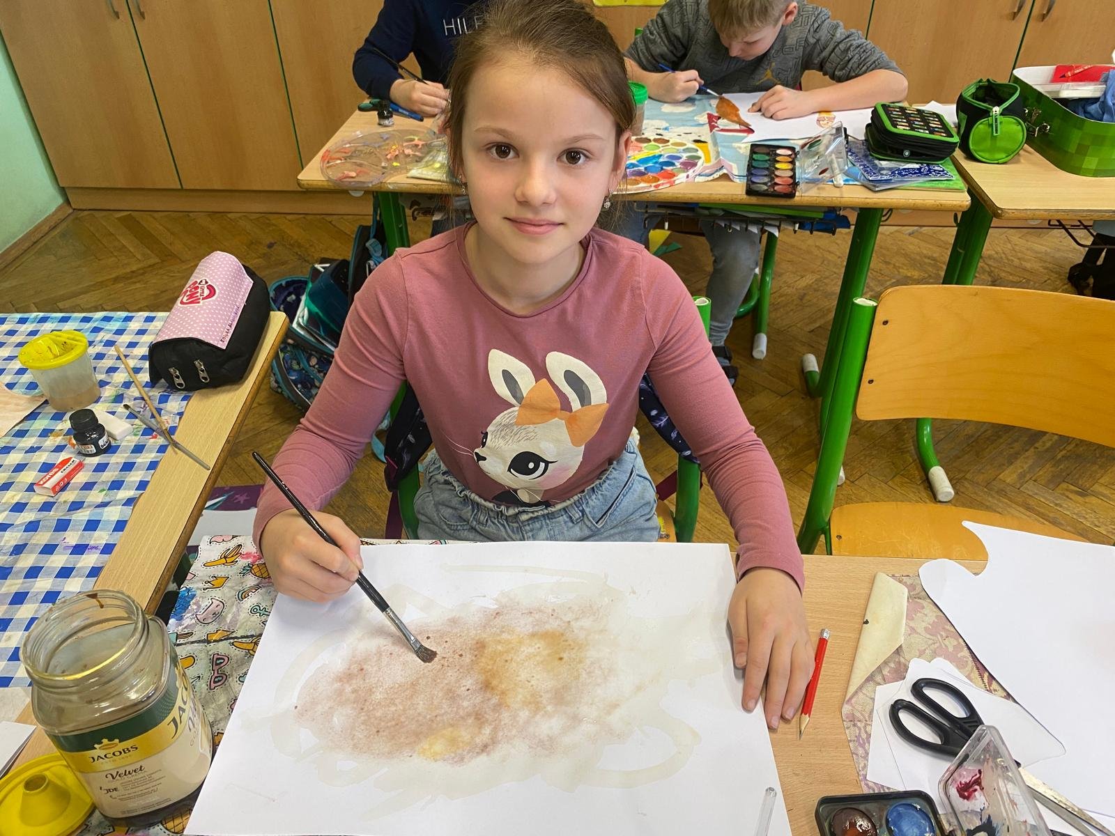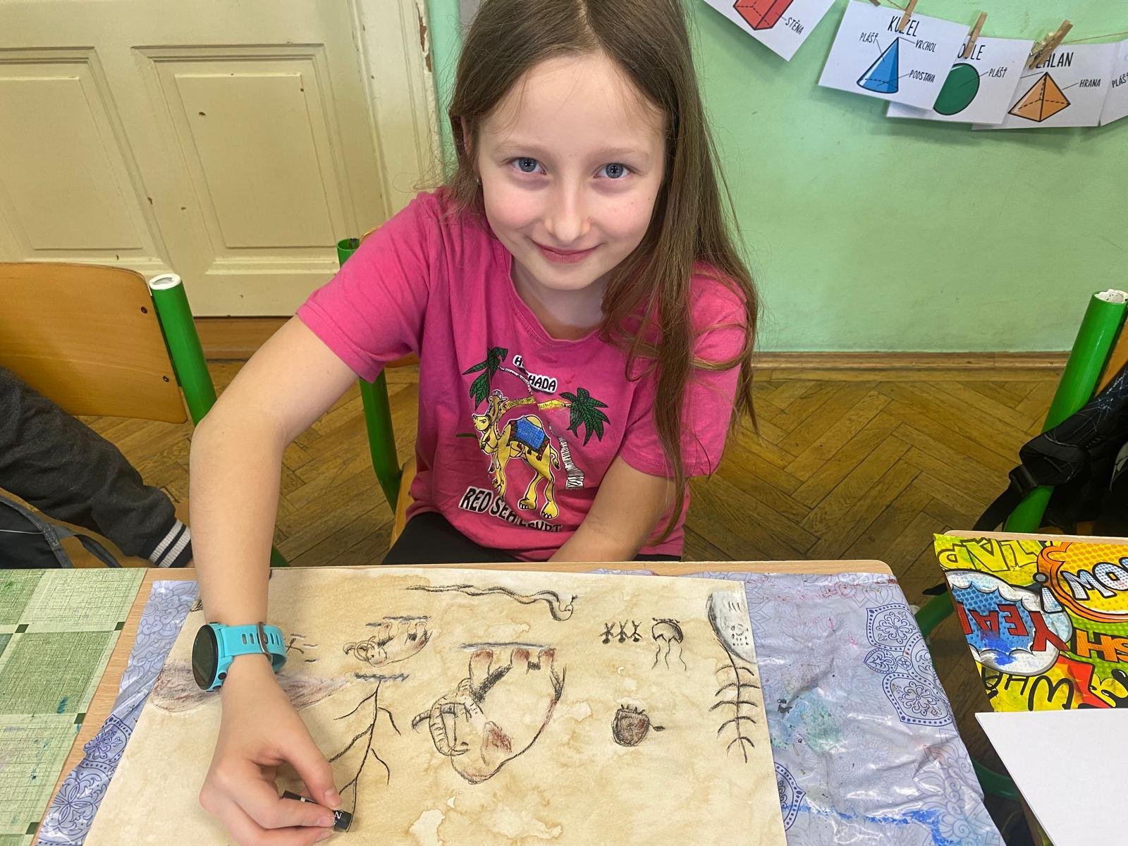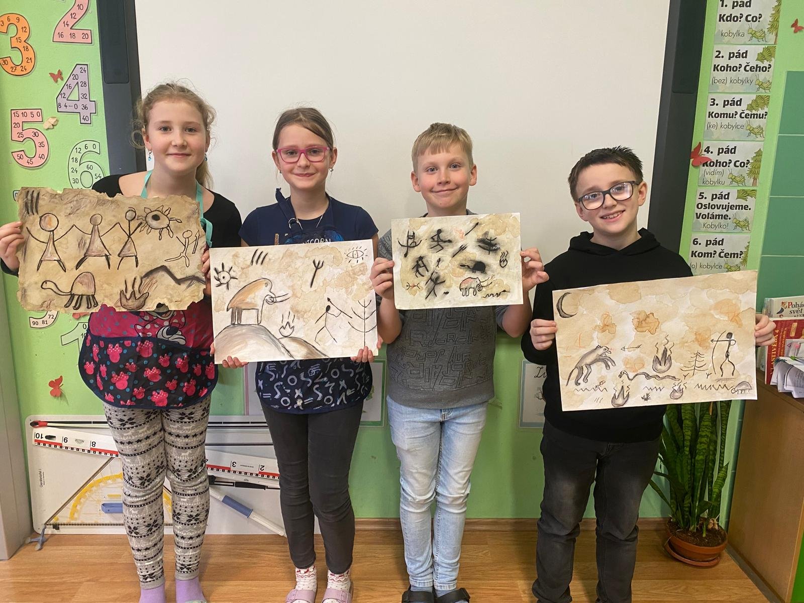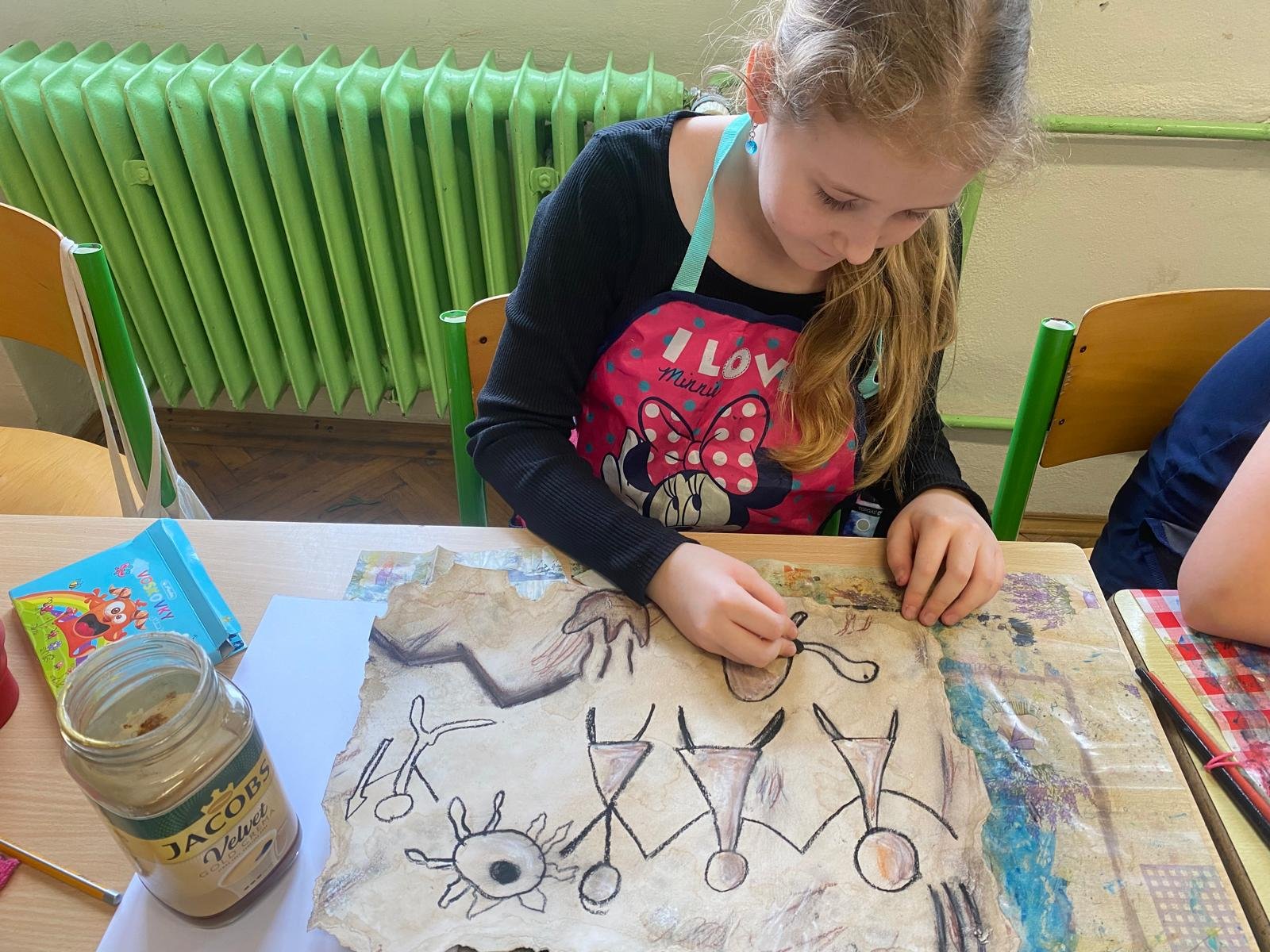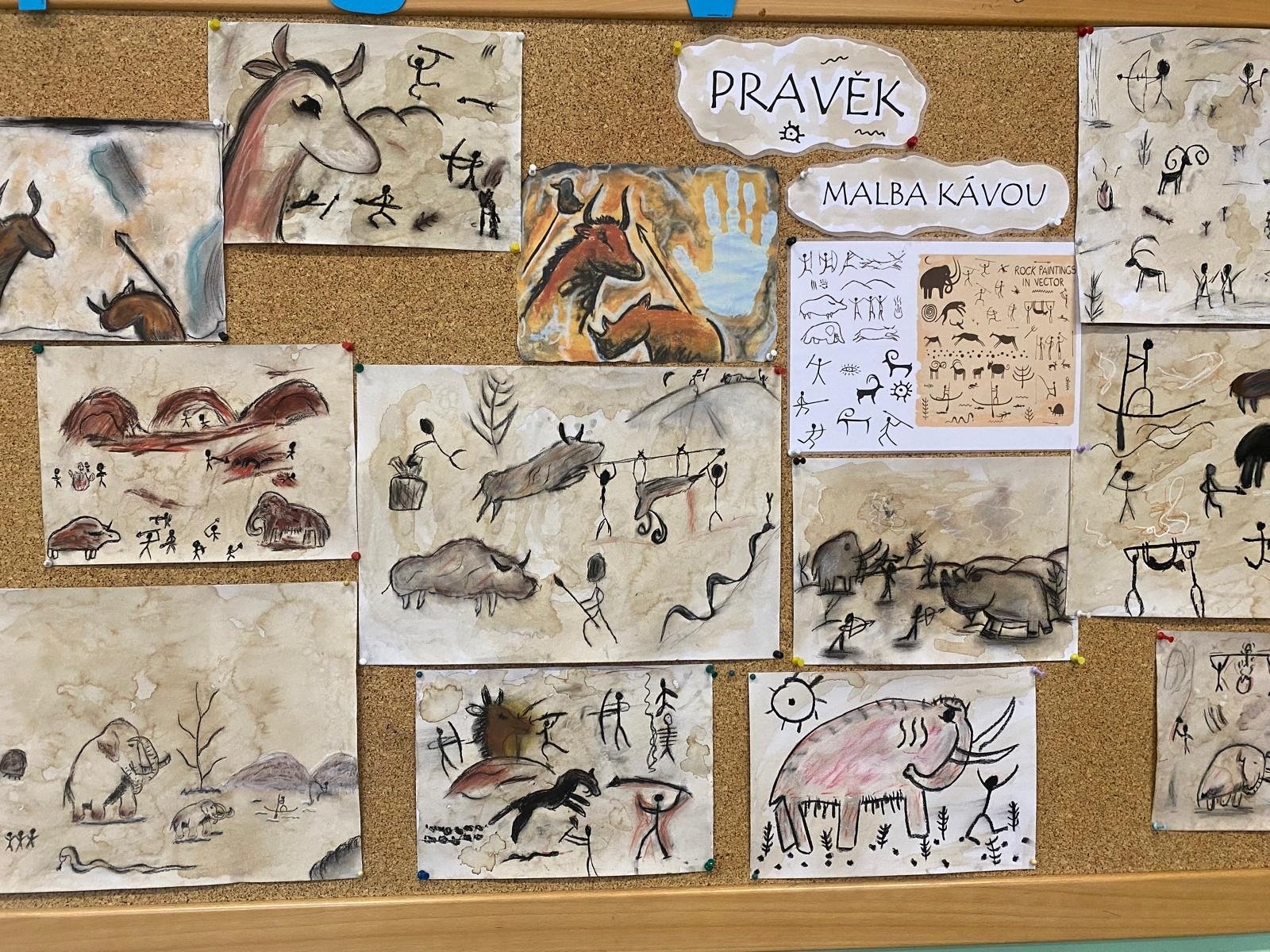 Malba kávou jako nekonvenční umělecká technika propojila témata výtvarné výchovy s pravěkem, kterým se zabýváme ve vlastivědě ve čtvrté třídě. Výsledkem jsou fascinující obrazy pravěkých scén vytvořené touto originální metodou. Přidaným bonusem byl nejen vizuální zážitek, ale i příjemná vůně kávy prolínající se celou třídou. Tato netradiční technika zaujala děti a přinesla do výuky nový, kreativní rozměr.