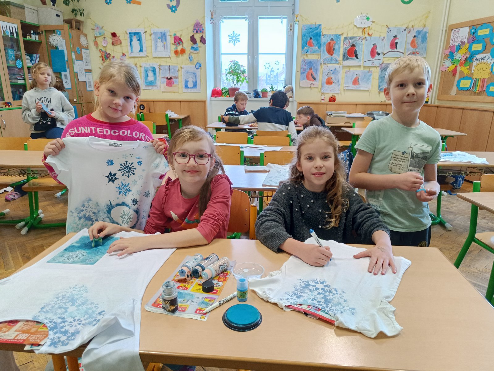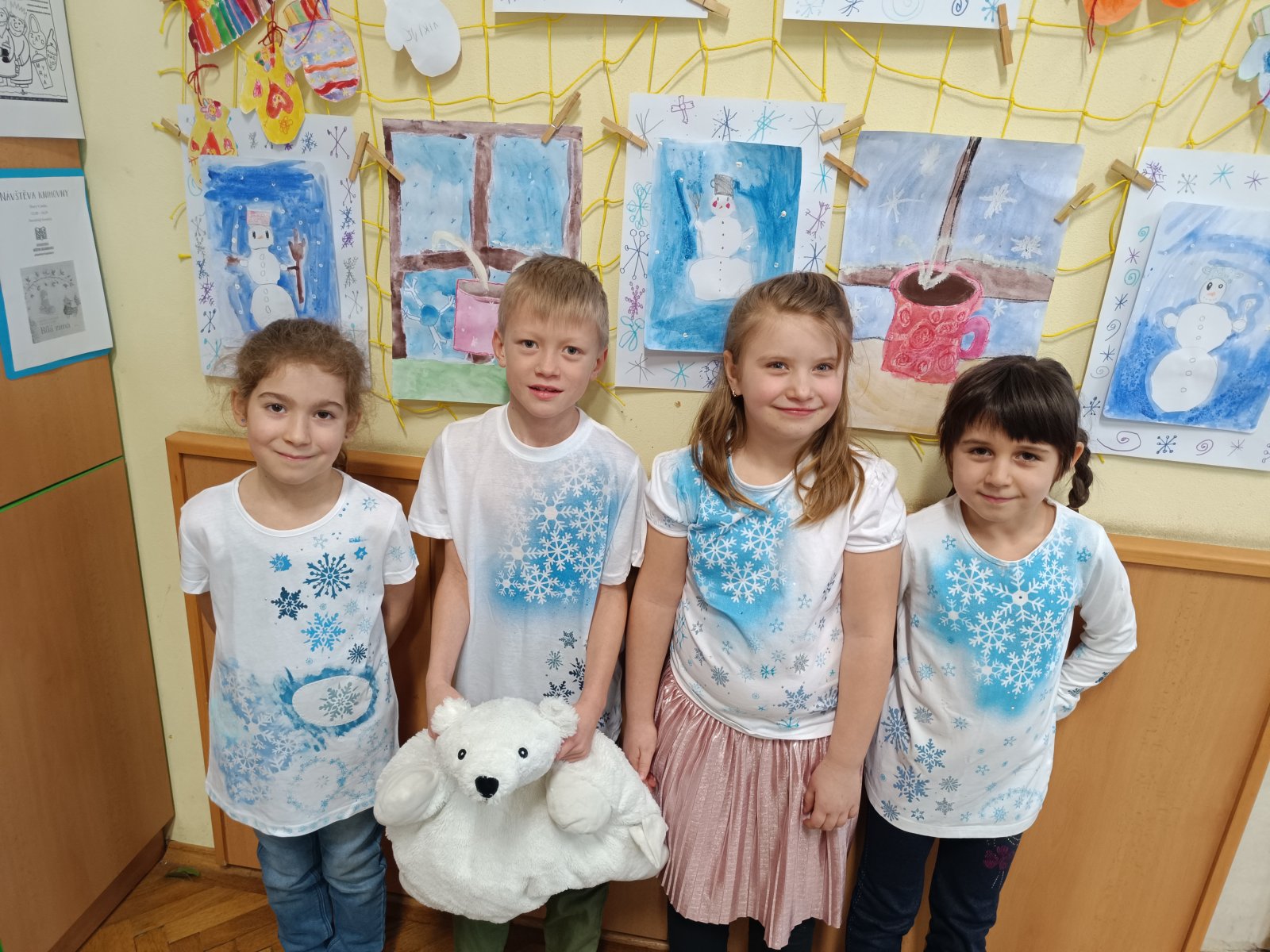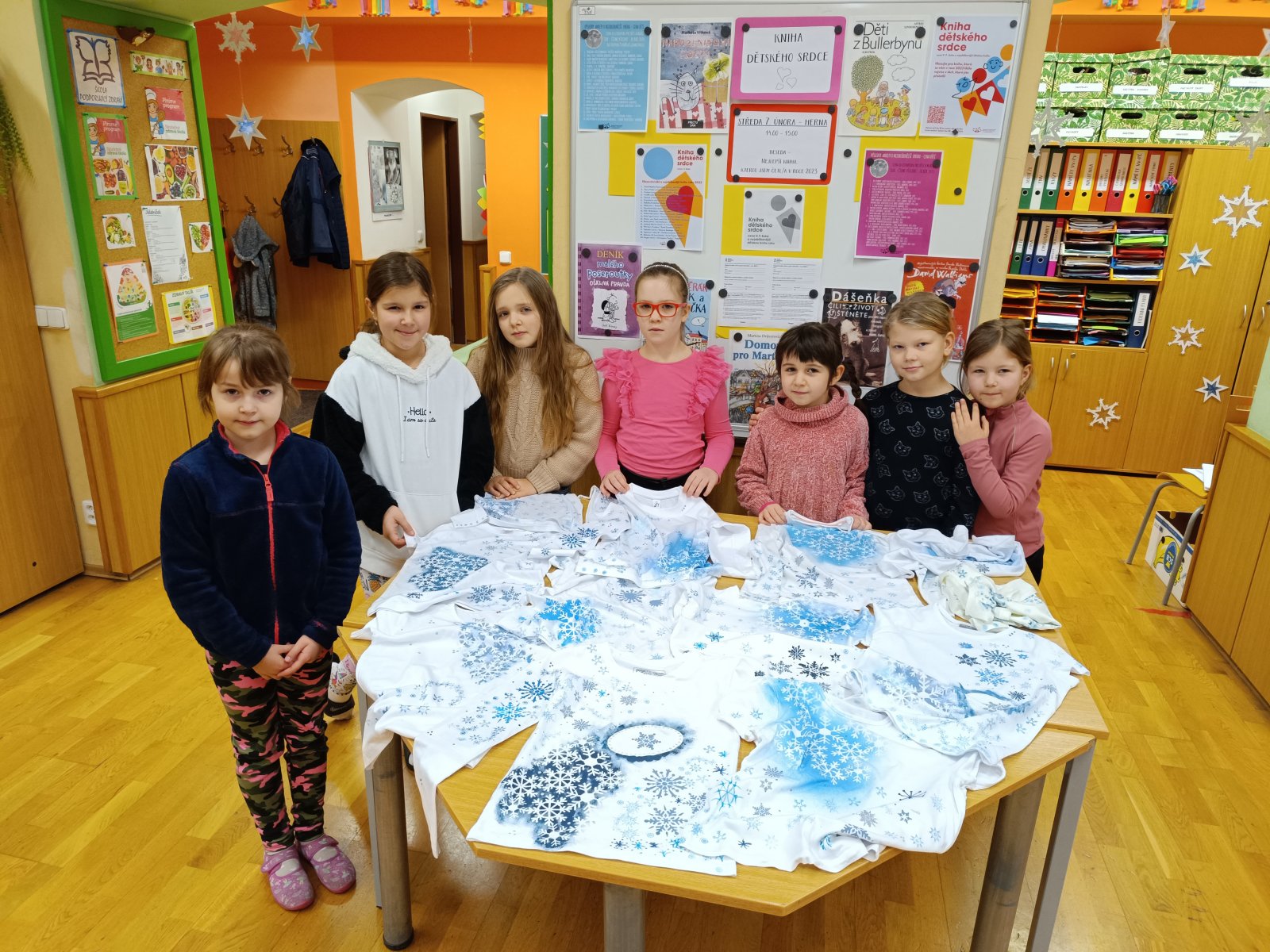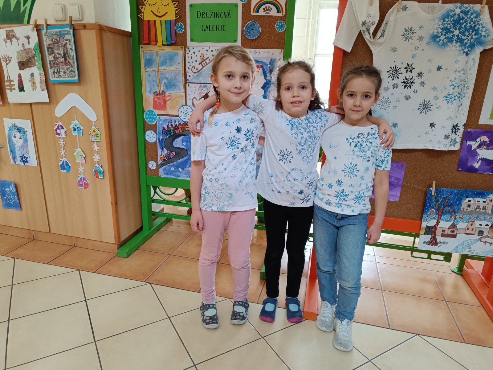 S využitím různých výtvarných technik, s použitím snad všech odstínů modré barvy a velkou dávkou šikovnosti a trpělivosti si vytvořily trička se zimní tematikou.