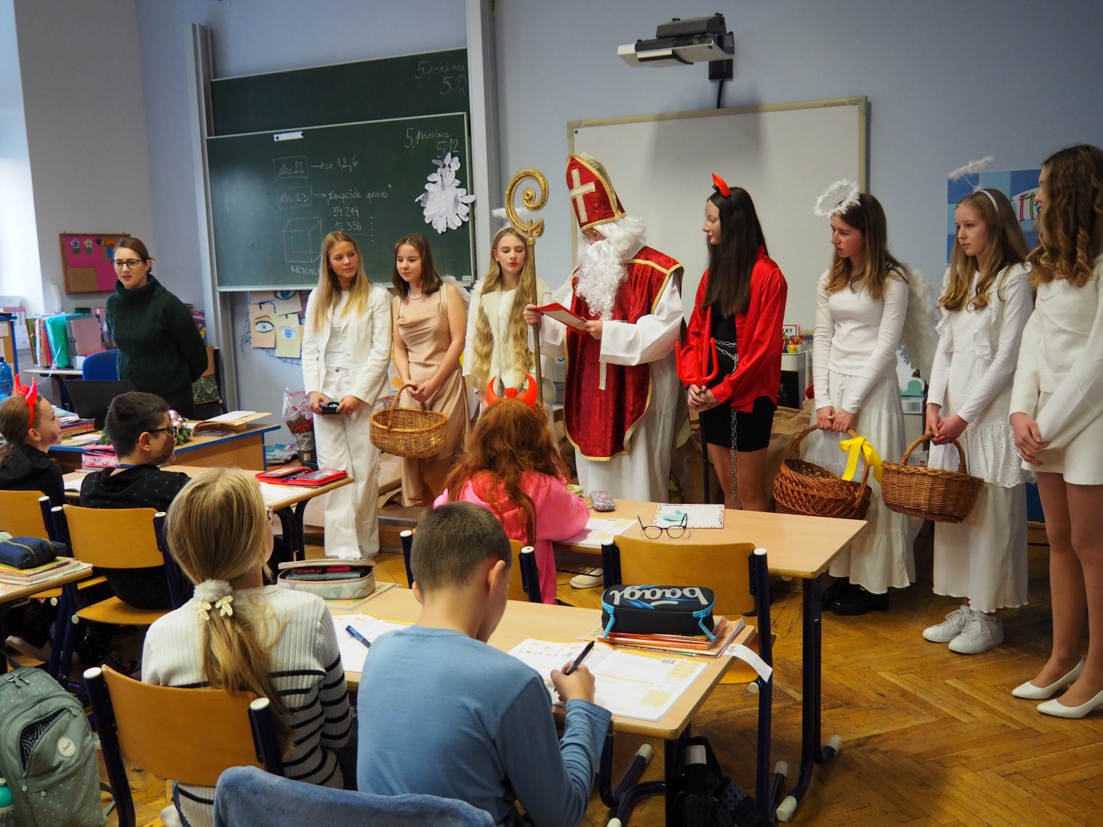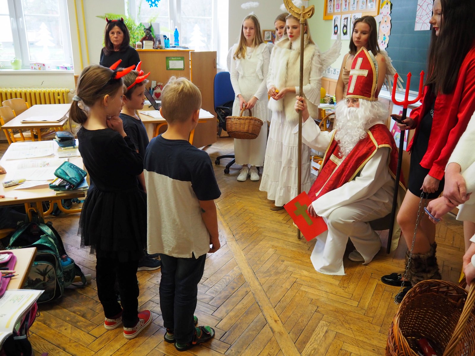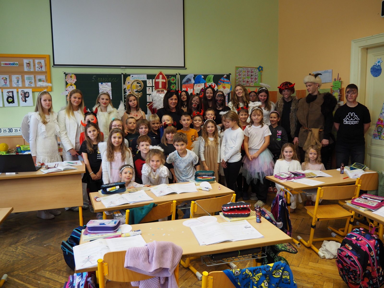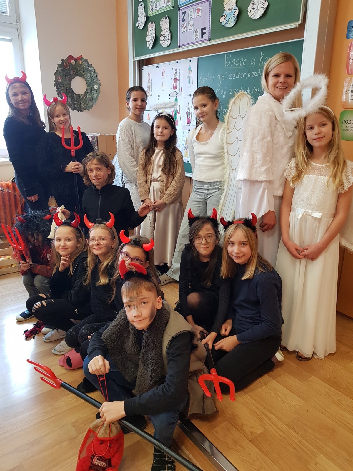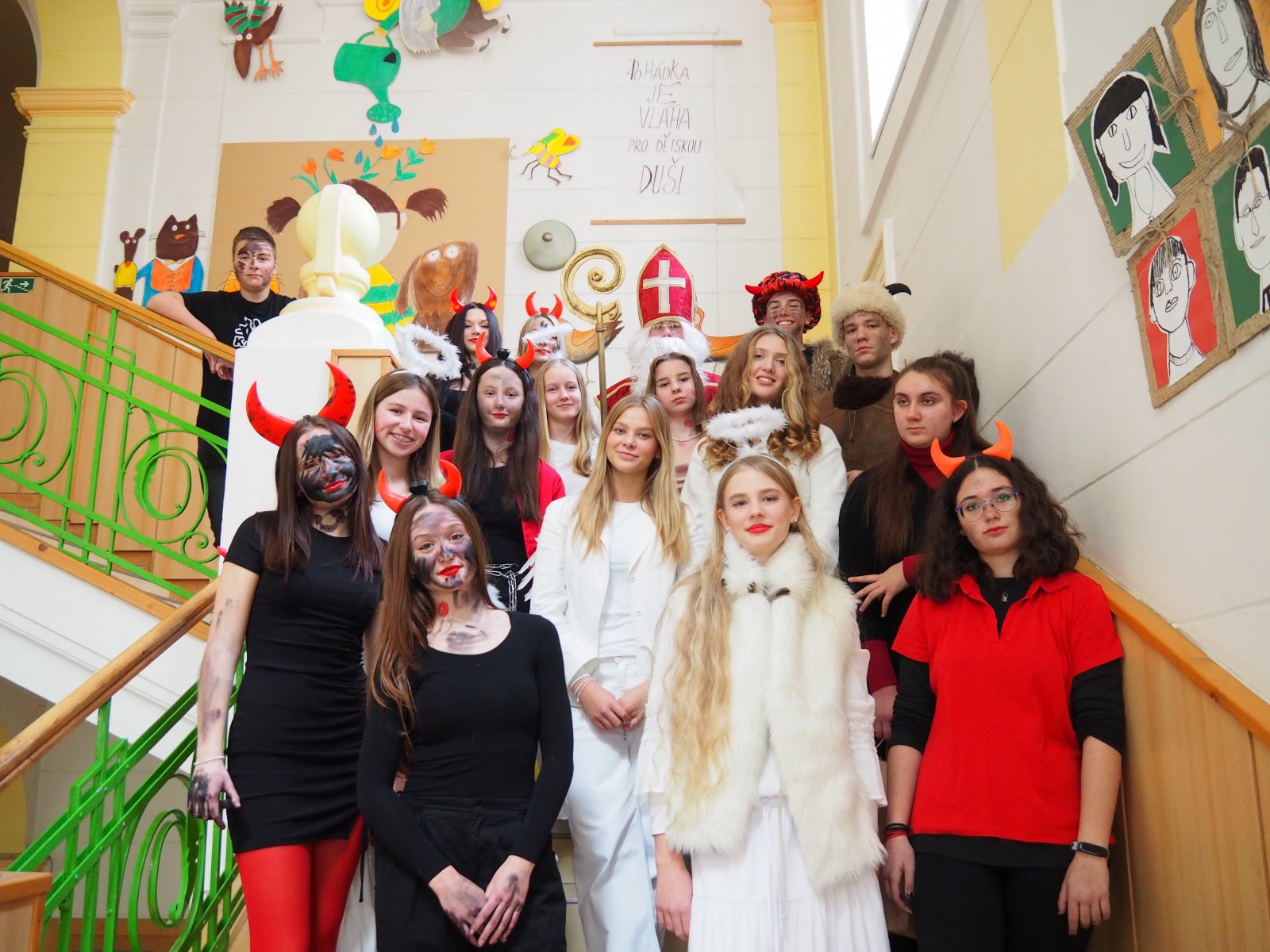 Letos opět po roce si naši deváťáci s radostí připravili pro mladší ročníky mikulášskou nadílku. Žáci 9. A i 9. B si pečlivě připravili své kostýmy, ve kterých si v přestrojení za čerty, Mikuláše a andílky užili spoustu zábavy. Postupně skupiny žáku z devítek zavítaly do všech tříd a na chvíli vstoupily do výuky. Stateční prvňáčci se nedali zastrašit spoustou čertů a nebojácně je zaháněli kouzelným pírkem, a dokonce se jim nestyděli přečíst ze Slabikářů. Mikuláš si vždy poslechl připravené básničky a recitace a z Knihy hříchů vyzval děti, které nebyly zrovna hodné k příslibu polepšení se a u vyšších ročníků musely „zlobivé“ děti splnit některým aktivity symbolizující jejich vykoupení z hříchů. Andílci však vždy rozdali všem dětem čokoládovou nadílku a ozdobili tváře dětí kamínky a třpytkami. Čerti naopak tváře zašpinila sazemi. Den to byl veselý a deváťáci si jej jako každoročně užili.
