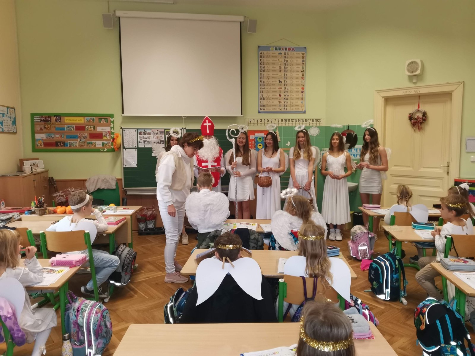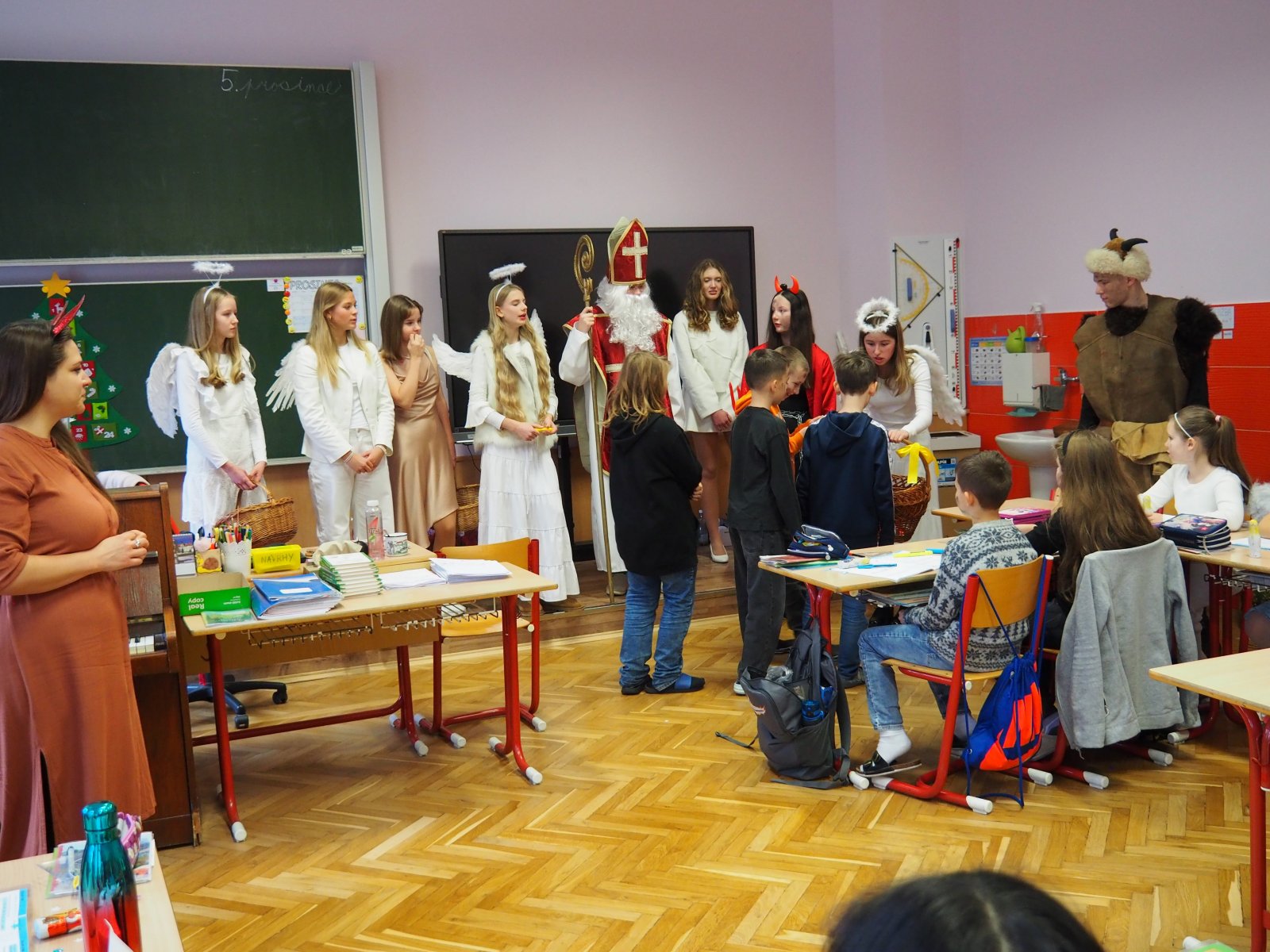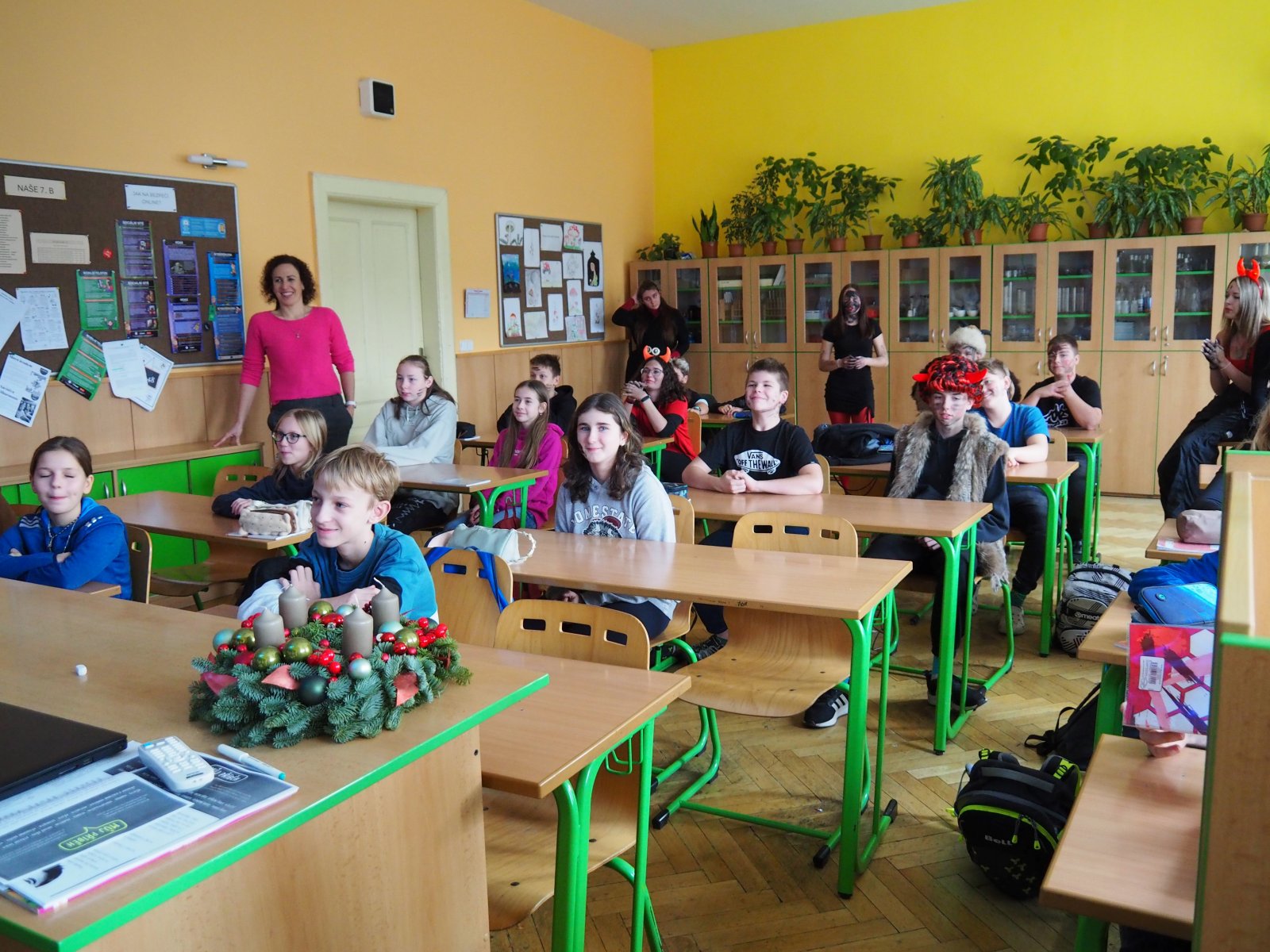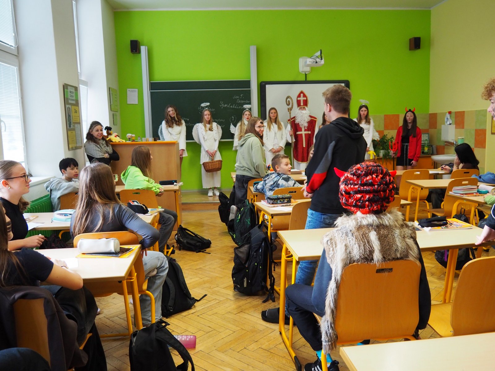 Letos opět po roce si naši deváťáci s radostí připravili pro mladší ročníky mikulášskou nadílku. Žáci 9. A i 9. B si pečlivě připravili své kostýmy, ve kterých si v přestrojení za čerty, Mikuláše a andílky užili spoustu zábavy. Postupně skupiny žáku z devítek zavítaly do všech tříd a na chvíli vstoupily do výuky. Stateční prvňáčci se nedali zastrašit spoustou čertů a nebojácně je zaháněli kouzelným pírkem, a dokonce se jim nestyděli přečíst ze Slabikářů. Mikuláš si vždy poslechl připravené básničky a recitace a z Knihy hříchů vyzval děti, které nebyly zrovna hodné k příslibu polepšení se a u vyšších ročníků musely „zlobivé“ děti splnit některým aktivity symbolizující jejich vykoupení z hříchů. Andílci však vždy rozdali všem dětem čokoládovou nadílku a ozdobili tváře dětí kamínky a třpytkami. Čerti naopak tváře zašpinila sazemi. Den to byl veselý a deváťáci si jej jako každoročně užili.