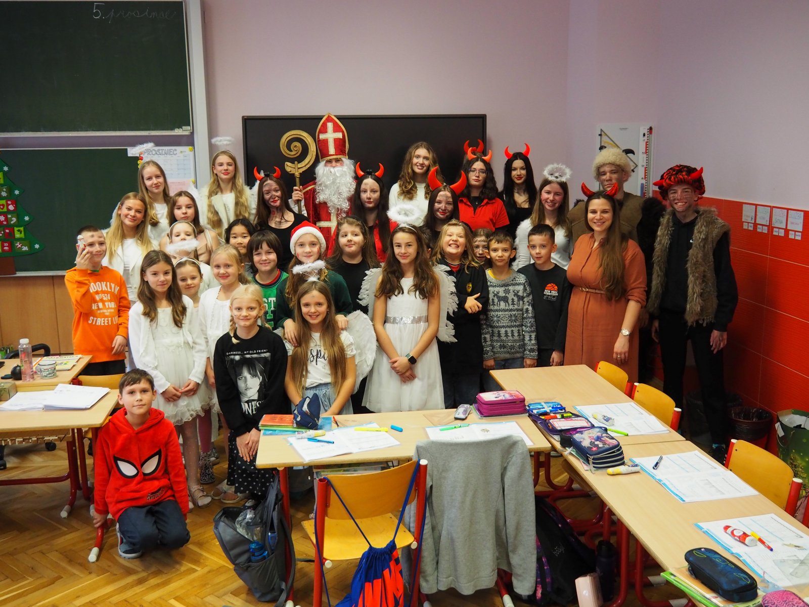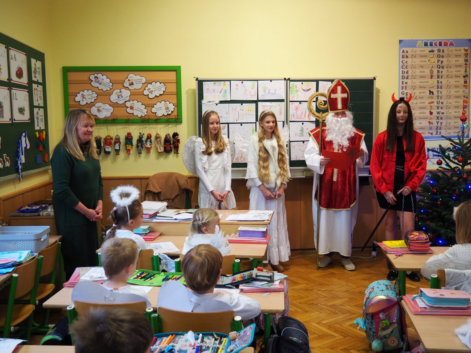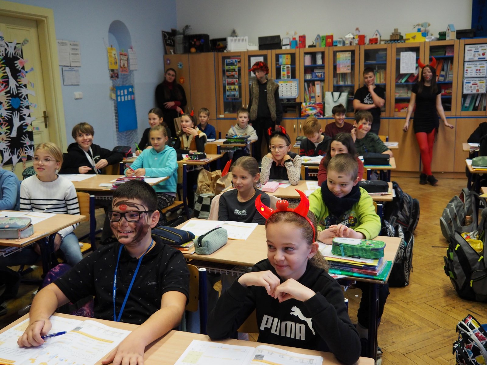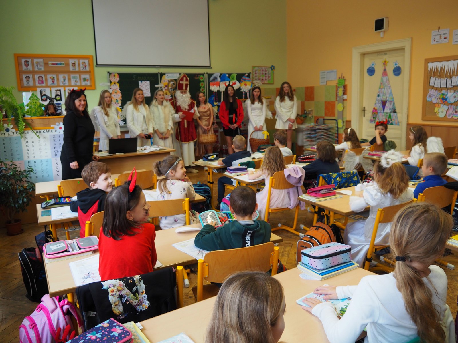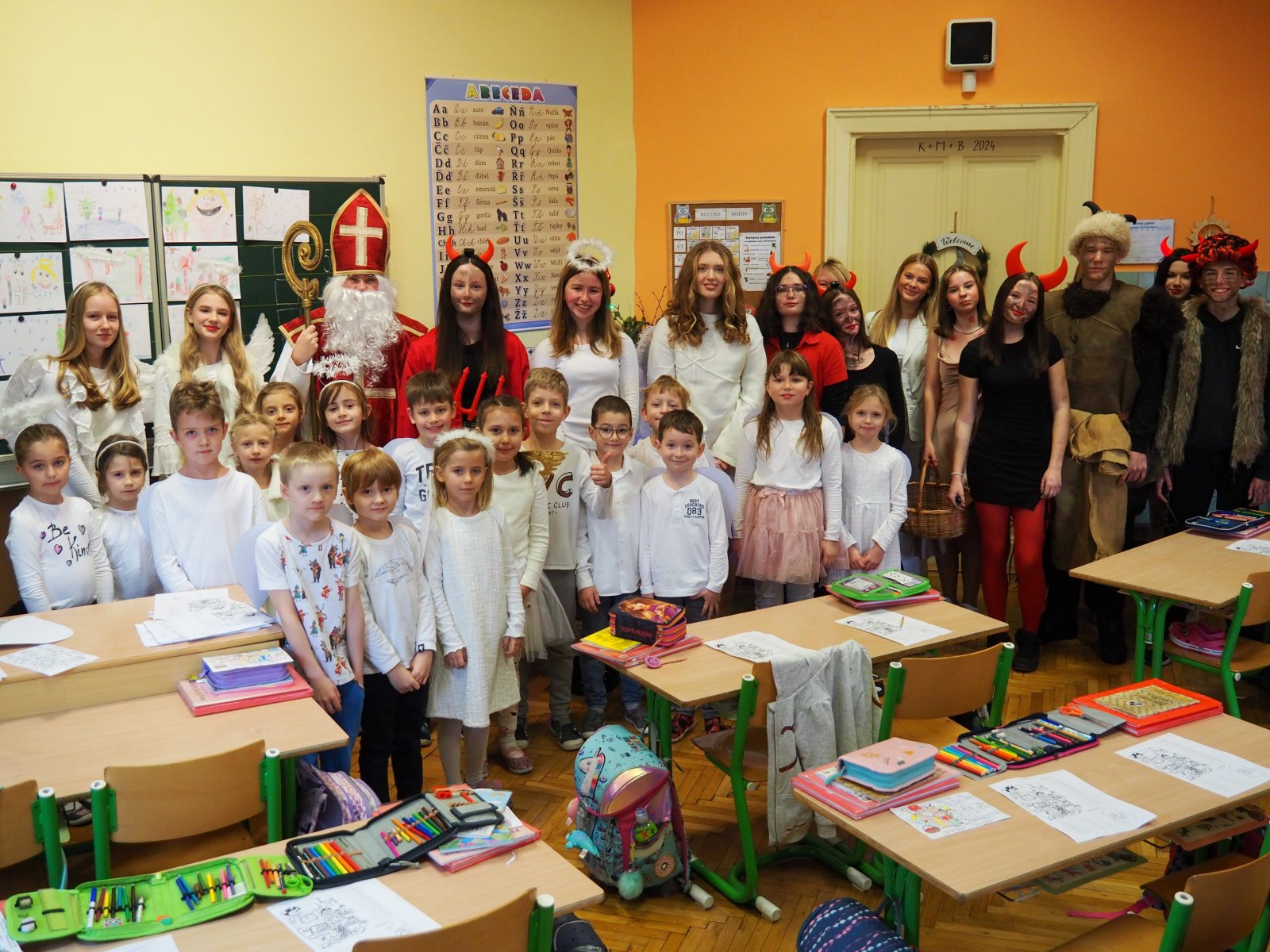 Letos opět po roce si naši deváťáci s radostí připravili pro mladší ročníky mikulášskou nadílku. Žáci 9. A i 9. B si pečlivě připravili své kostýmy, ve kterých si v přestrojení za čerty, Mikuláše a andílky užili spoustu zábavy. Postupně skupiny žáku z devítek zavítaly do všech tříd a na chvíli vstoupily do výuky. Stateční prvňáčci se nedali zastrašit spoustou čertů a nebojácně je zaháněli kouzelným pírkem, a dokonce se jim nestyděli přečíst ze Slabikářů. Mikuláš si vždy poslechl připravené básničky a recitace a z Knihy hříchů vyzval děti, které nebyly zrovna hodné k příslibu polepšení se a u vyšších ročníků musely „zlobivé“ děti splnit některým aktivity symbolizující jejich vykoupení z hříchů. Andílci však vždy rozdali všem dětem čokoládovou nadílku a ozdobili tváře dětí kamínky a třpytkami. Čerti naopak tváře zašpinila sazemi. Den to byl veselý a deváťáci si jej jako každoročně užili.