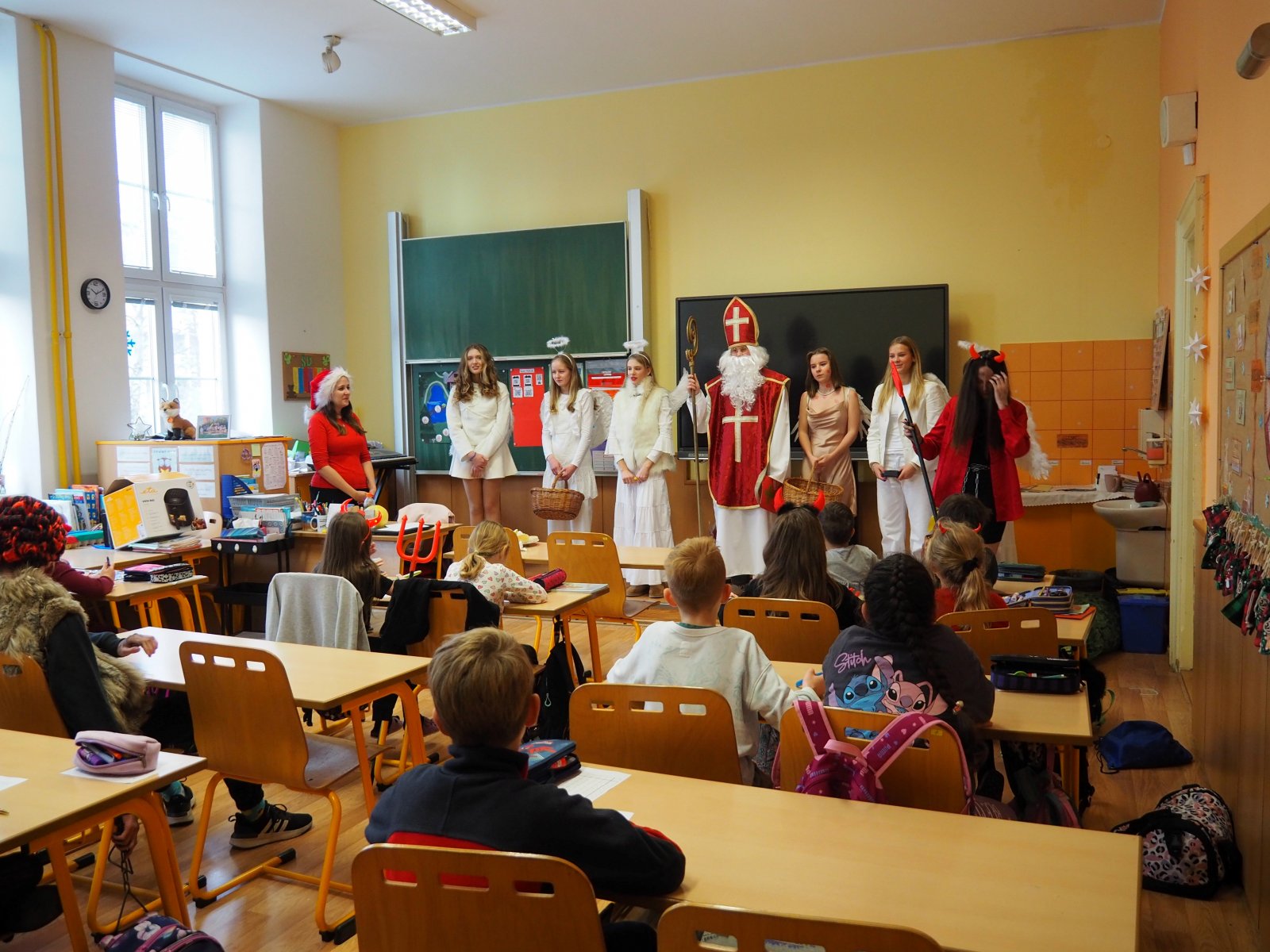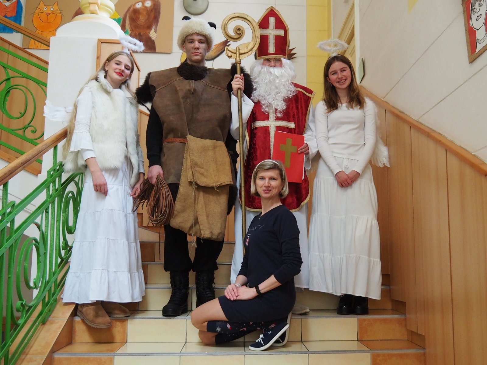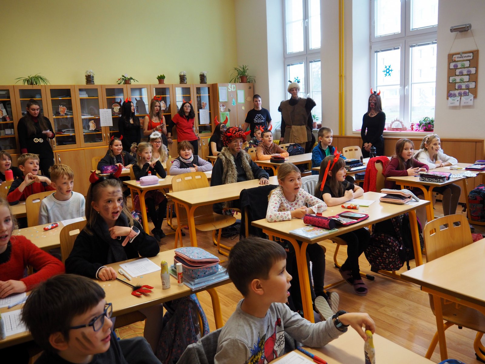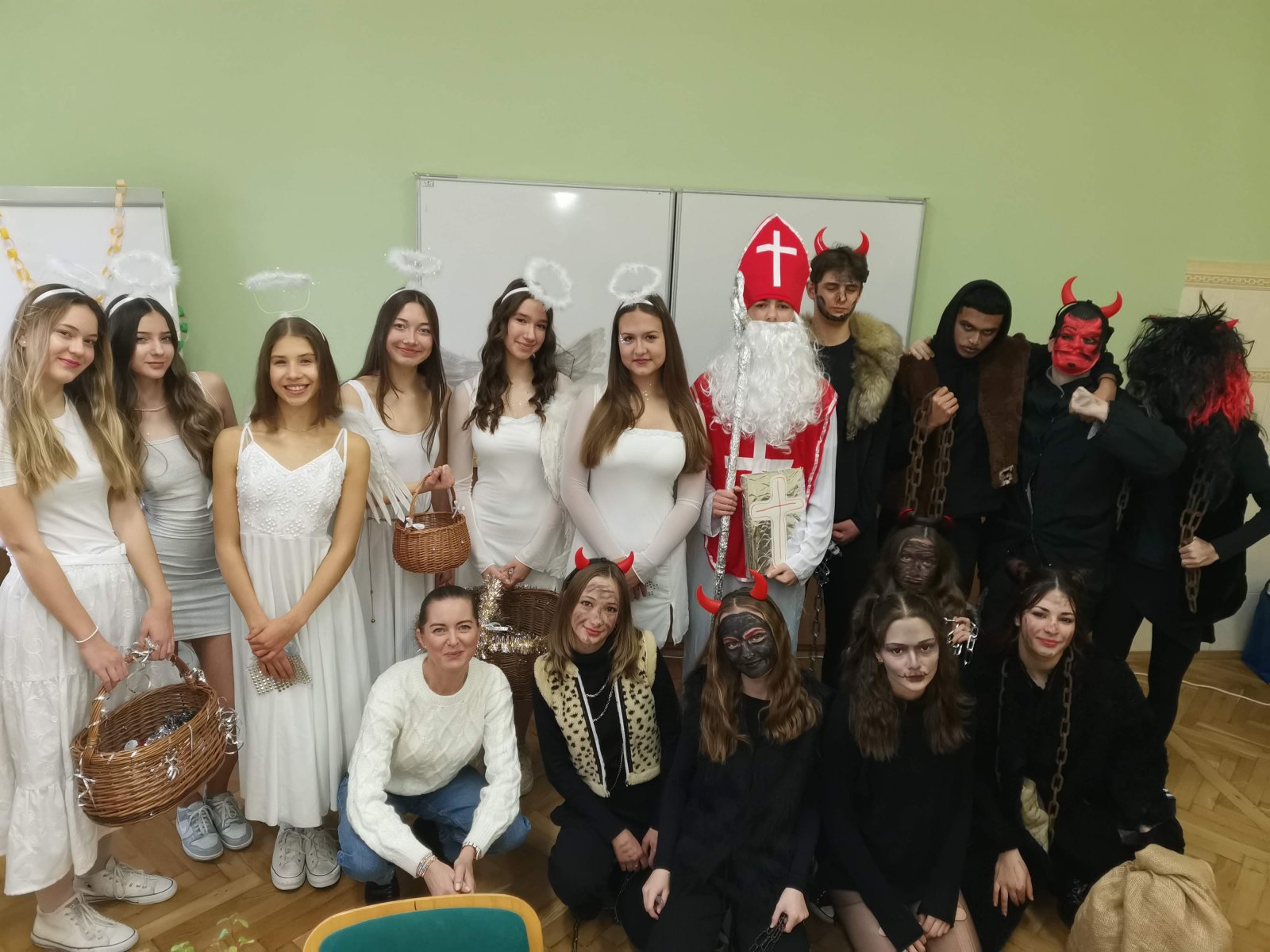 Letos opět po roce si naši deváťáci s radostí připravili pro mladší ročníky mikulášskou nadílku. Žáci 9. A i 9. B si pečlivě připravili své kostýmy, ve kterých si v přestrojení za čerty, Mikuláše a andílky užili spoustu zábavy. Postupně skupiny žáku z devítek zavítaly do všech tříd a na chvíli vstoupily do výuky. Stateční prvňáčci se nedali zastrašit spoustou čertů a nebojácně je zaháněli kouzelným pírkem, a dokonce se jim nestyděli přečíst ze Slabikářů. Mikuláš si vždy poslechl připravené básničky a recitace a z Knihy hříchů vyzval děti, které nebyly zrovna hodné k příslibu polepšení se a u vyšších ročníků musely „zlobivé“ děti splnit některým aktivity symbolizující jejich vykoupení z hříchů. Andílci však vždy rozdali všem dětem čokoládovou nadílku a ozdobili tváře dětí kamínky a třpytkami. Čerti naopak tváře zašpinila sazemi. Den to byl veselý a deváťáci si jej jako každoročně užili.