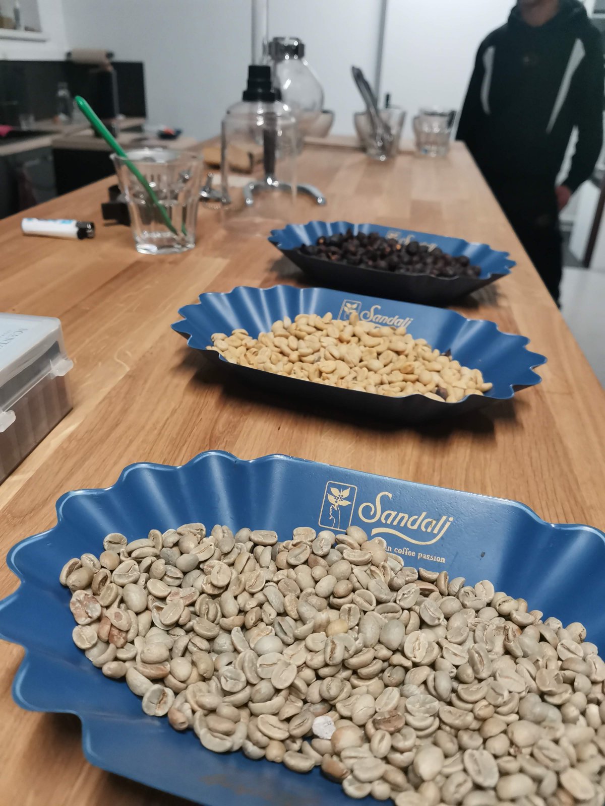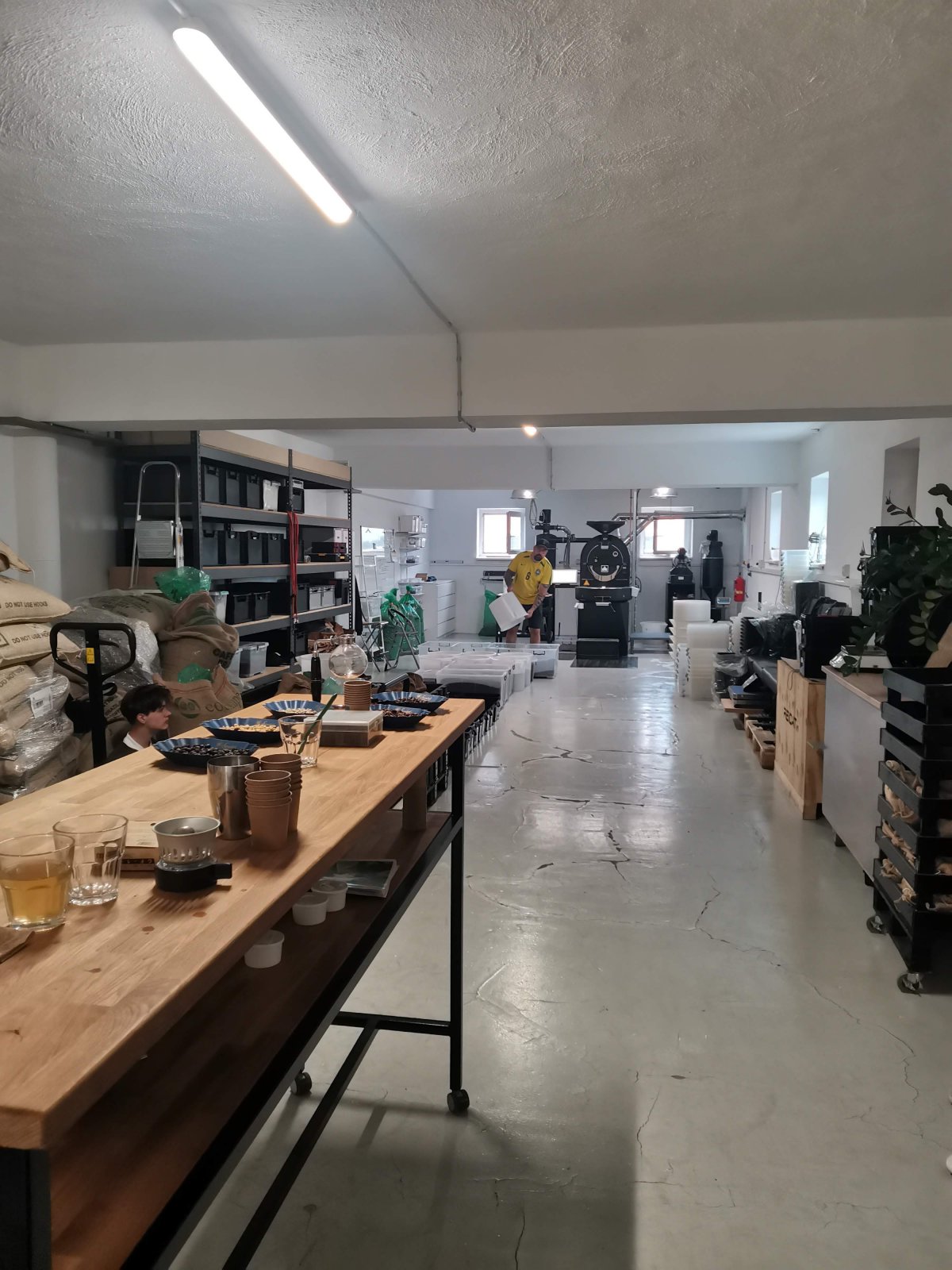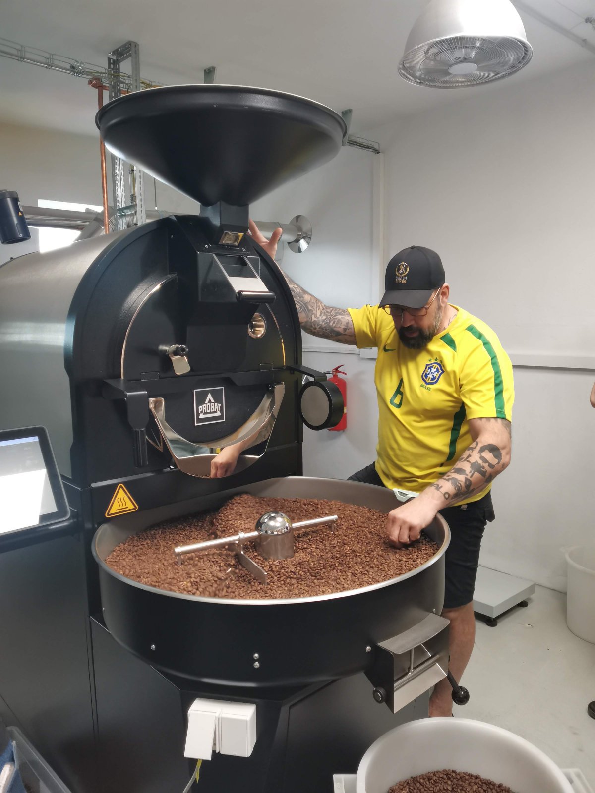 Po krátké přestávce na svačinku jsme se přesunuli za panem Weiserem. Ten nám upřesnil proces pražení kávy. Pražírna funguje tak, že se do bubnu o teplotě 210° C nasypou zelená zrna kávy obalená pergamenem. Při procesu pražení zrna puknou a pergamen se oddělí od zrna a putuje do odpadní části pražírny. Upražená zrna kávy o teplotě 210° C se přesunou do chladící části, kde ji lopatky a vzduch chladí a míchají a následně se přemístí do bedýnek, kde musí odstát minimálně 24 hodin. Teprve pak jsou upražená zrna zabalena a odeslána na zakázku do kaváren.