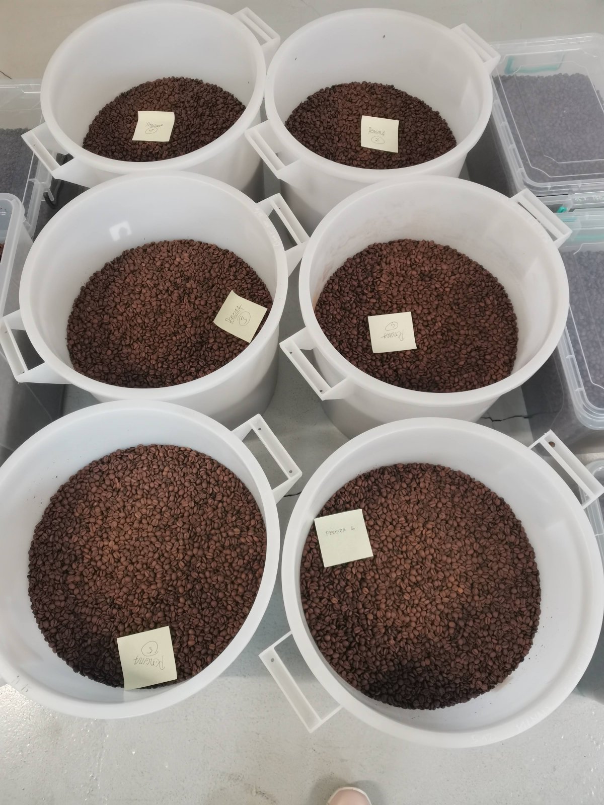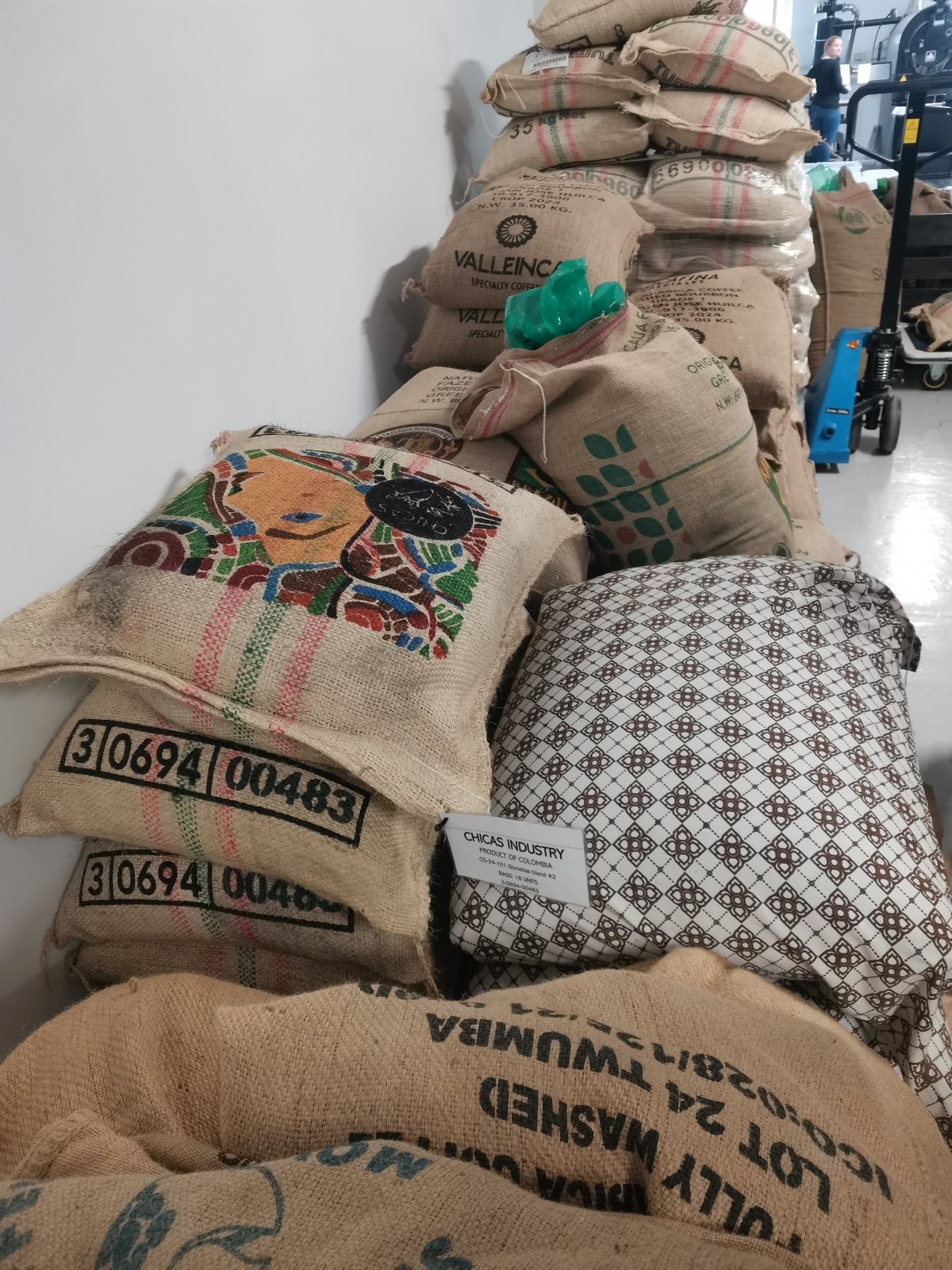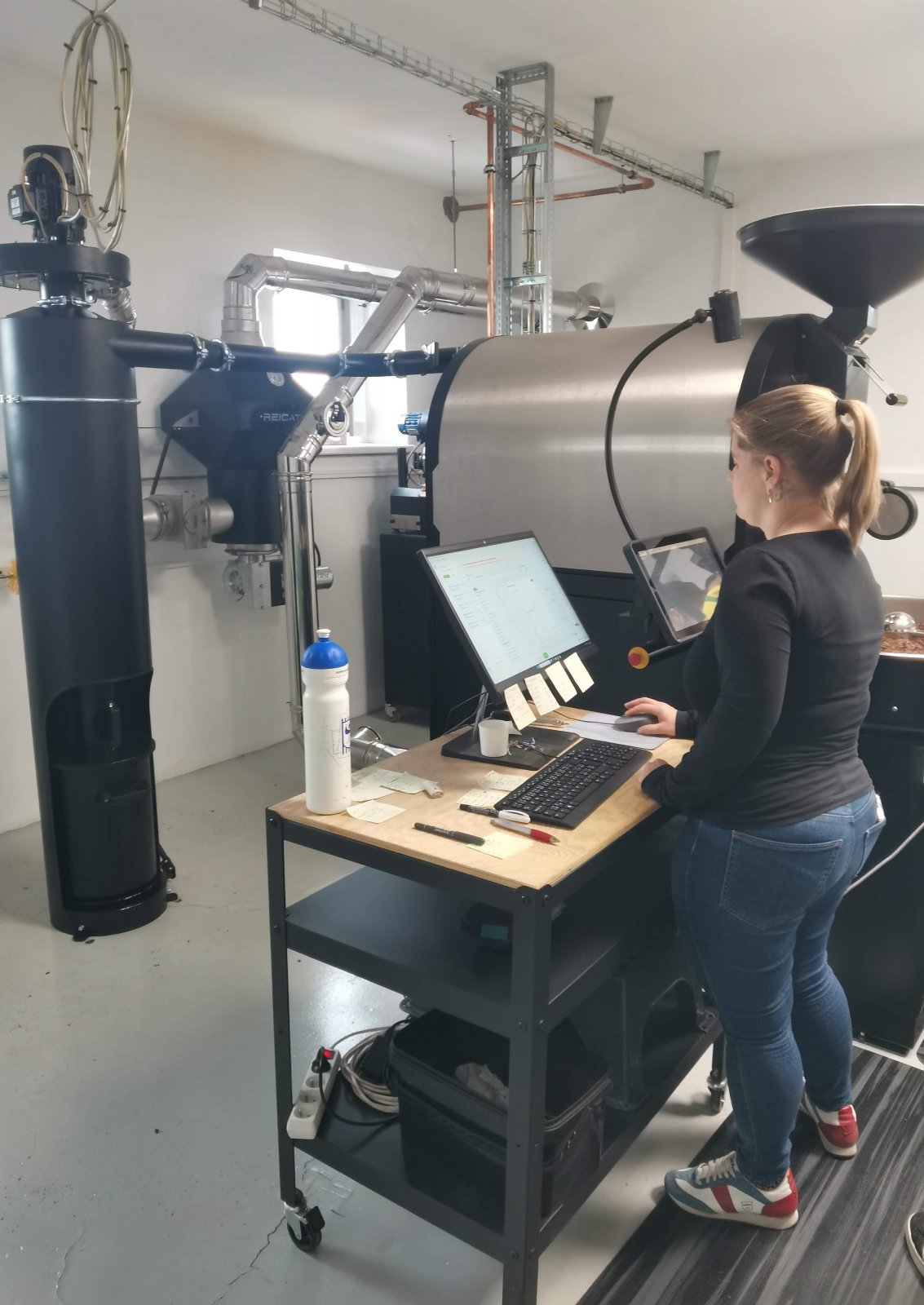 Po krátké přestávce na svačinku jsme se přesunuli za panem Weiserem. Ten nám upřesnil proces pražení kávy. Pražírna funguje tak, že se do bubnu o teplotě 210° C nasypou zelená zrna kávy obalená pergamenem. Při procesu pražení zrna puknou a pergamen se oddělí od zrna a putuje do odpadní části pražírny. Upražená zrna kávy o teplotě 210° C se přesunou do chladící části, kde ji lopatky a vzduch chladí a míchají a následně se přemístí do bedýnek, kde musí odstát minimálně 24 hodin. Teprve pak jsou upražená zrna zabalena a odeslána na zakázku do kaváren.