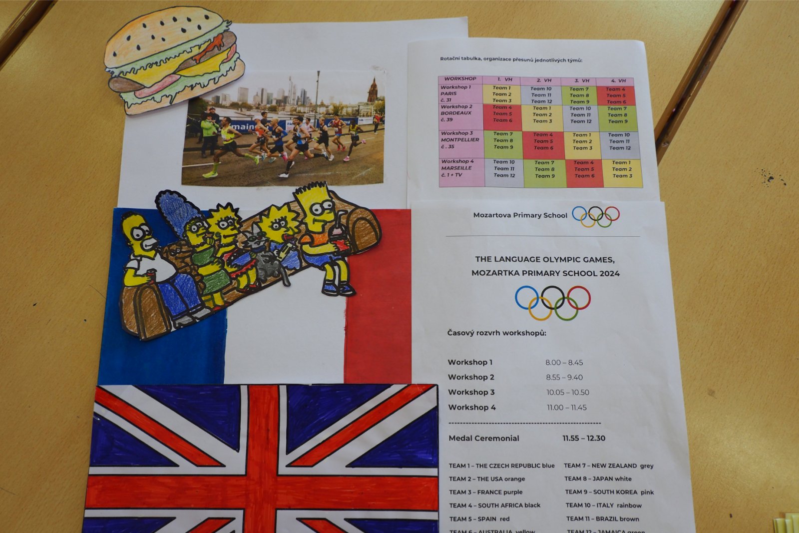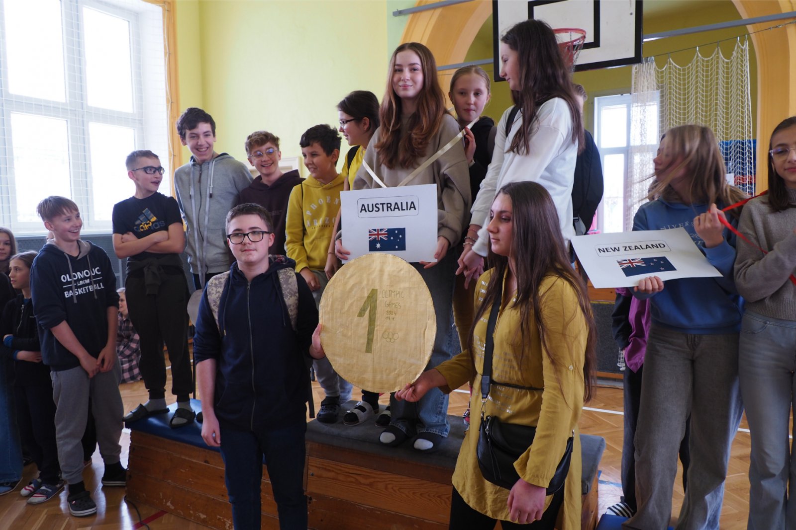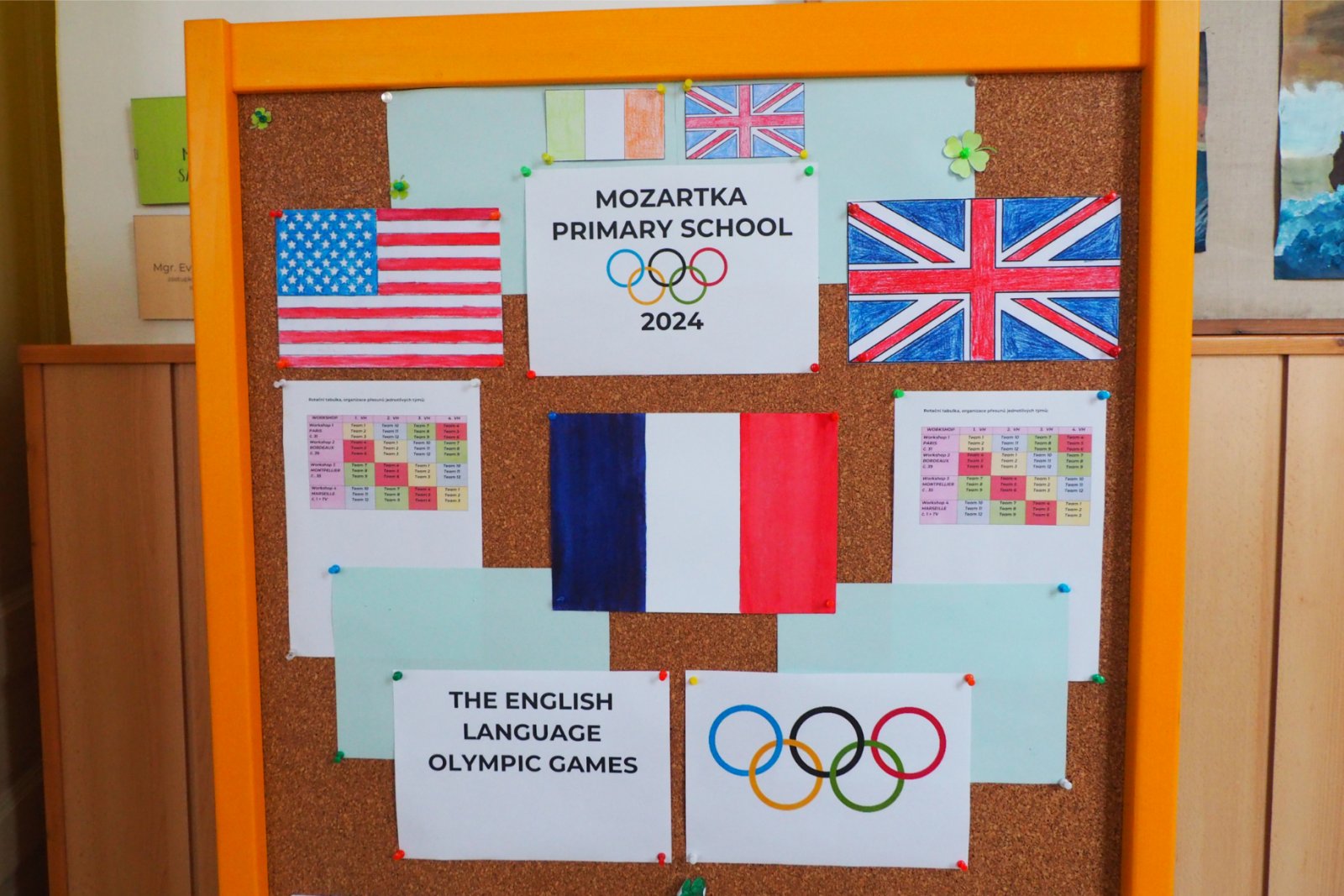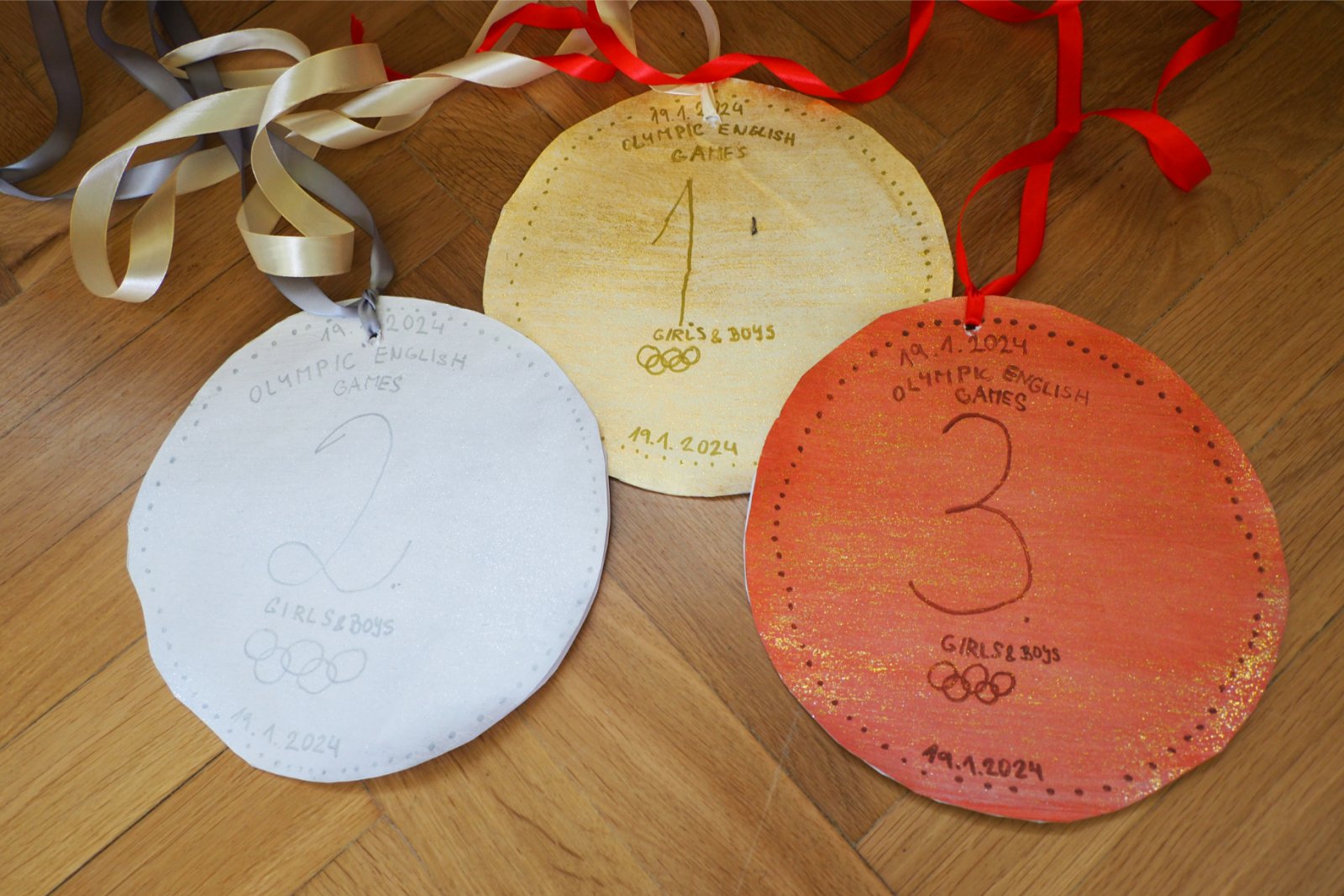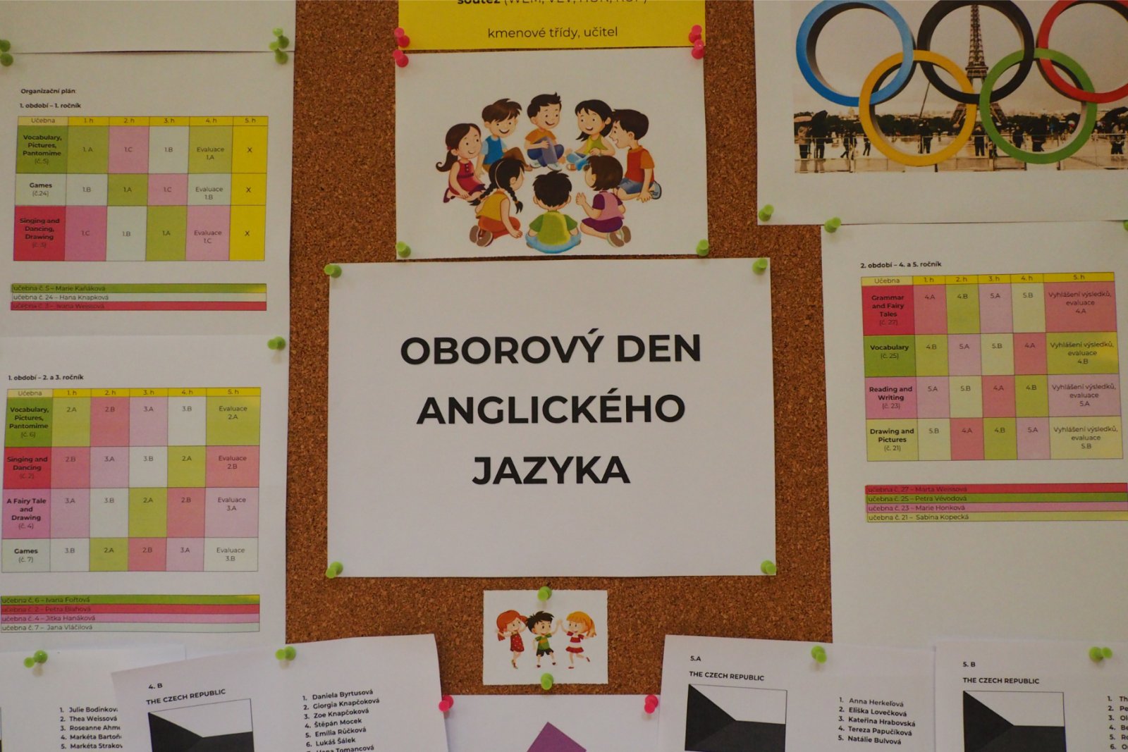 - složených ze žáků napříč ročníky - pojmenovaných dle různých světových zemí. Celý den tak žáci prvního i druhého stupně soutěžili, procházeli pestrými workshopy a sbírali cenné body do celkového hodnocení historicky Prvních olympijských her v anglickém jazyce na naší škole. A protože olympiáda znamená výkony, tak jednotlivá stanoviště reprezentovala dílčí disciplíny, které jsou součástí letních her. Soutěže a klání jako je štafeta, skok daleký, sprint, hod oštěpem nebo maraton jsme použili pro různé jazykové aktivity. Tedy například na stanovišti PARIS se děti utkaly v hodu oštěpem, ve štafetě a v trojskoku. Na místě MONTPELLIER změřily síly ve vrhu koulí, ve skoku dalekém a v maratonu. A co děti tedy opravdu plnily? Názvy disciplín sloužily jen jako metafory pro činnosti jako tvoření slov, skládání vět, slovní pyramida, uvádění správných tvarů nepravidelných sloves, vyhledávání klíčových informací v textu, psaní příběhů... Abychom dětem připomněli, že Olympijské hry 2024 se budou letos konat ve Francii, připravili jsme jim vědomostní kvíz a některé disciplíny byly věnované i historii olympijských her. Sportovní duch nás provázel celý den a ti nejšikovnější nakonec zvítězili. Závěrečný medailový ceremoniál v tělocvičně náš den anglického jazyka slavnostně zakončil. Mnoho jsme se naučili a všichni jsme si to moc užili.