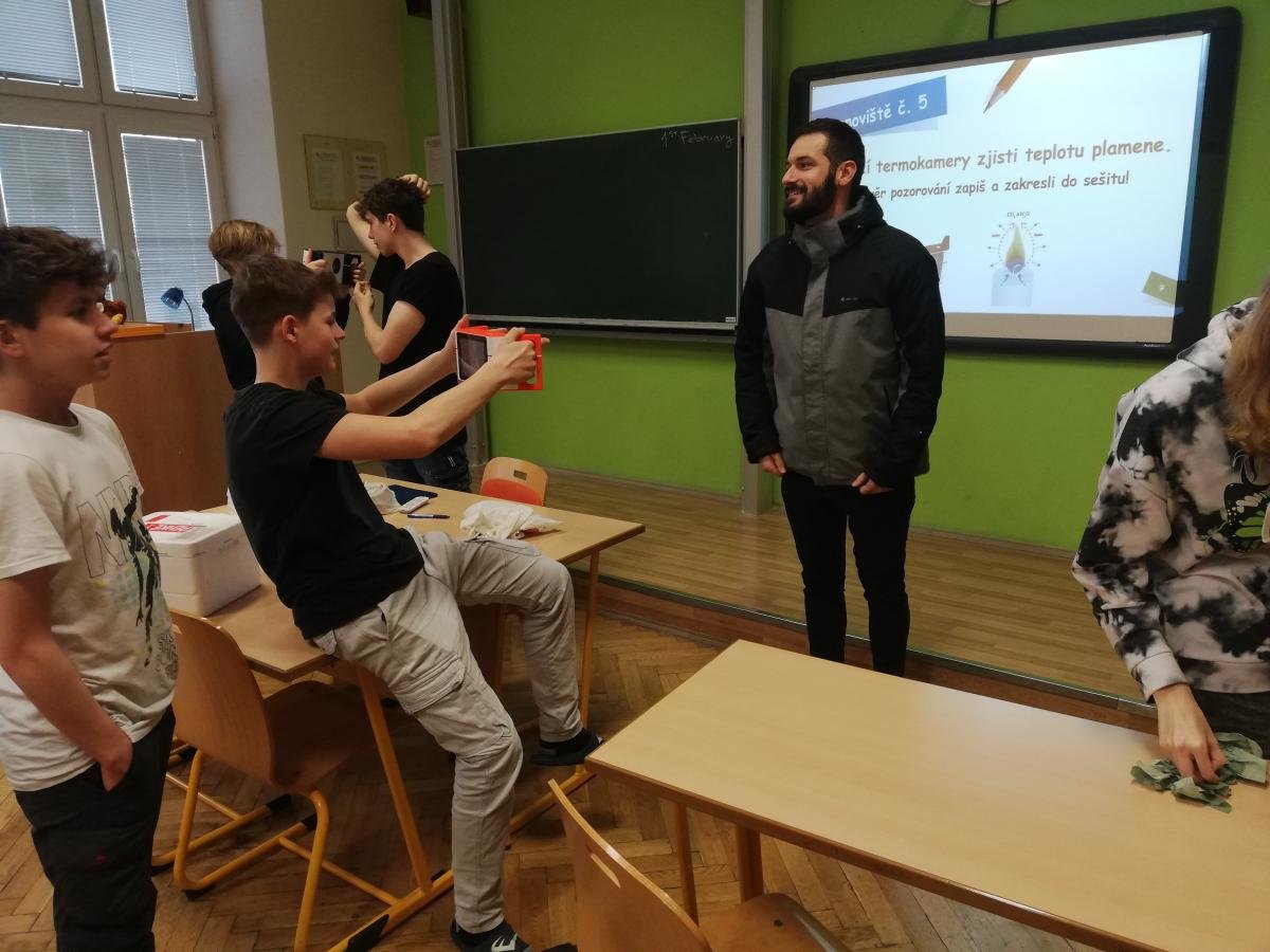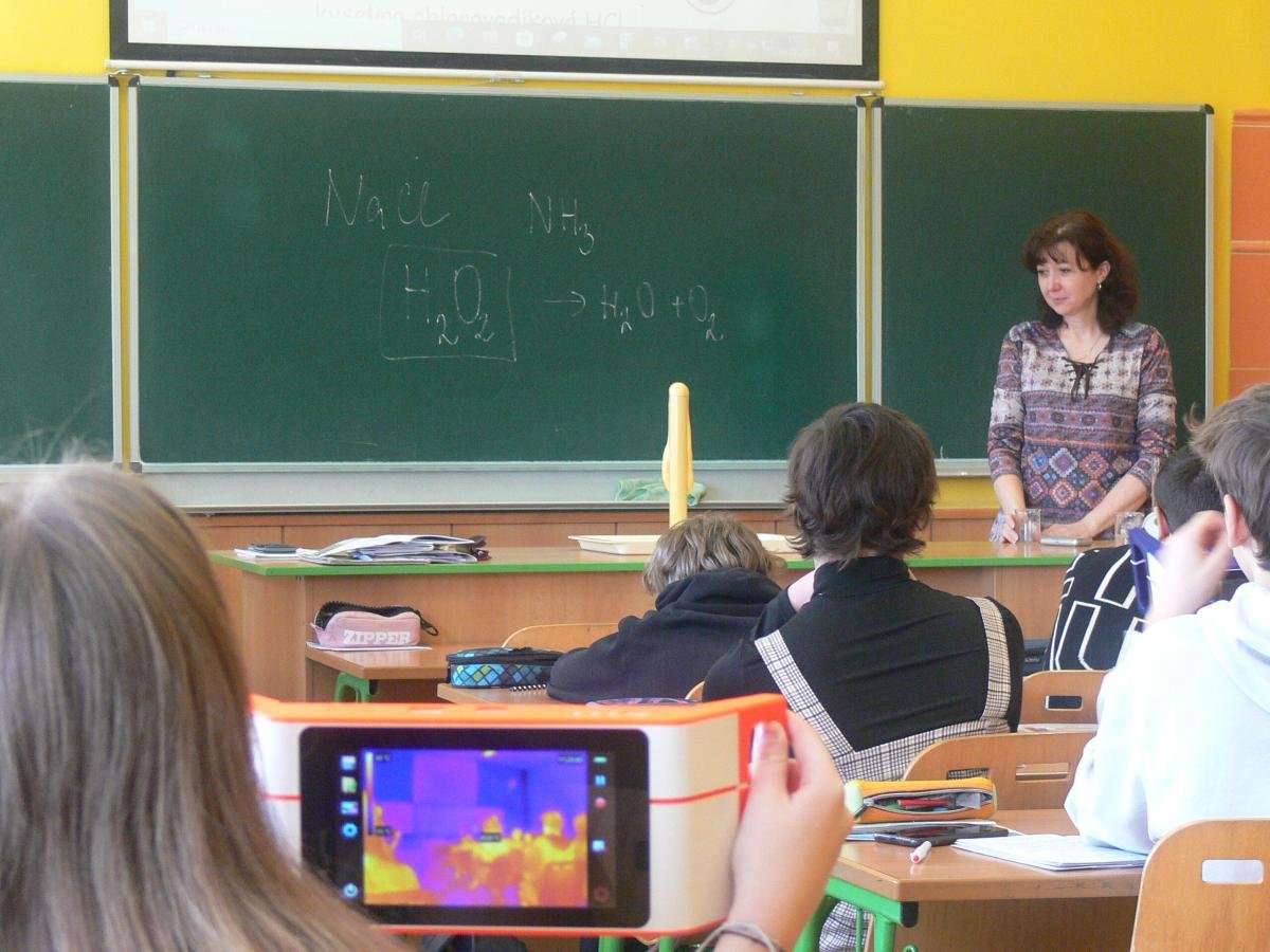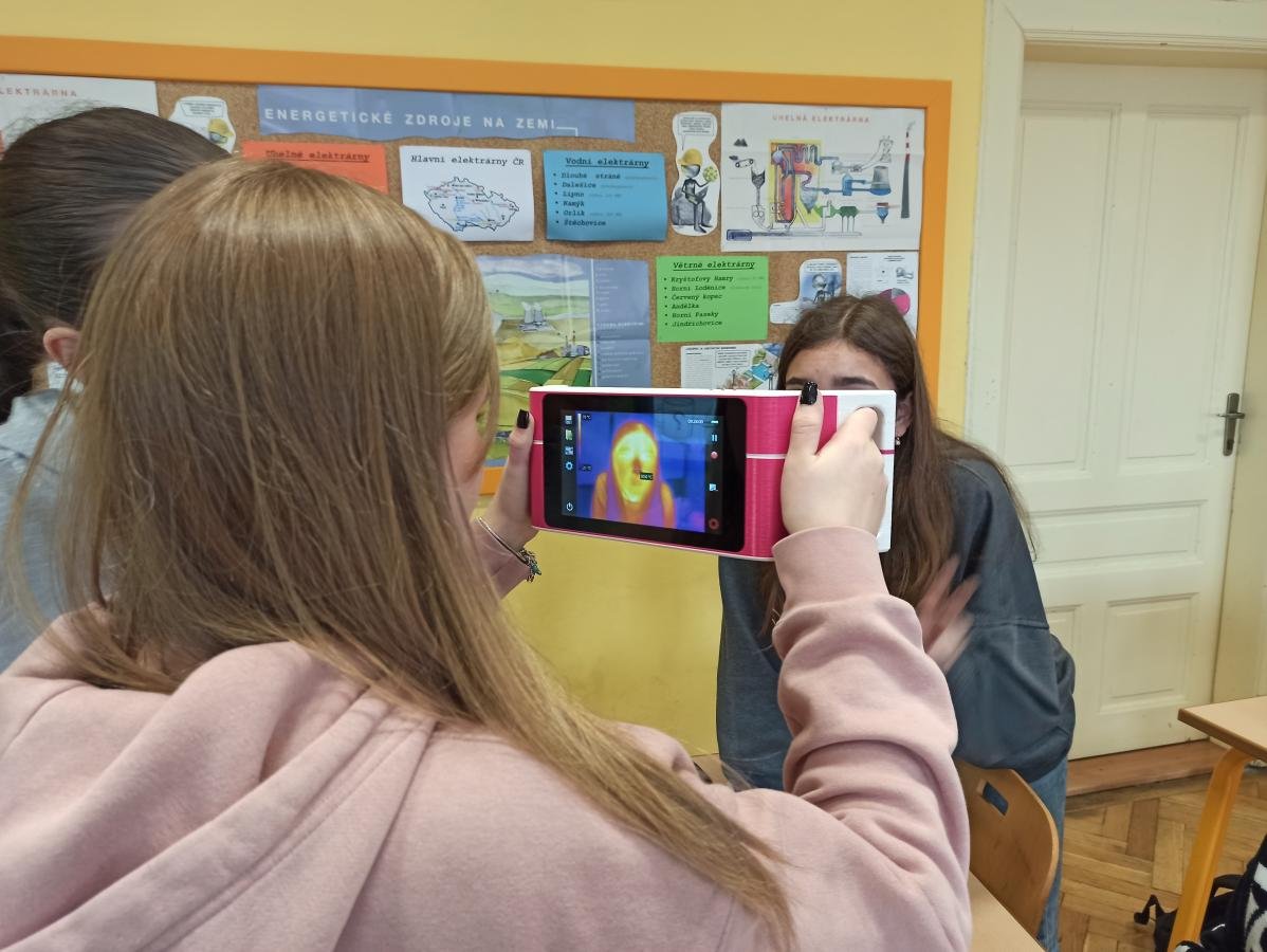 V rámci spolupráce s Pevností poznání jsme si zapůjčili do výuky přírodovědných předmětů výukovou pomůcku 21. století - termokameru. Ve škole jsme tak měli kufr s pěti kamerami k dispozici necelý měsíc. Kde jsme kamery využili? Co jsme se naučili, ověřili a co nás překvapilo? Například ve fyzice jsme pozorovali sdílení tepla u různých těles, v chemii reakční teplo a v přírodopisu studenokrevná zvířata. Skupinová práce s kamerami byla pro žáky zajímavou zkušeností, jak se podívat kolem sebe jinýma očima.