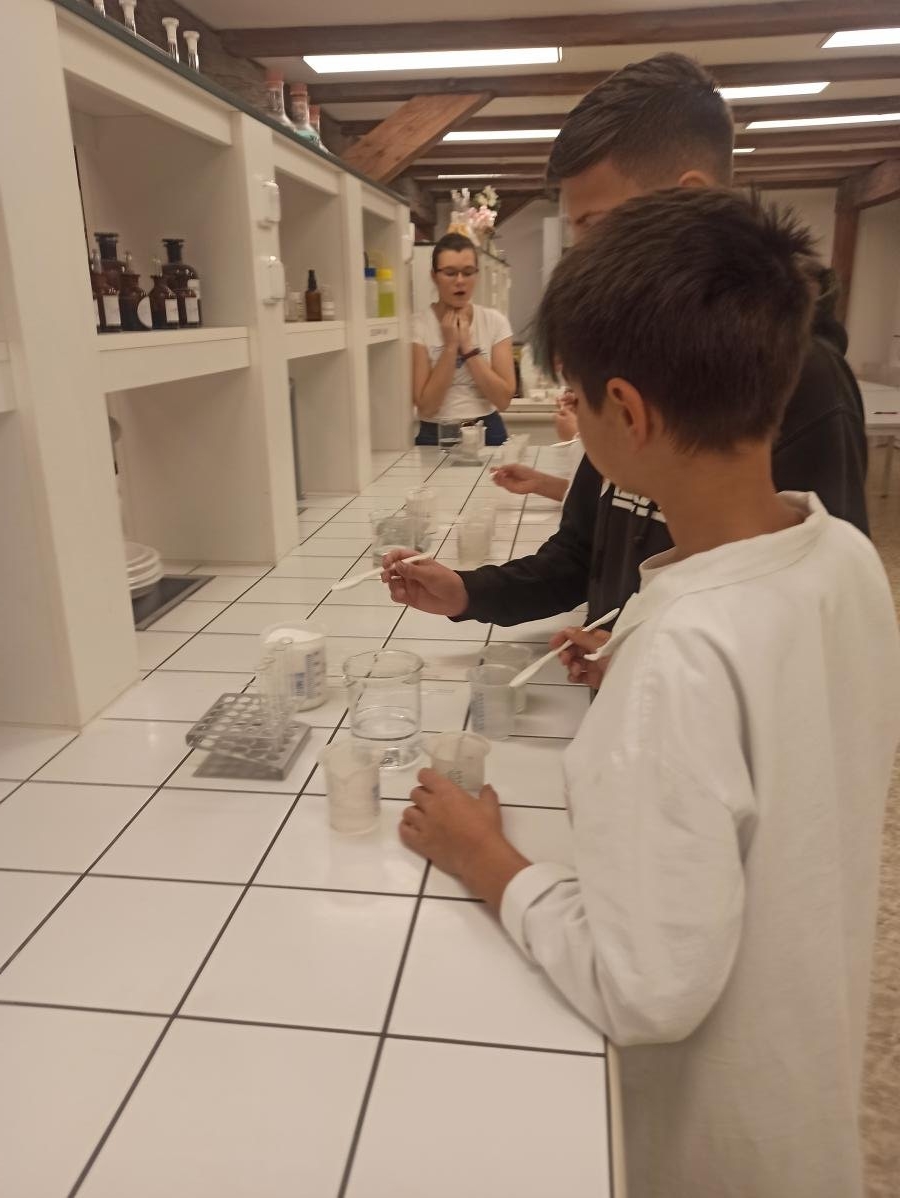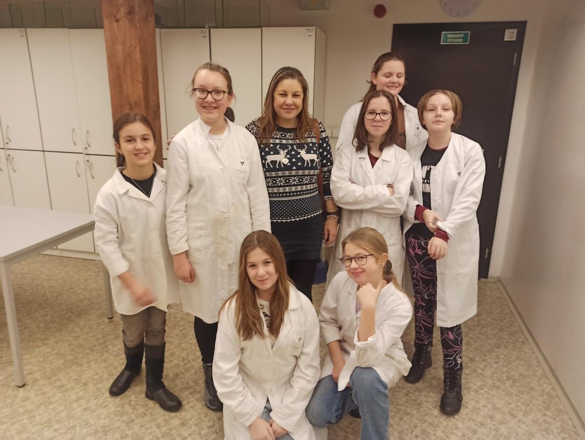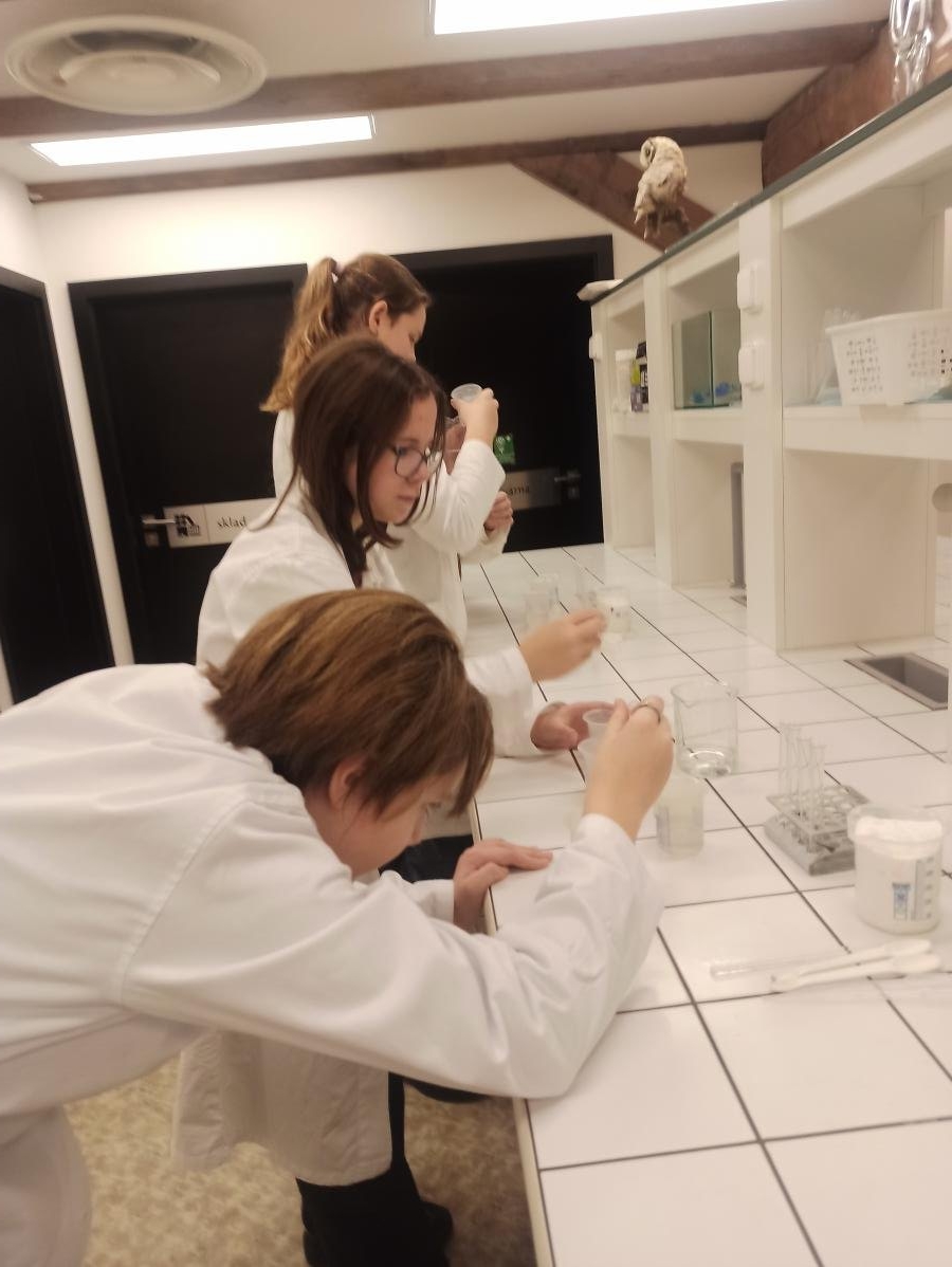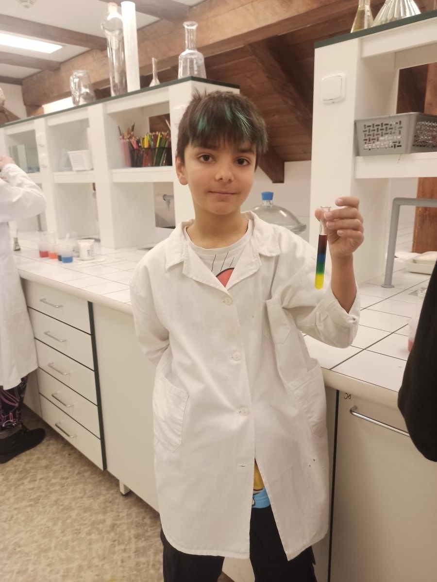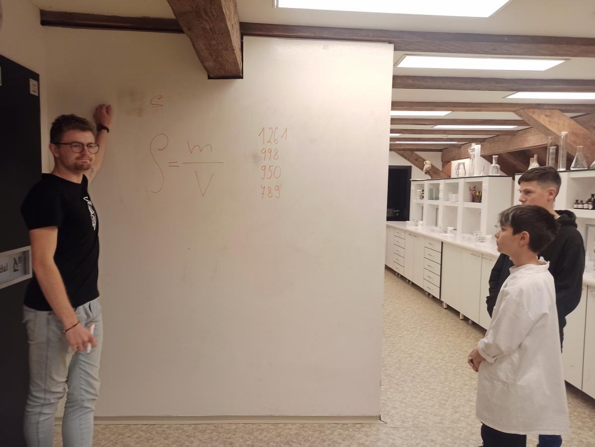 s teoretickými poznatky – co je to hustota i jak ji vypočítáme. V praktické části pak žáci dostali ochranný plášť a následně si vyzkoušeli laboratorní práci - ukázku v laboratoři s jednotlivými roztoky. Děti praktická demonstrace moc bavila, dozvěděly se mnoho nových poznatků a také si užily hodně smíchu a radosti. V druhé části programu si pak žáci prohlédli jednotlivé zajímavé expozice, které si prakticky vyzkoušeli, a z celého dne si tak s sebou mohli odnést cenné poznatky.