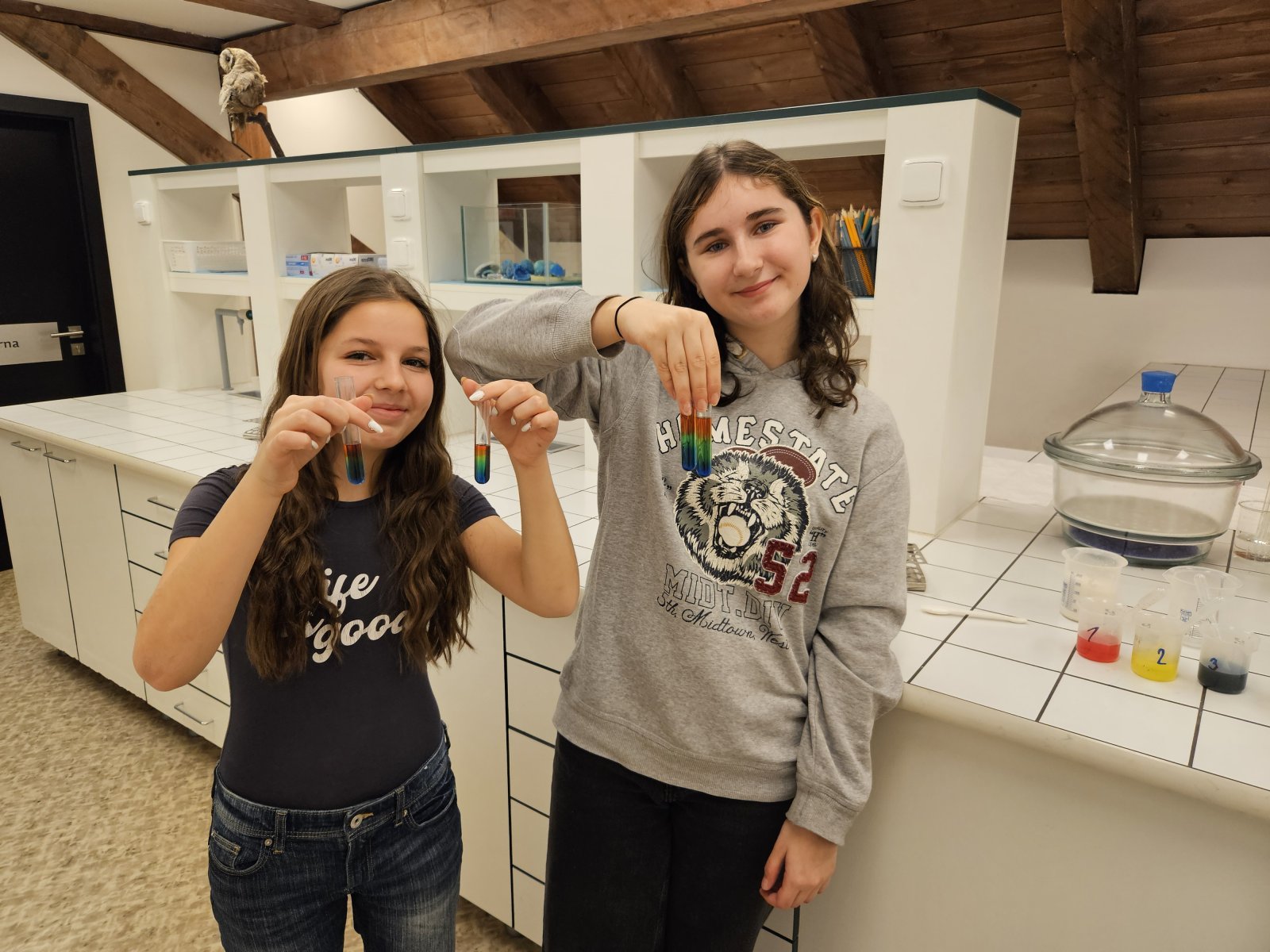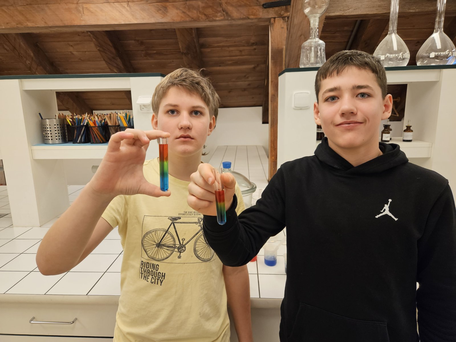 Pod vedením lektorů připravili čtyři různě husté roztoky vody a cukru, které obarvili a postupně vrstvili do zkumavky. Výsledkem byla barevná duha ve zkumavce, kde se kapaliny nemísily – díky rozdílné hustotě zůstaly oddělené.