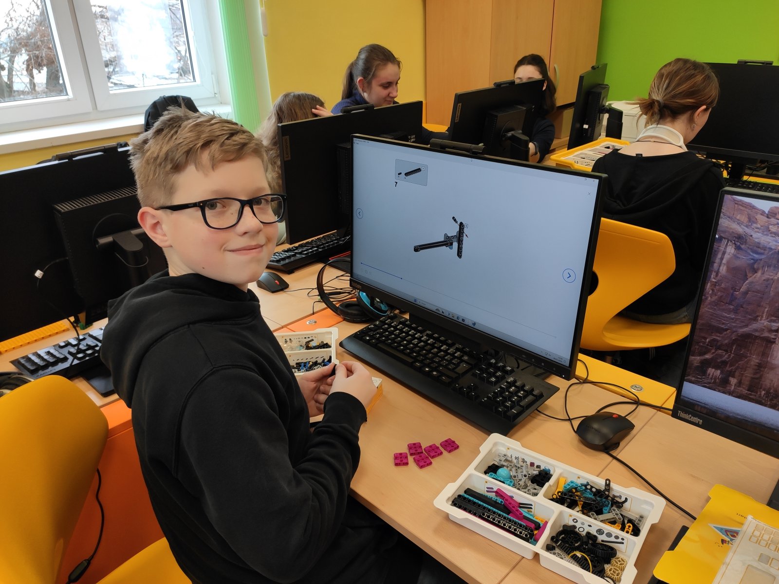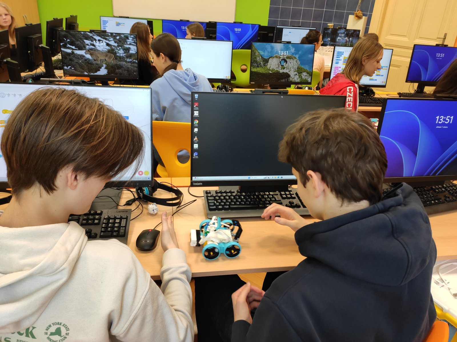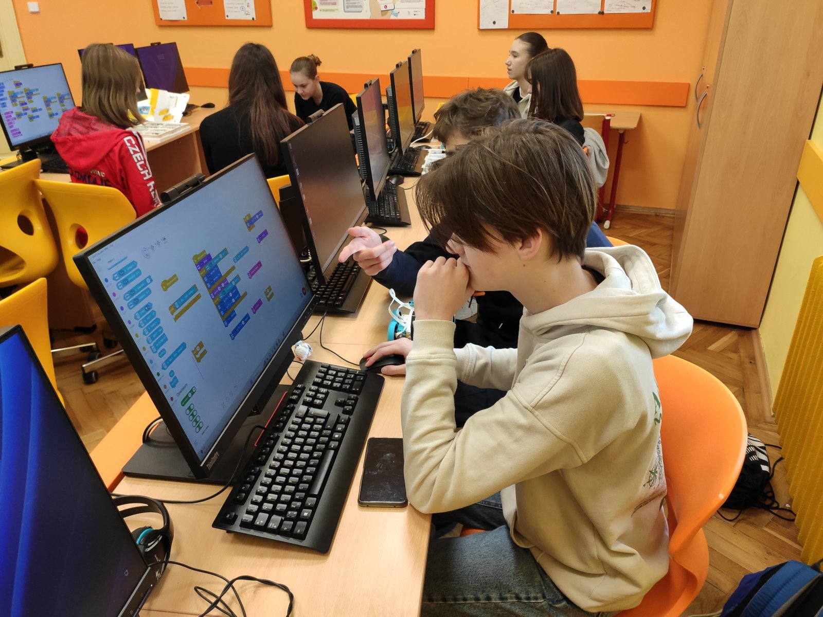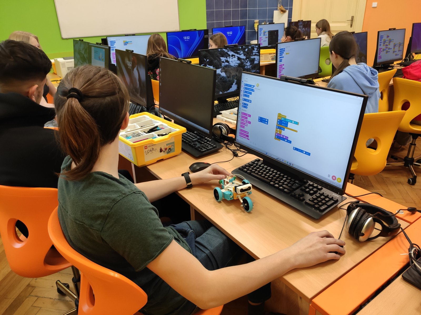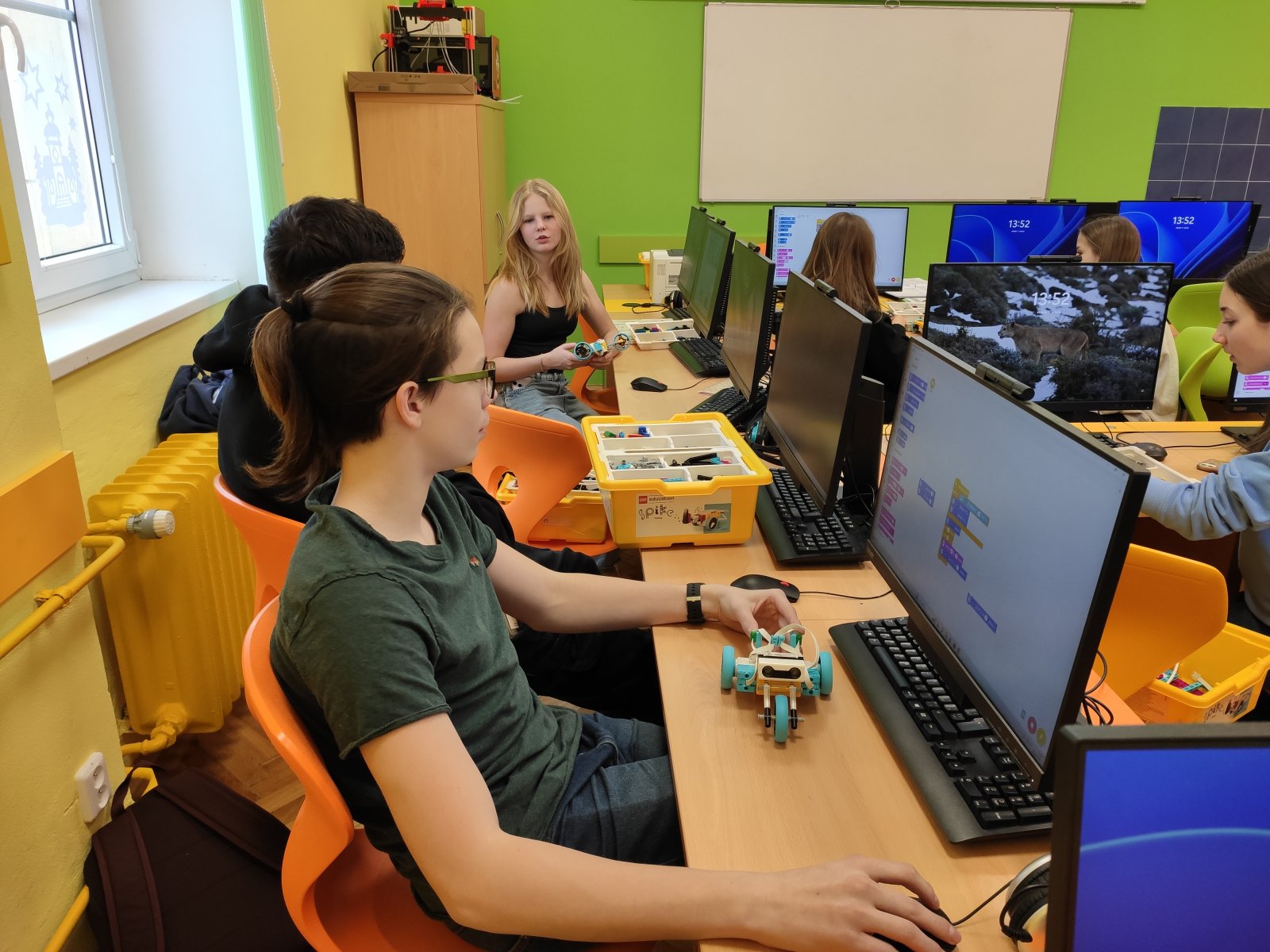 Programování se pro naše žáky stalo běžnou součástí hodin informatiky. Postupně se učí vytvářet různé algoritmy vedoucí k vyřešení zadaného problému. Většinou se tato činnost odehrává v prostředí Scratch, ve kterém žáci „udílejí pokyny“ virtuálním postavám. V 8. ročníku se žáci posouvají na další úroveň, a sice na programování fyzického objektu – robota. Ve škole pracují se stavebnicí LEGO Education SPIKE, jejíž více než 500 součástek nabízí značný potenciál pro žákovskou kreativitu. Žáci se učí sestavovat robota podle návodu, seznamují se s funkčností senzorů, s prostředím aplikace, vyhledávají chyby v programu a sestavě, vymýšlejí vlastní inovace a nakonec dospějí až ke stavbě a naprogramování vlastního robota.