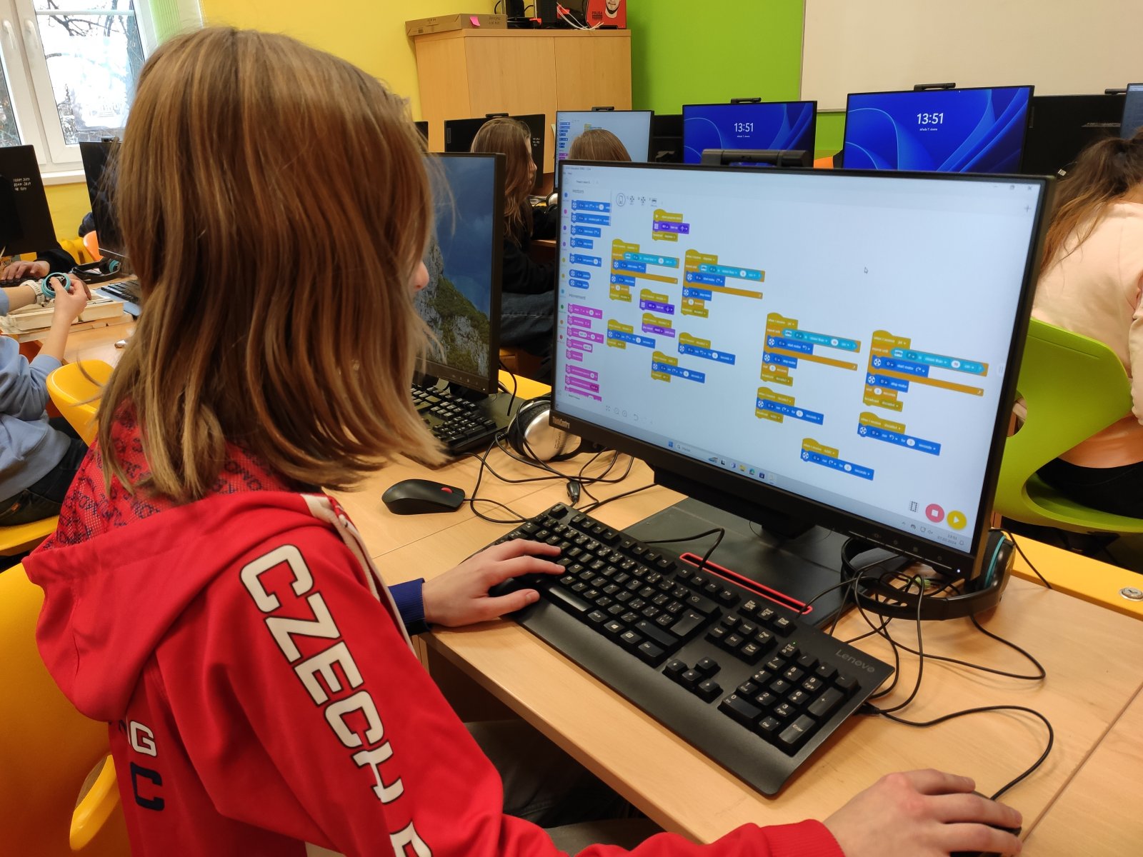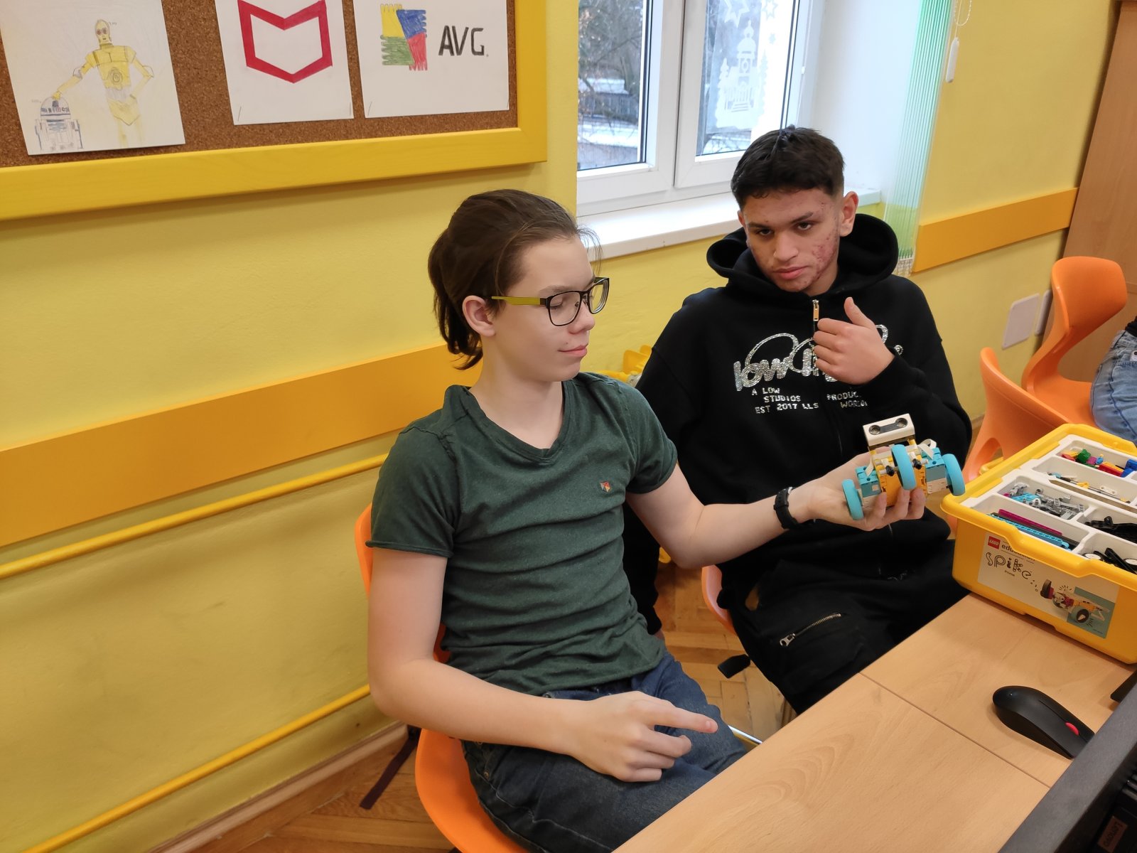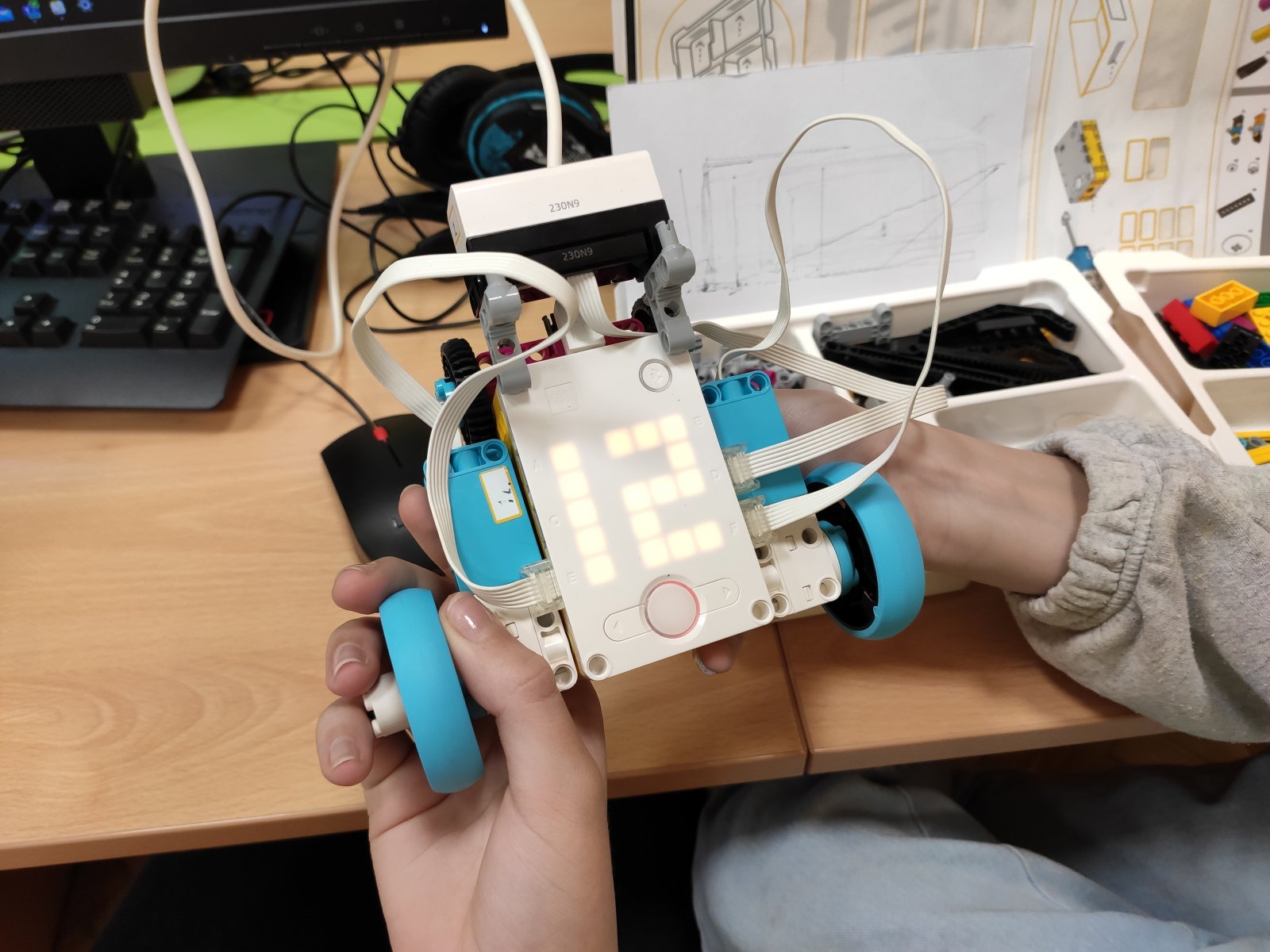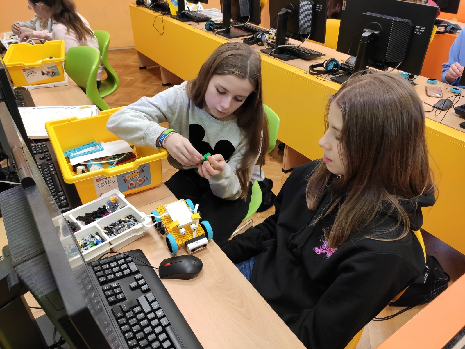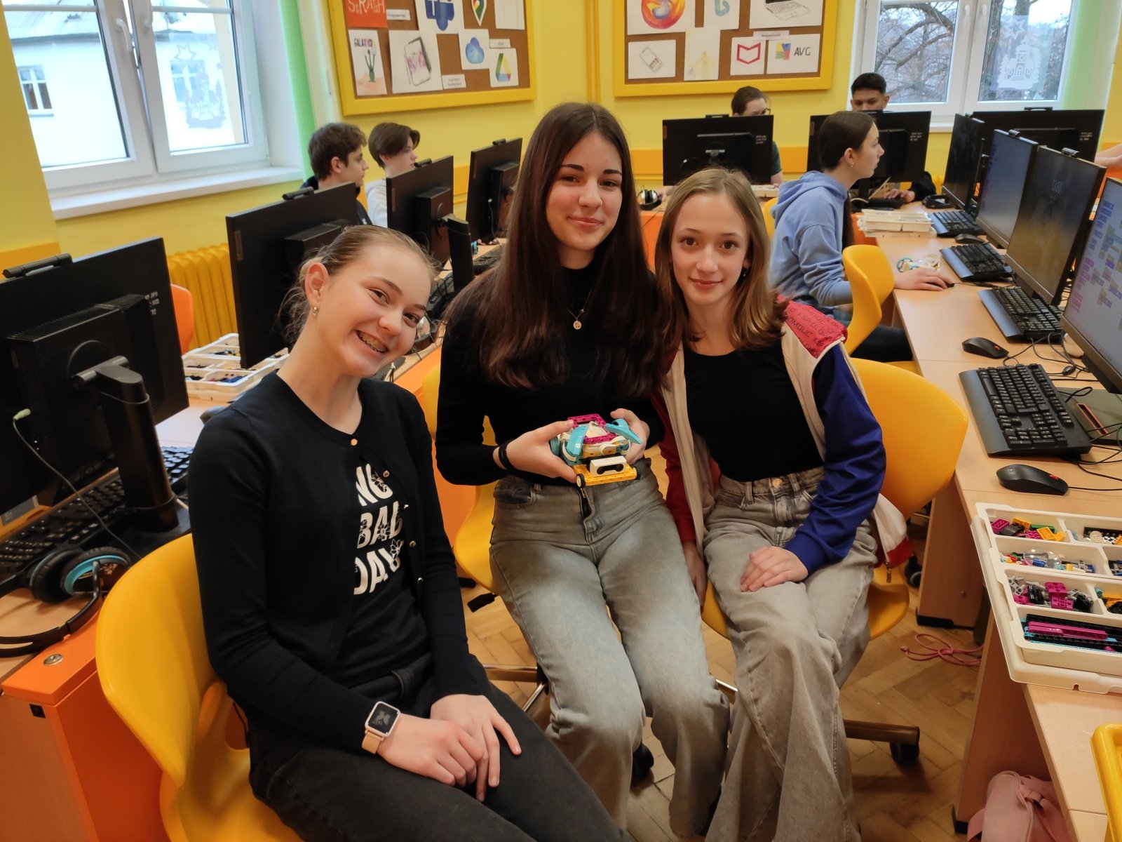 Programování se pro naše žáky stalo běžnou součástí hodin informatiky. Postupně se učí vytvářet různé algoritmy vedoucí k vyřešení zadaného problému. Většinou se tato činnost odehrává v prostředí Scratch, ve kterém žáci „udílejí pokyny“ virtuálním postavám. V 8. ročníku se žáci posouvají na další úroveň, a sice na programování fyzického objektu – robota. Ve škole pracují se stavebnicí LEGO Education SPIKE, jejíž více než 500 součástek nabízí značný potenciál pro žákovskou kreativitu. Žáci se učí sestavovat robota podle návodu, seznamují se s funkčností senzorů, s prostředím aplikace, vyhledávají chyby v programu a sestavě, vymýšlejí vlastní inovace a nakonec dospějí až ke stavbě a naprogramování vlastního robota.