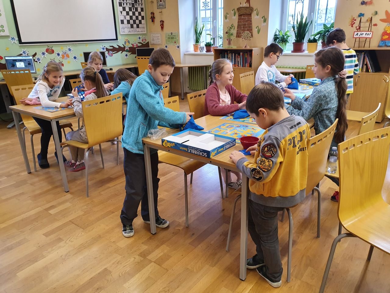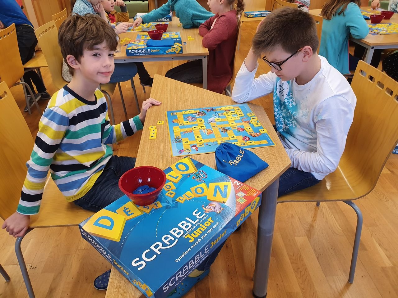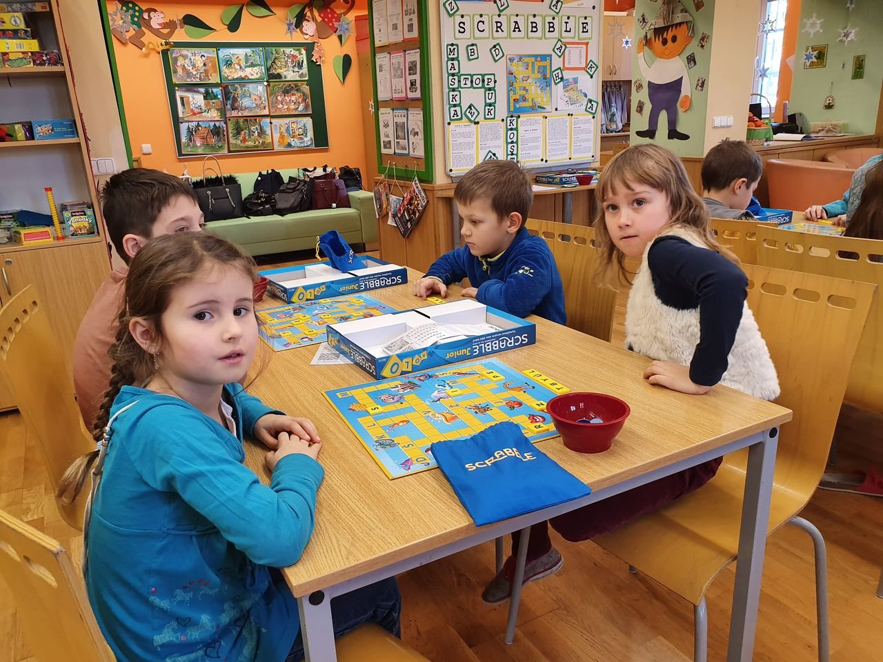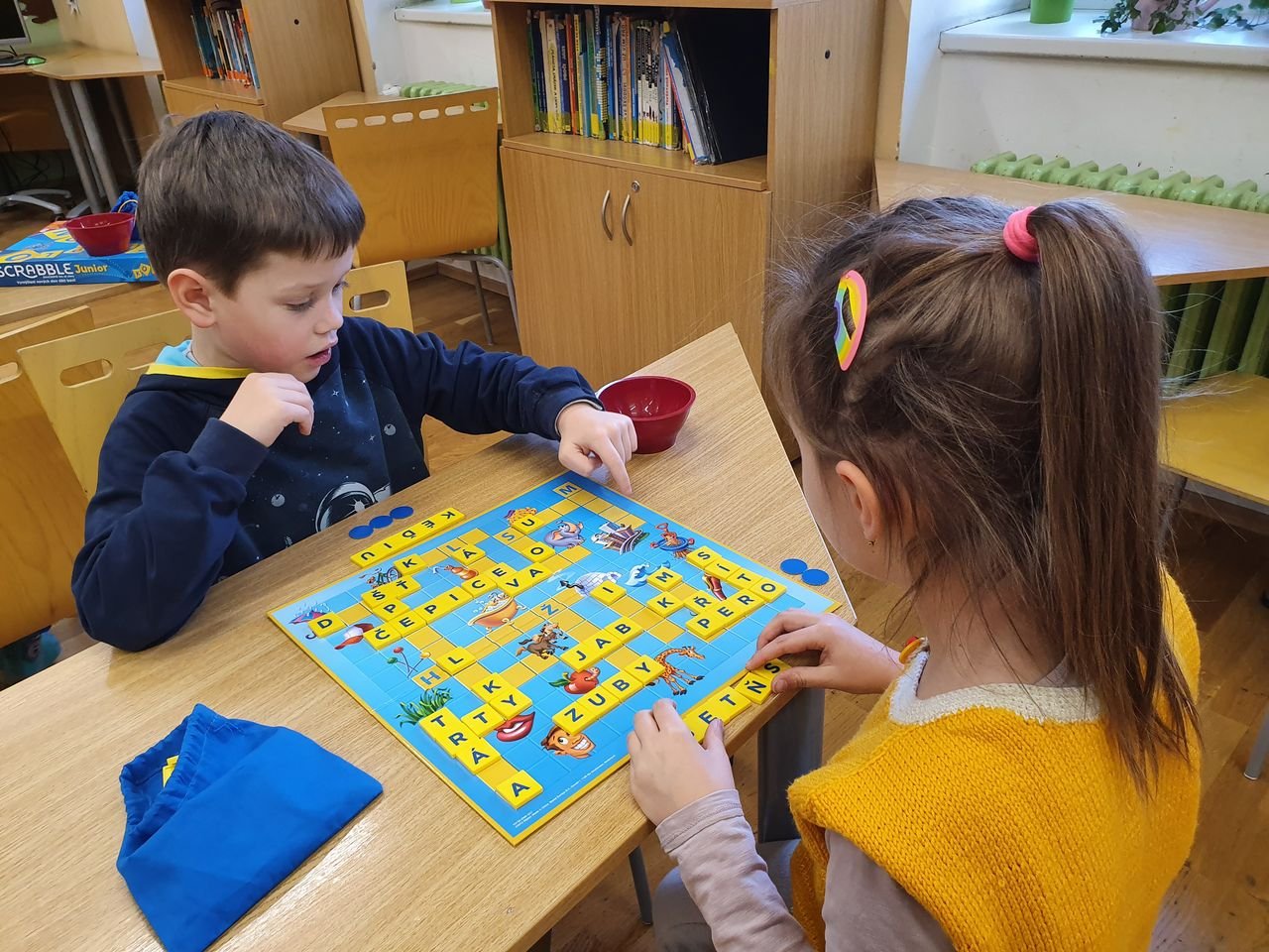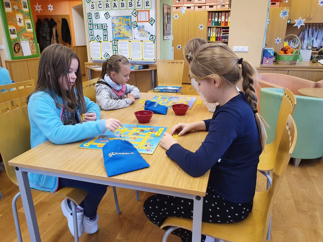 Zvídavé děti ze školní družiny se dnes sešly v herně, aby se seznámily s vydařenou verzí legendární hry. Scrabble junior obsahuje dvě herní verze – jednu pro menší děti, které se teprve učí písmena, druhou pro starší, které jsou schopny tvořit slova.