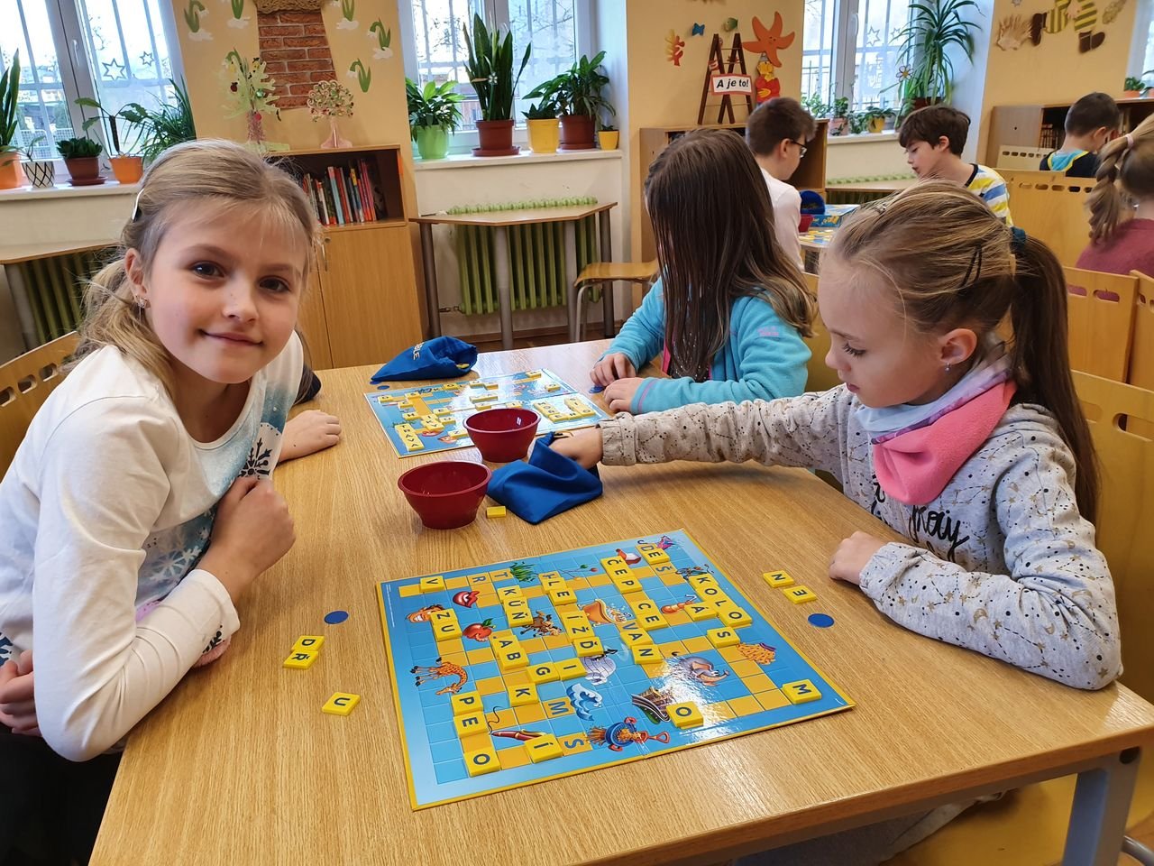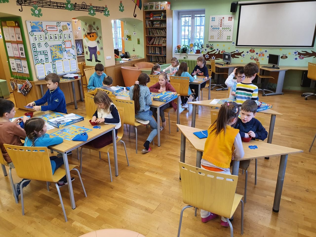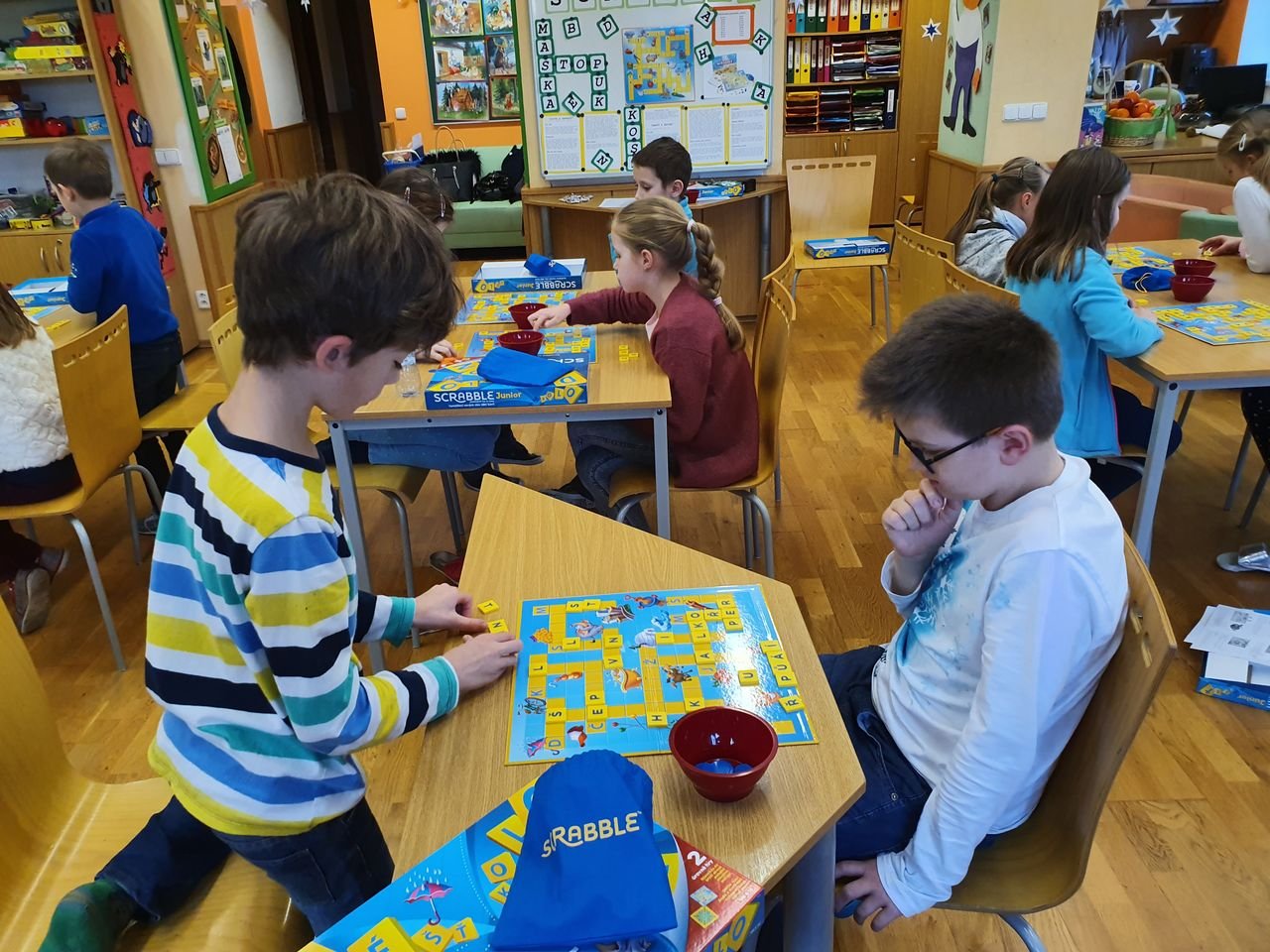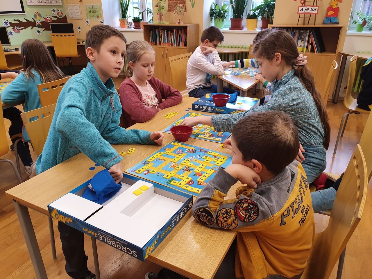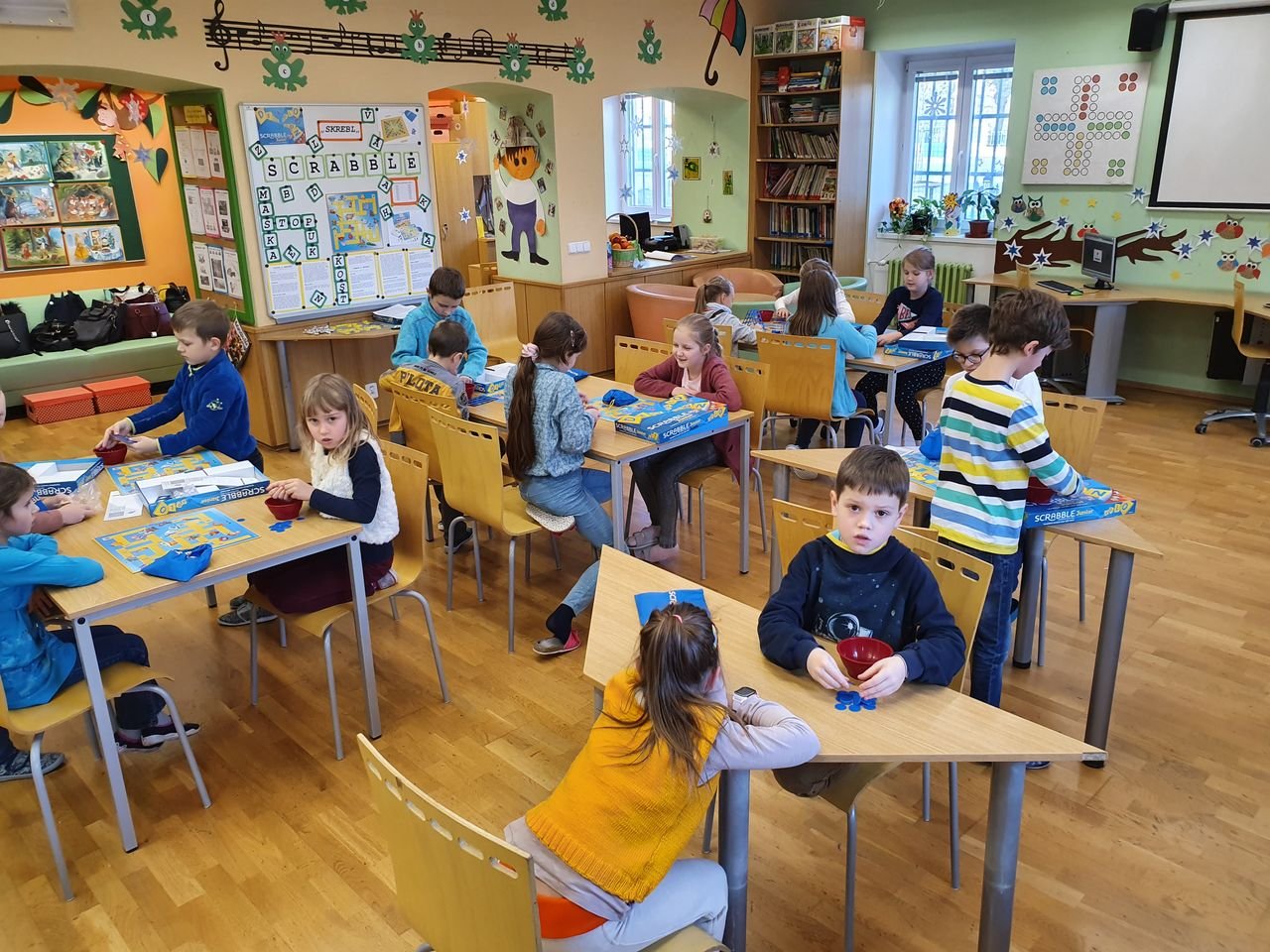 Zvídavé děti ze školní družiny se dnes sešly v herně, aby se seznámily s vydařenou verzí legendární hry. Scrabble junior obsahuje dvě herní verze – jednu pro menší děti, které se teprve učí písmena, druhou pro starší, které jsou schopny tvořit slova.