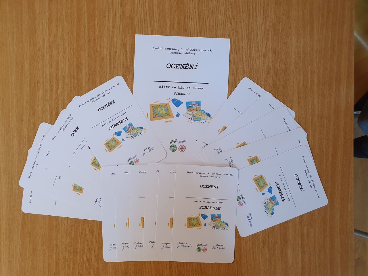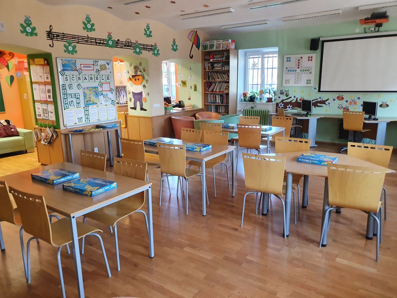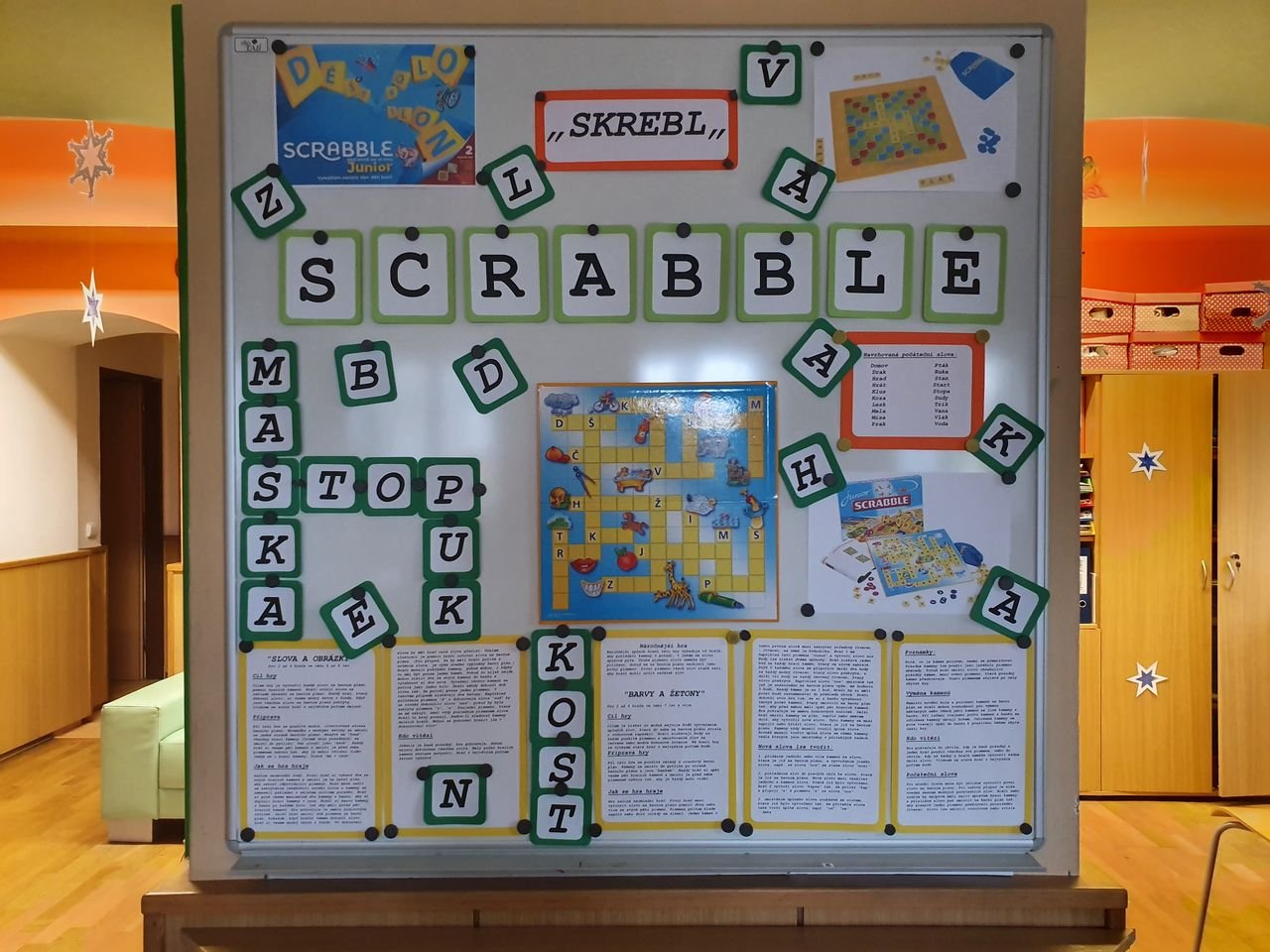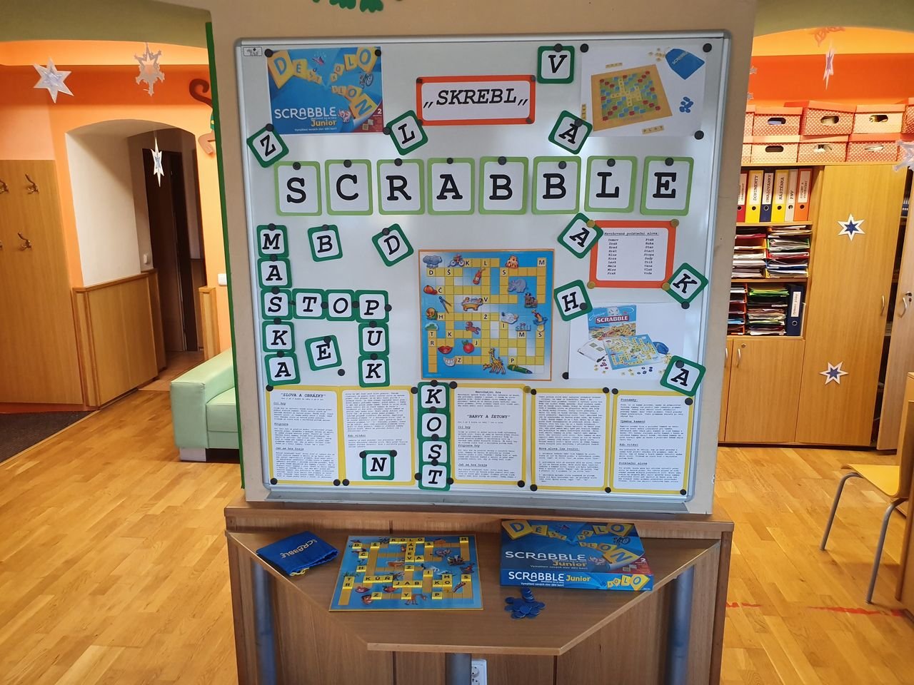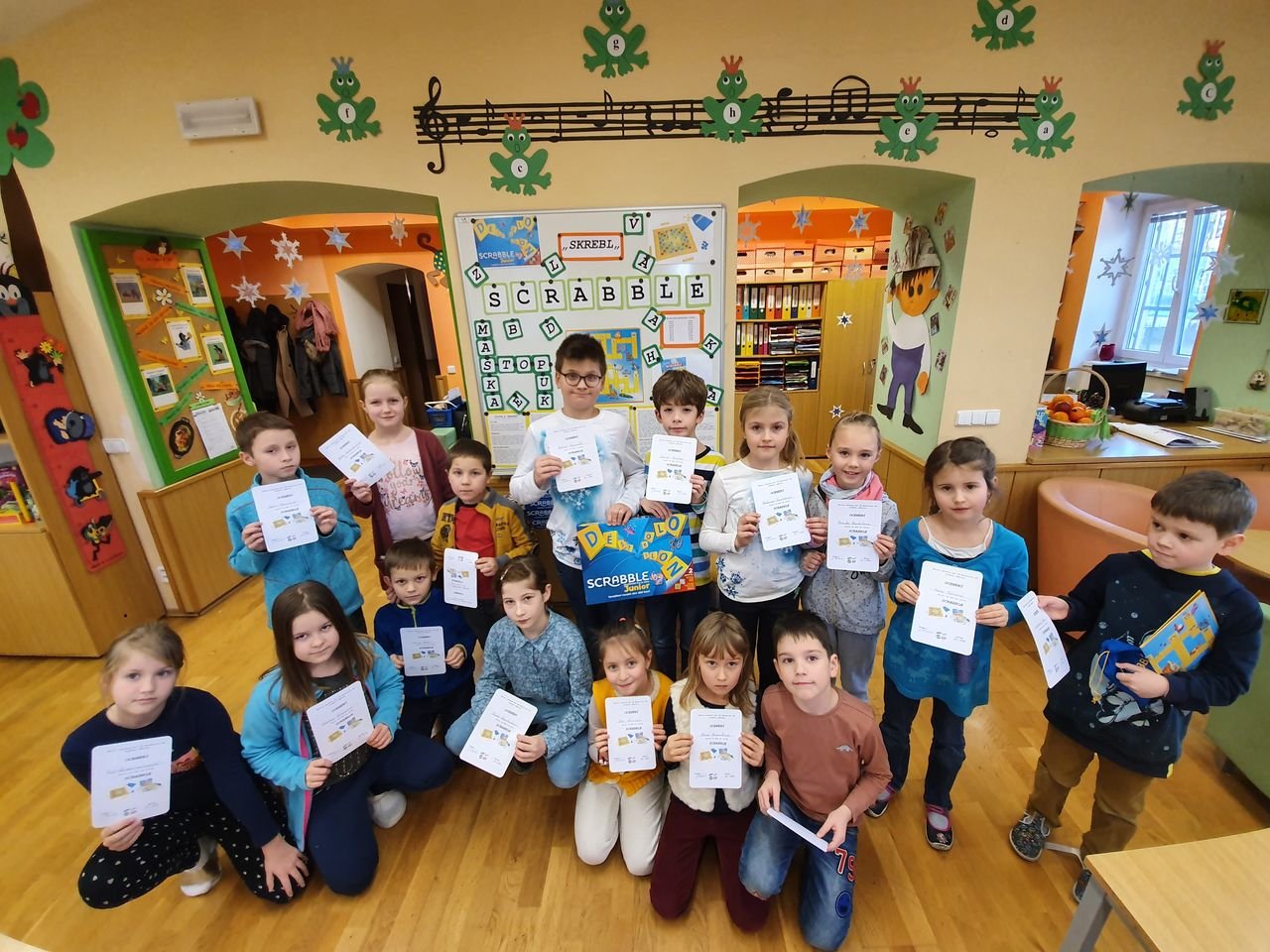 Zvídavé děti ze školní družiny se dnes sešly v herně, aby se seznámily s vydařenou verzí legendární hry. Scrabble junior obsahuje dvě herní verze – jednu pro menší děti, které se teprve učí písmena, druhou pro starší, které jsou schopny tvořit slova.