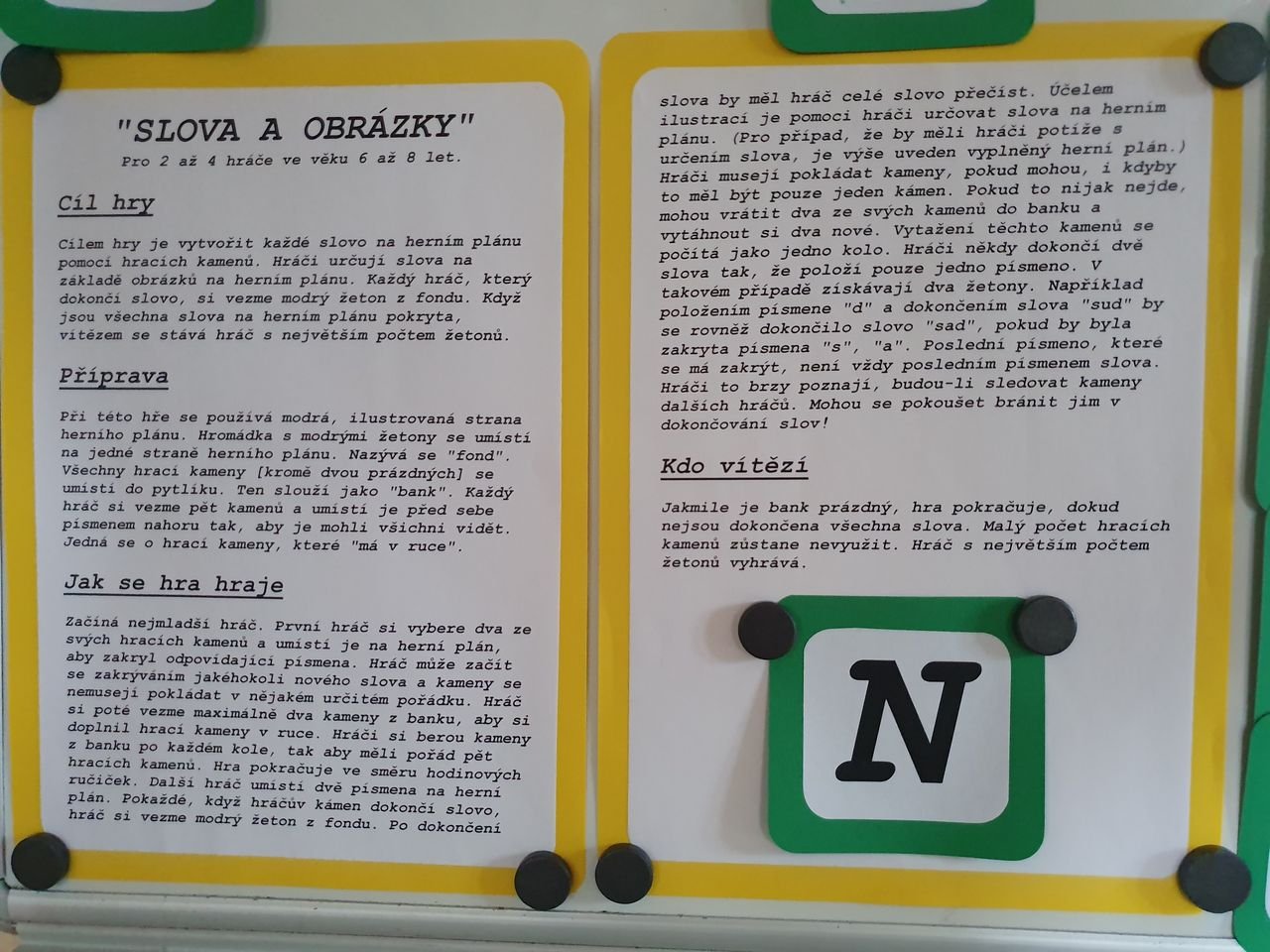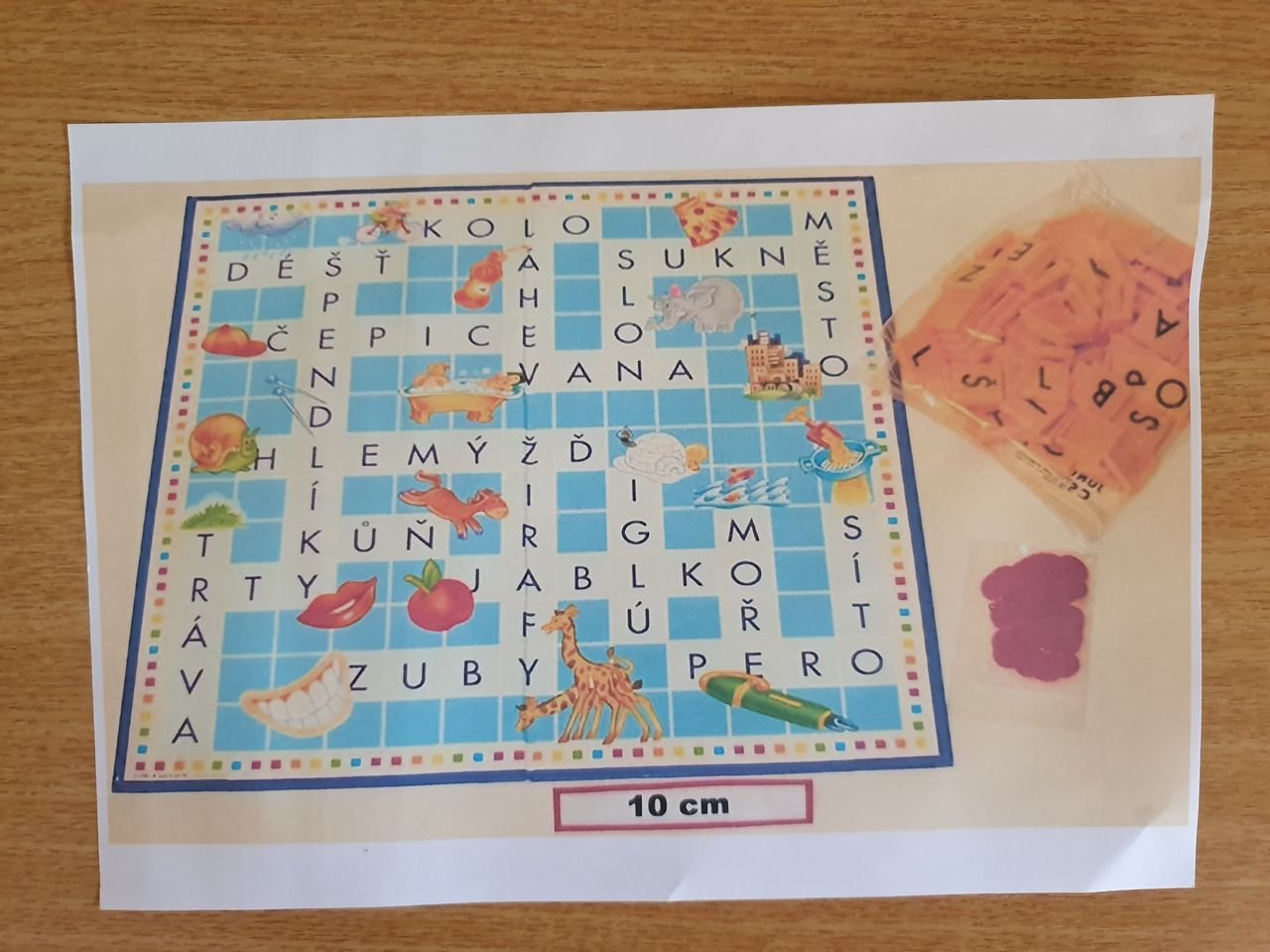 Prvňáčkům byla určena varianta plánu, na němž jsou předtištěná slova. Úkolem dětí bylo přikládat příslušná písmenka na předlohu plánu. Ten je navíc hezky ilustrován, takže obrázky pomohly dětem s dokončováním slov. Za vytvořené slovo obdržely barevný žeton. Nešlo ani tak o to, kolik kdo získá žetonů, ale o zábavu a rozvoj slovní zásoby. Bavili jsme se všichni a třeba někdo najde v této hře velkou zálibu i v dospělosti a stanou se z nich mistři slova.