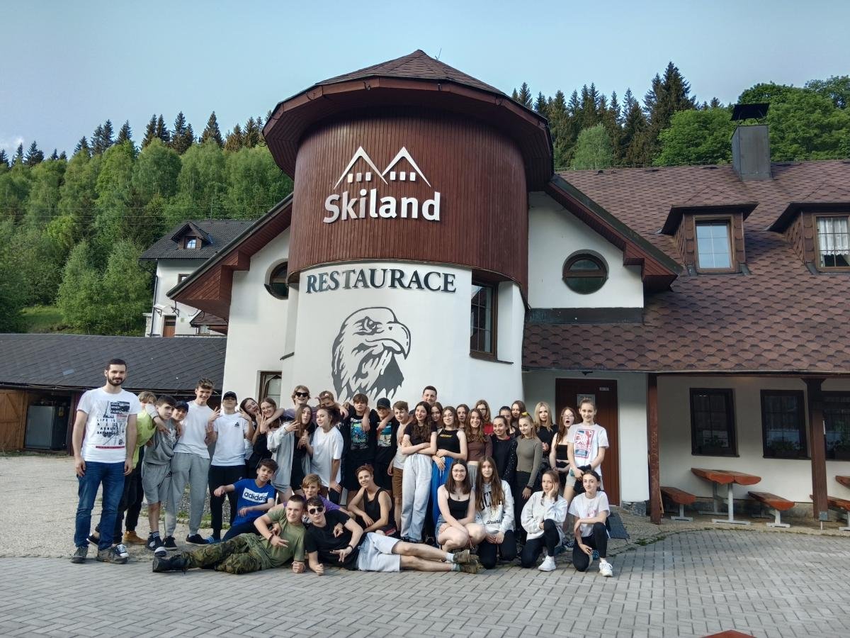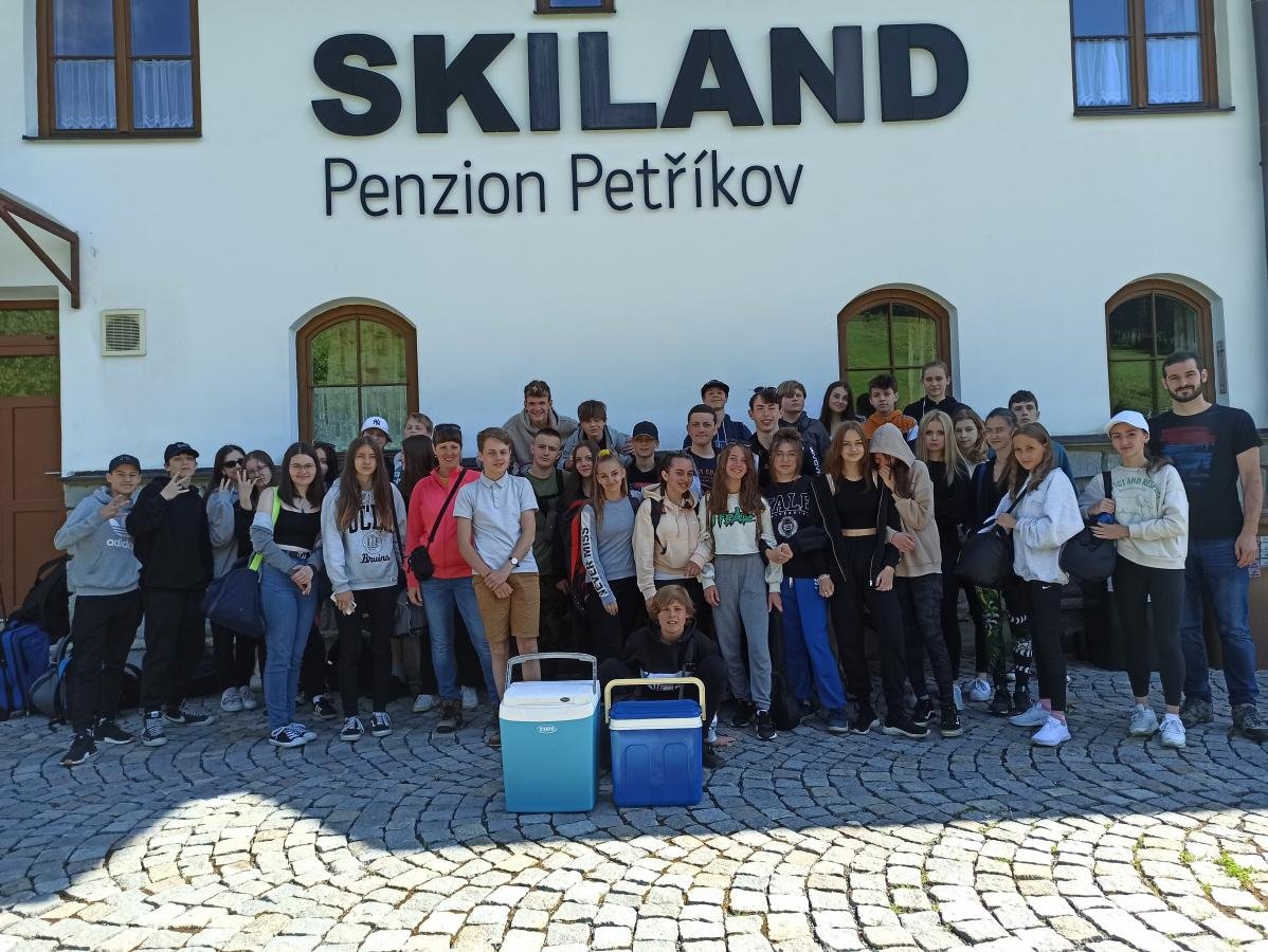 Ve dnech 1.- 2. 6. 2022 jsme s osmými ročníky jeli na školní výlet do CHKO Jeseníky. Cílem byla Ostružná-Petříkov, kde jsme měli v penzionu Skiland zajištěné ubytování. Pedagogický doprovod třídám dělali učitelé Pavel Dřímal a Lucie Pavlíčková. Po příjezdu do Ostružné jsme si zašli na předem objednaný oběd. Poté nás čekala zhruba 3 km dlouhá cesta z Ostružné do Petříkova. Náš penzion byl velmi útulný a měli jsme ho celý pro sebe. Součástí byla i klubovna a venkovní ohniště. Po ubytování a chvilkovém odpočinku jsme se vydali na průzkum okolí. Vylezli jsme na rozkvetlou sjezdovku, zahráli jsme si hry a zbyl i čas na občerstvení. Po večeři jsme rozdělali oheň, u kterého jsme zpívali písničky a opékali špekáčky.