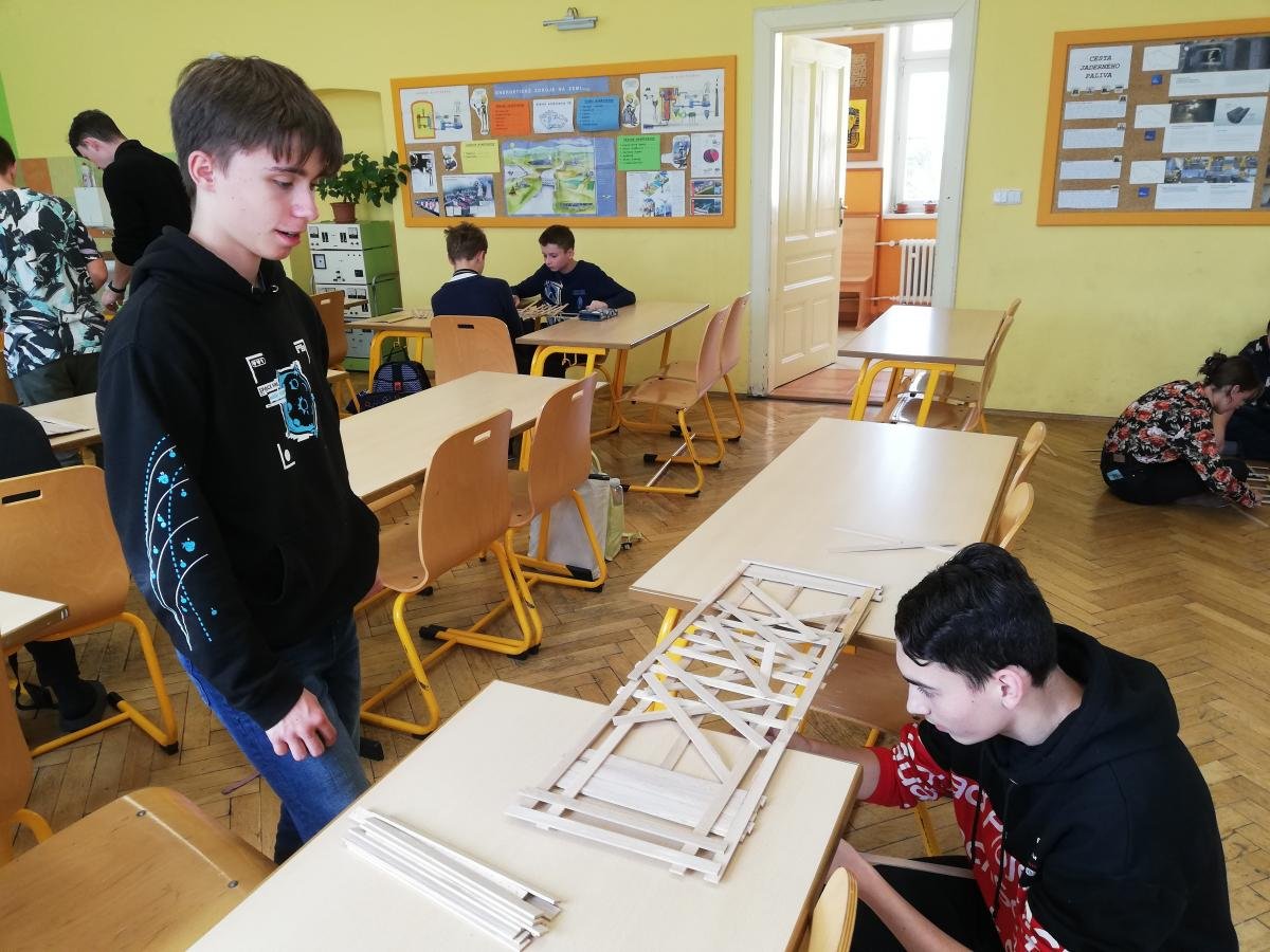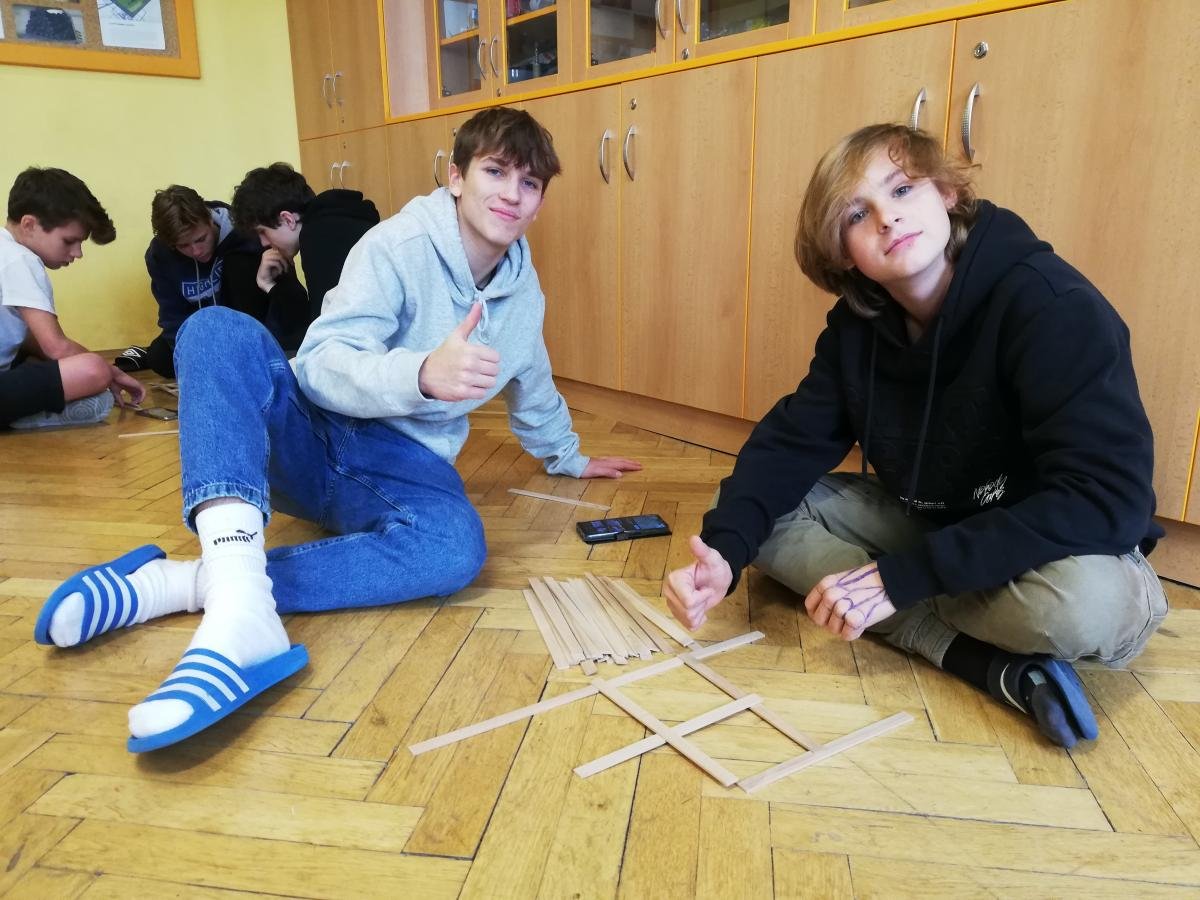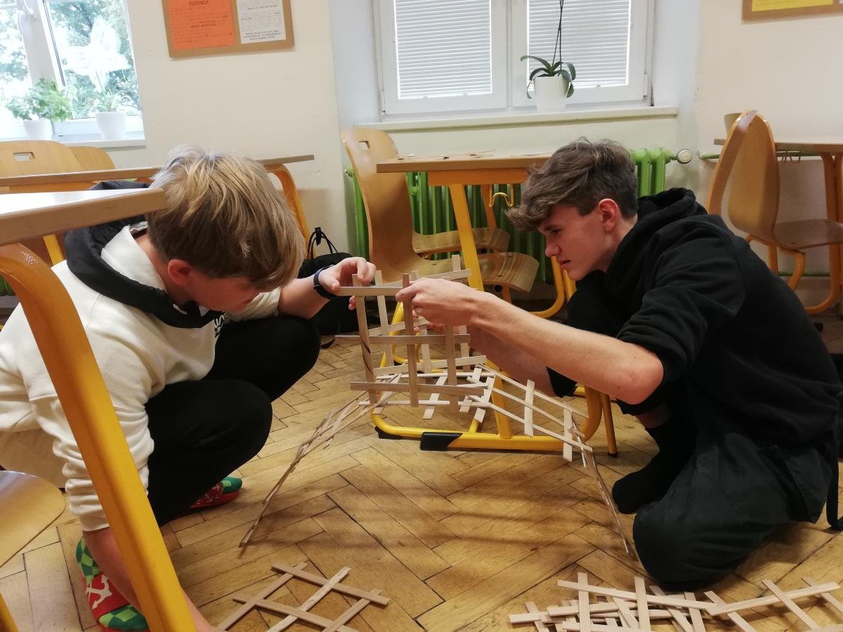 Postavte most bez spojovacího materiálu. Ano, tak zněl úkol pro žáky 9. ročníku v pracovních činnostech. K dispozici totiž měli pouze lamelky z bukového dřeva. Některé skupinky se vrhly do návrhu svých vlastních konstrukcí a některé hledaly inspiraci na internetu. Odolnost konstrukcí se testovala pomocí kilogramového závaží. Pro žáky bylo zajímavé zjištění, že existuje tzv. samonosný most, který navrhl Leonardo da Vinci.