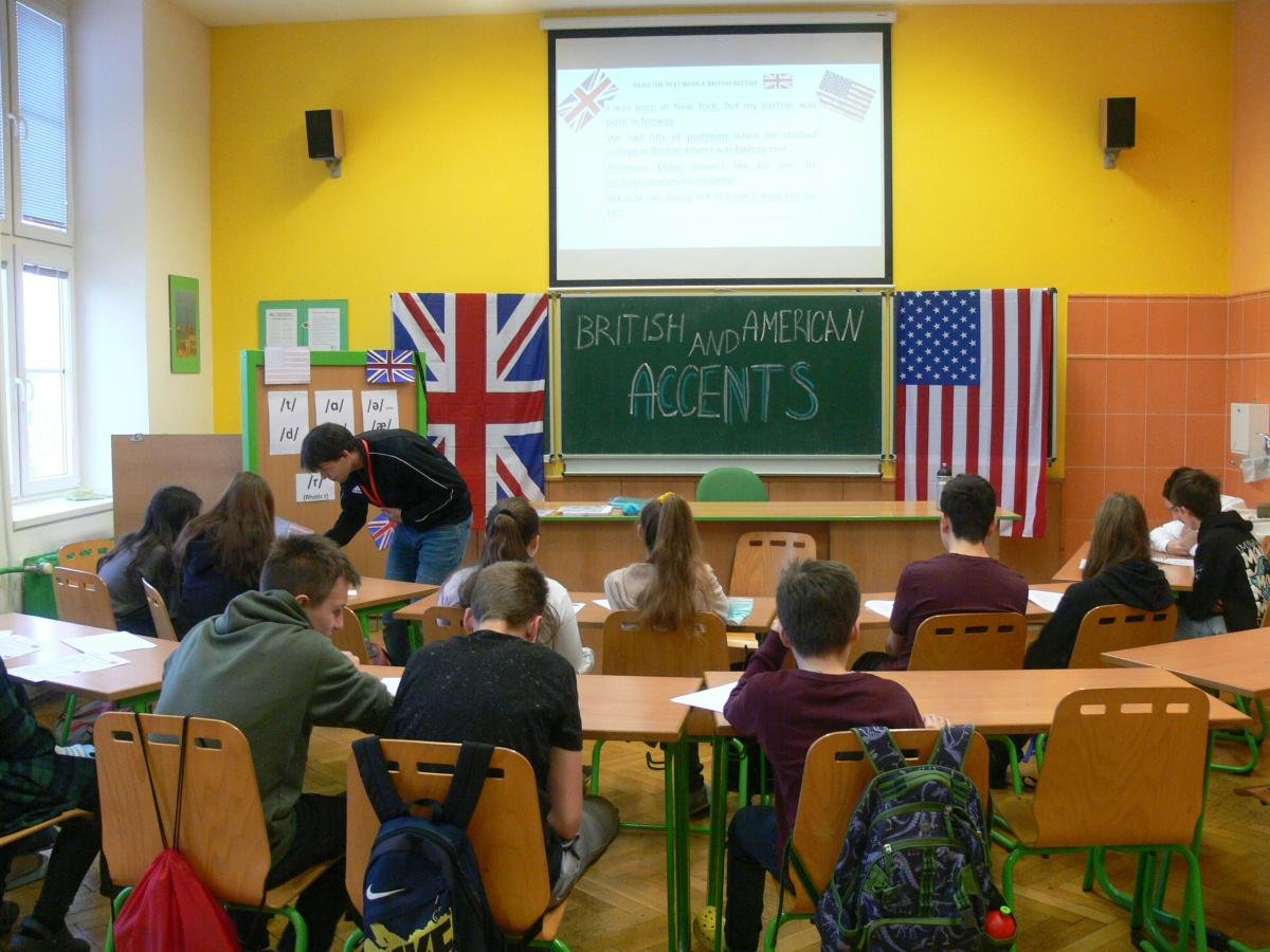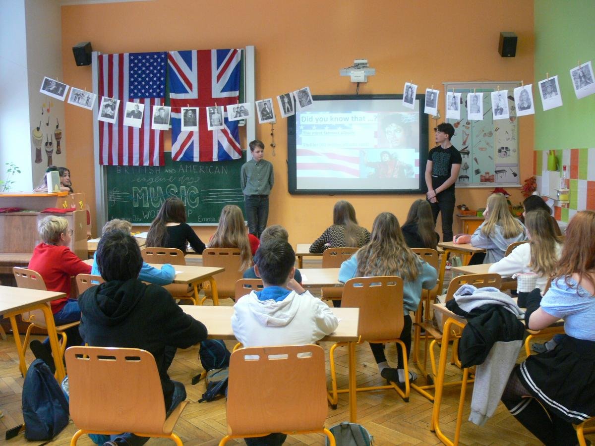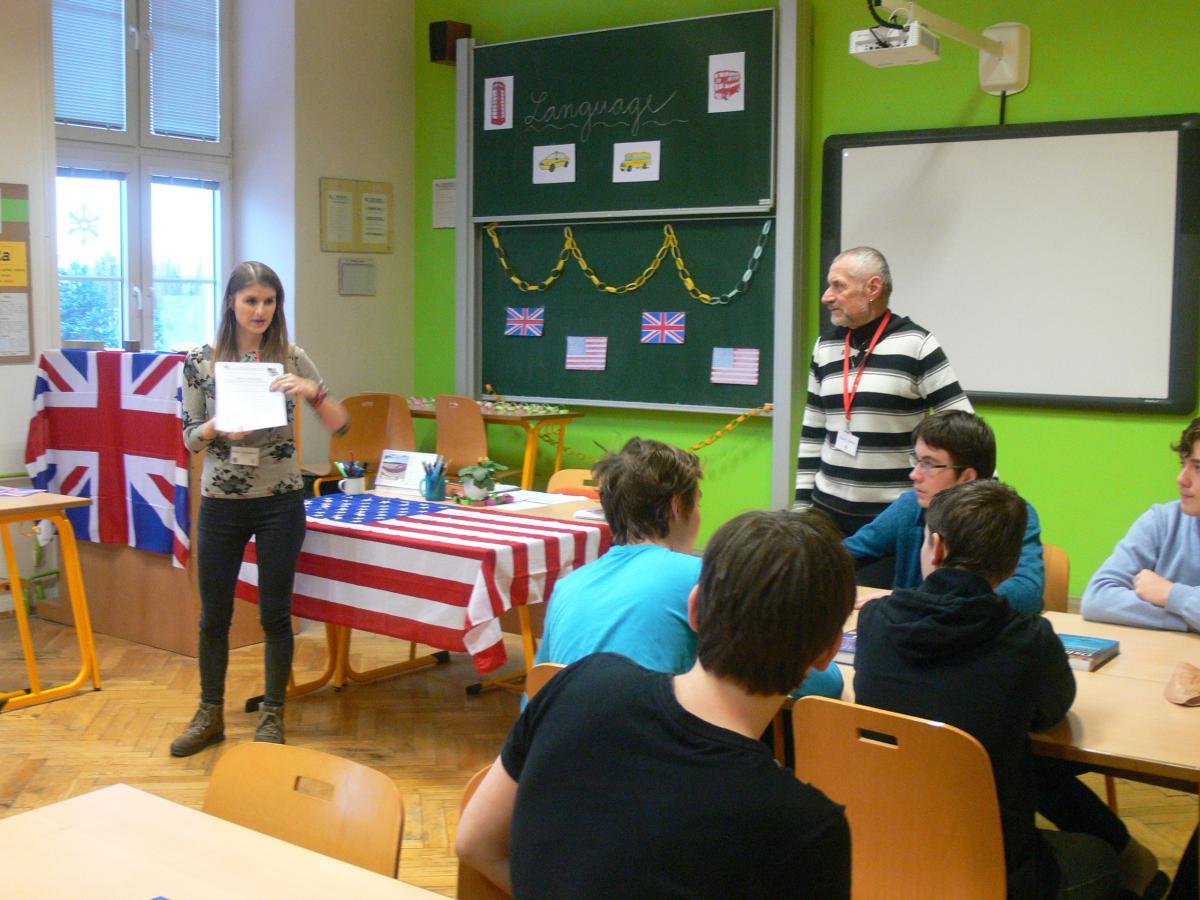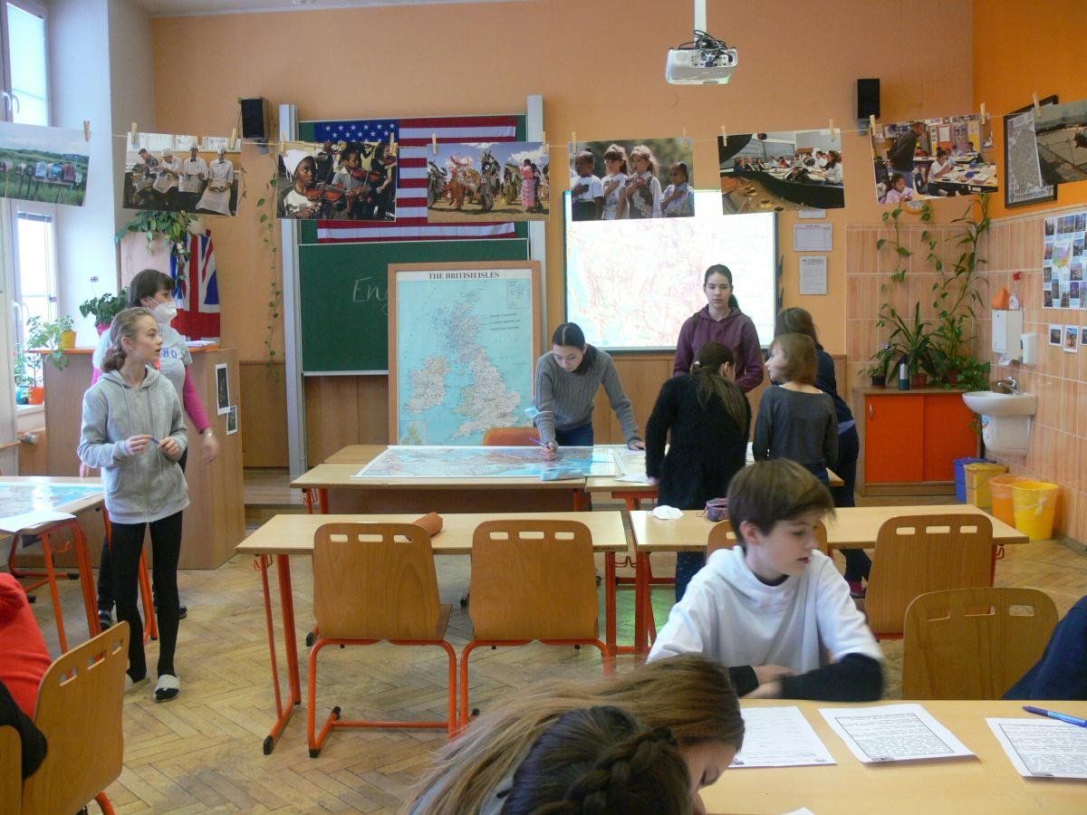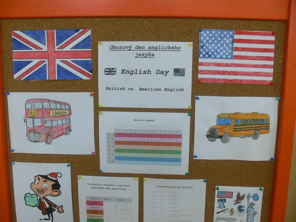 Po dvouleté odmlce jsme opět uspořádali oborový den s angličtinou, který se letos zaměřil na rozdíly mezi britskou a americkou angličtinou a to nejen jazykové, ale i kulturní a geografické. Nebylo toho málo, děti navštívily workshopy, které se věnovaly geografickým, historickým a kulturním rozdílům mezi oběma zeměmi, pracovaly jsme s mapami a obrázky. Dozvěděli jsme se také, v čem se liší slovní zásoba, hláskování nebo akcenty obou jazyků. Nezapomněli jsme ani na sporty, které se historicky pojí k oběma zemím - kluci z devátých tříd Jonas Lojda, Ondra Koupil a Vincent Lehmann se zhostili této dílny na výbornou a seznámili své spolužáky s druhy sportů, názvoslovím nebo sportovního vybavením. Šikovní osmáci Adélka Konrádová, Emča Zaťková spolu s Adamem Vrajem a Honzou Růčkou nám představili významné interprety britské a americké hudební scény, ve své dílně si připravili povídání o skupině One Direction a zpěvákovi Michaelu Jacksonovi. Podívali jsme se také do historie obou zemí spolu s Kahootem a ve čtenářské dílně jsme se ponořili do významných děl amerických i britských autorů, kterých lze v naší jazykové knihovničce nalézt celou stovku. První krůčky v angličtině dělali také naši nejmenší, seznámili jsme se s prvními slovíčky, číslicemi, zatančili jsme si, zahráli spousty her, a dokonce zahráli i divadlo. Pro starší děti z prvního stupně byly připraveny kvízové hry, zopakovali si spousty užitečných slovíček a nemohl chybět tanec, hry a zpěv. Celou školu jsme si pěkně vyzdobili vlaječkami, dekoracemi, řetězy a drobnými symboly a den s angličtinou jsme si pěkně užili. Už se těšíme na příští rok. A o čem bude??? No přece o ... Nechte se překvapit jako každý rok!